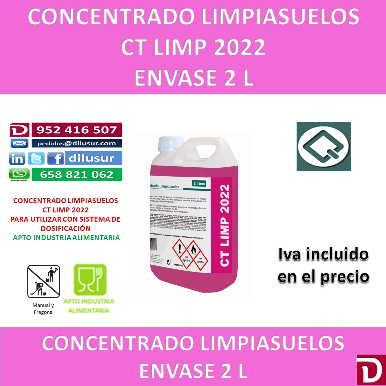 Concentrado limpiasuelos para sistemas de disolución, apto para todo tipo de suelos, Apto industria alimentaria, Envase 2 L. Iva incluido en el precio