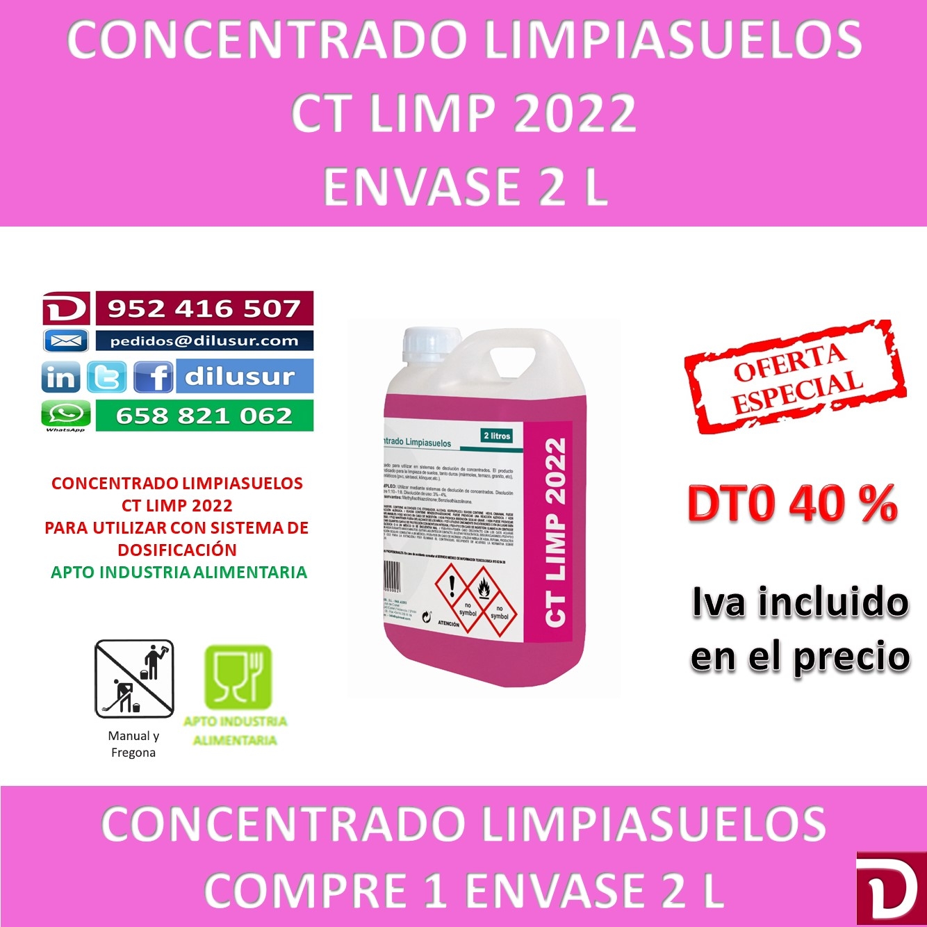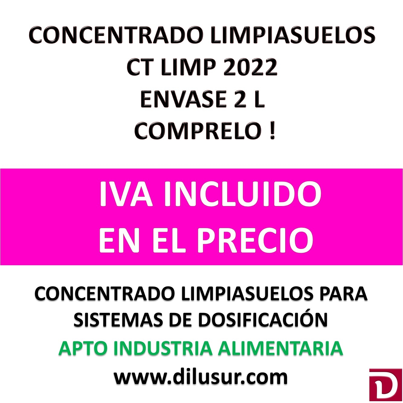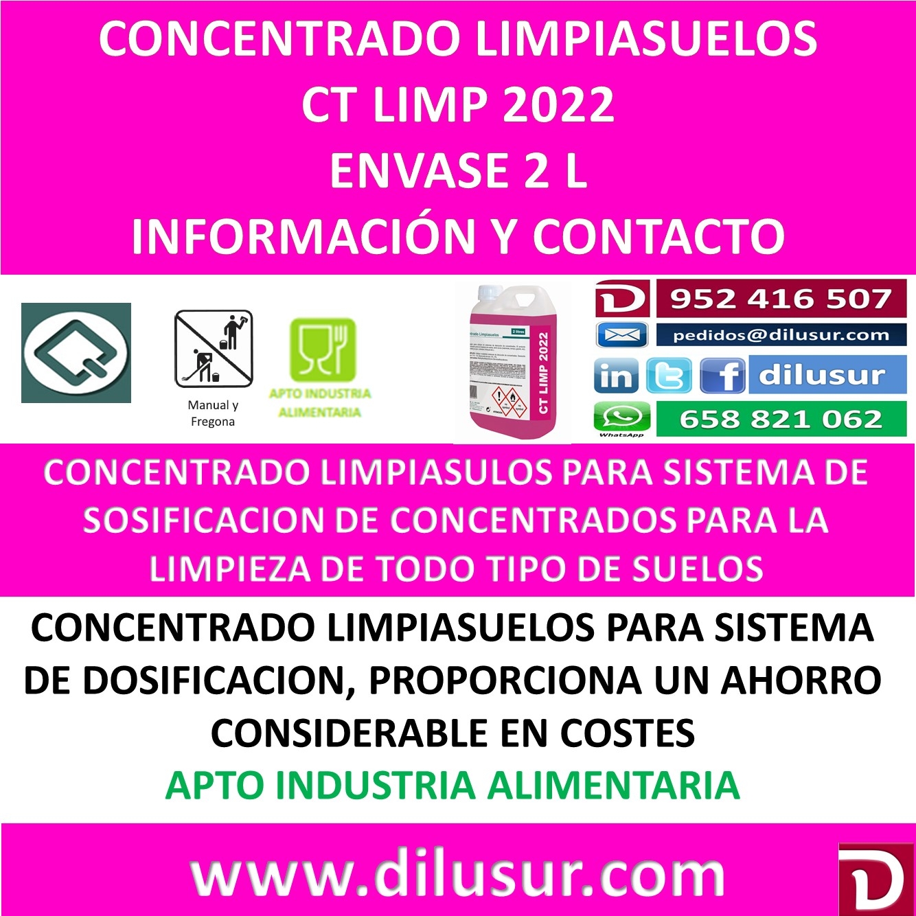 Concentrado limpiasuelos para sistemas de disolución, el producto resultante es apto para la limpieza de cualquier tipo de suelo tanto duros como sintéticos. Apto industria alimentaria.