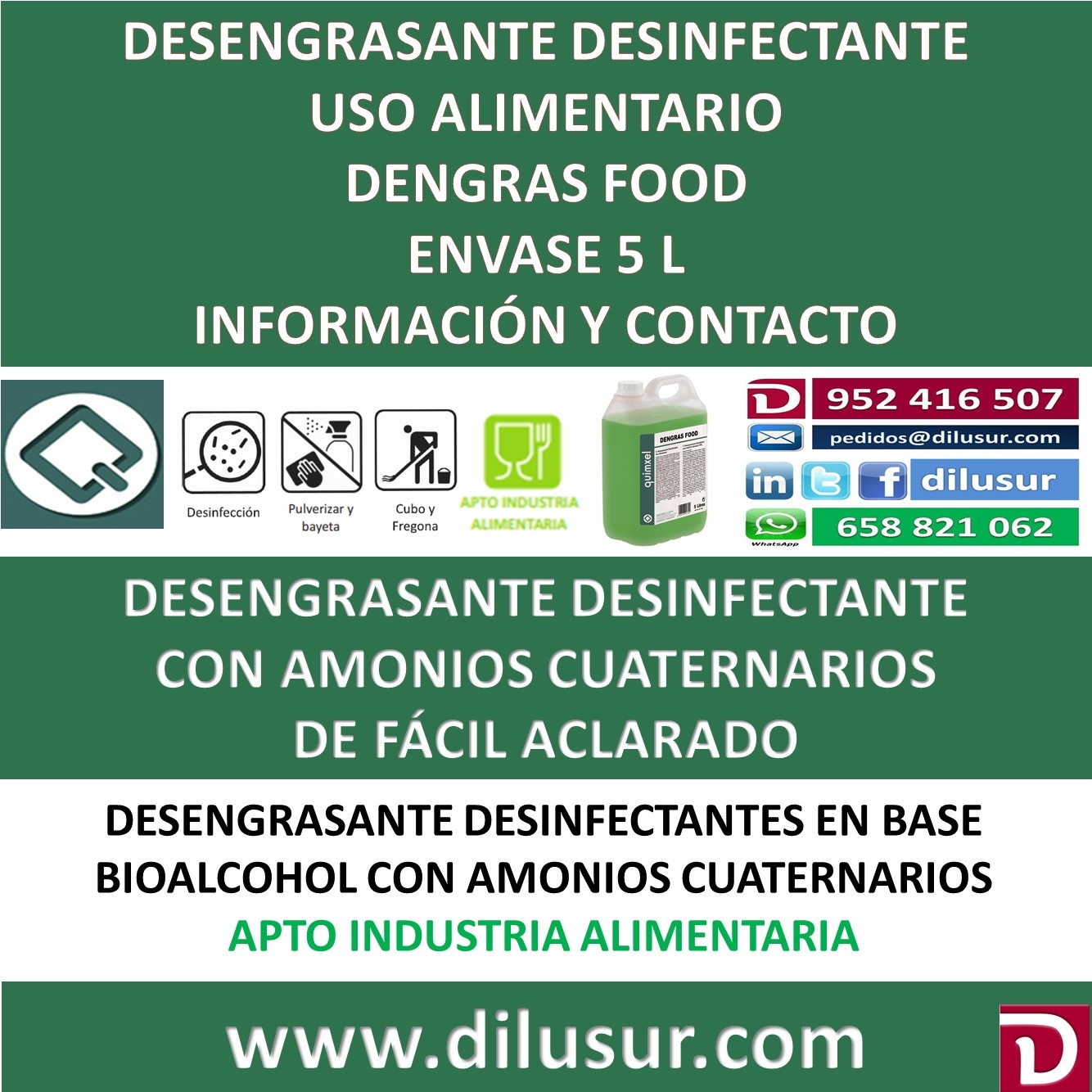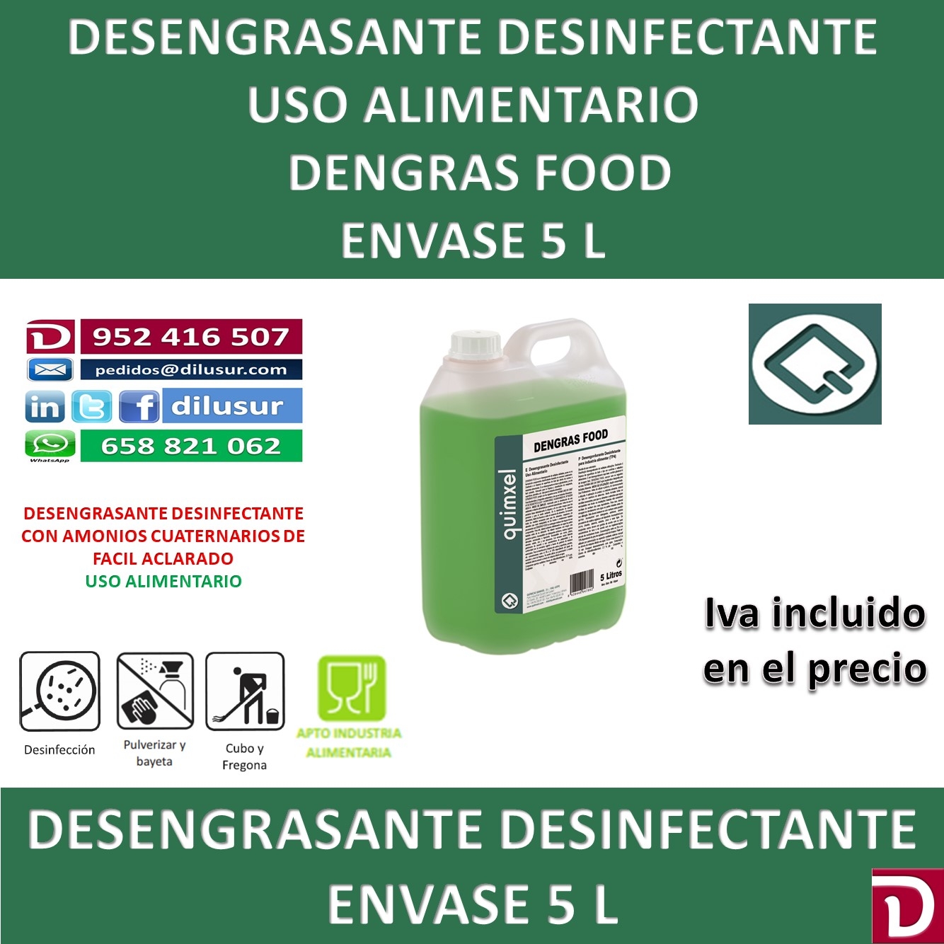 Desengrasante desinfectante para uso alimentario, de multiples utilidades, con amonios cuaternarios. Está destinado a la limpieza de todo tipo de superficies en las cocinas e industrias alimentarias. A base de glioalcoholes es de fácil aclarado.