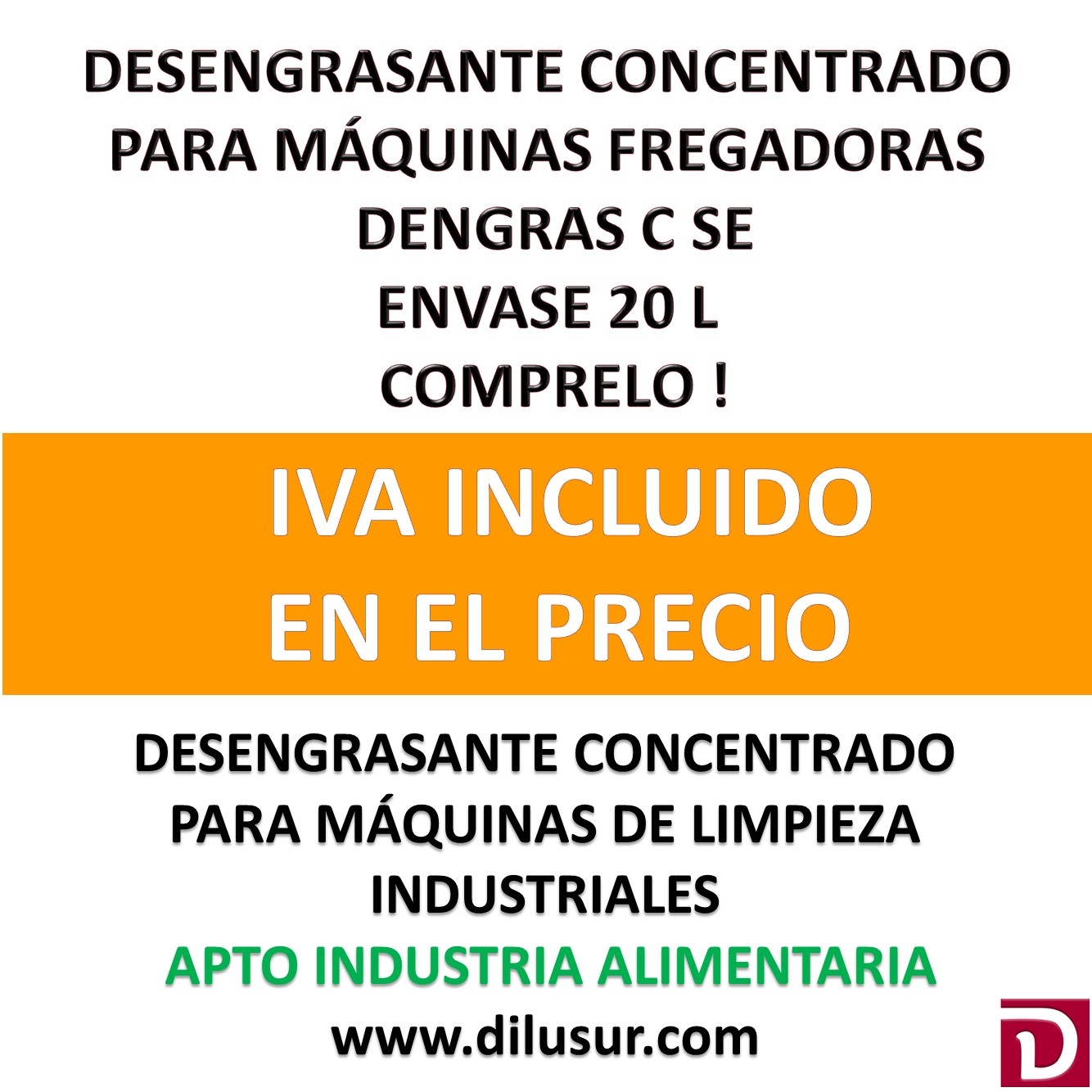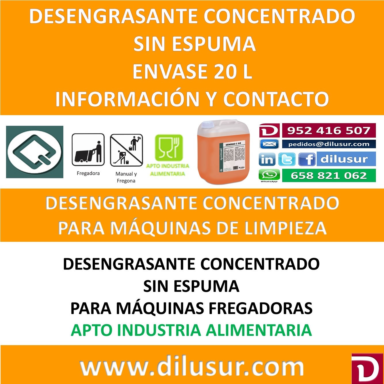 Desengrasante concentrado sin espuma, para grasas y superficies muy incrustadas, no inflamable. Indicado para máquinas de limpieza y fregadoras automáticas por su carencia de espuma. Envase 20 L. Iva incluido