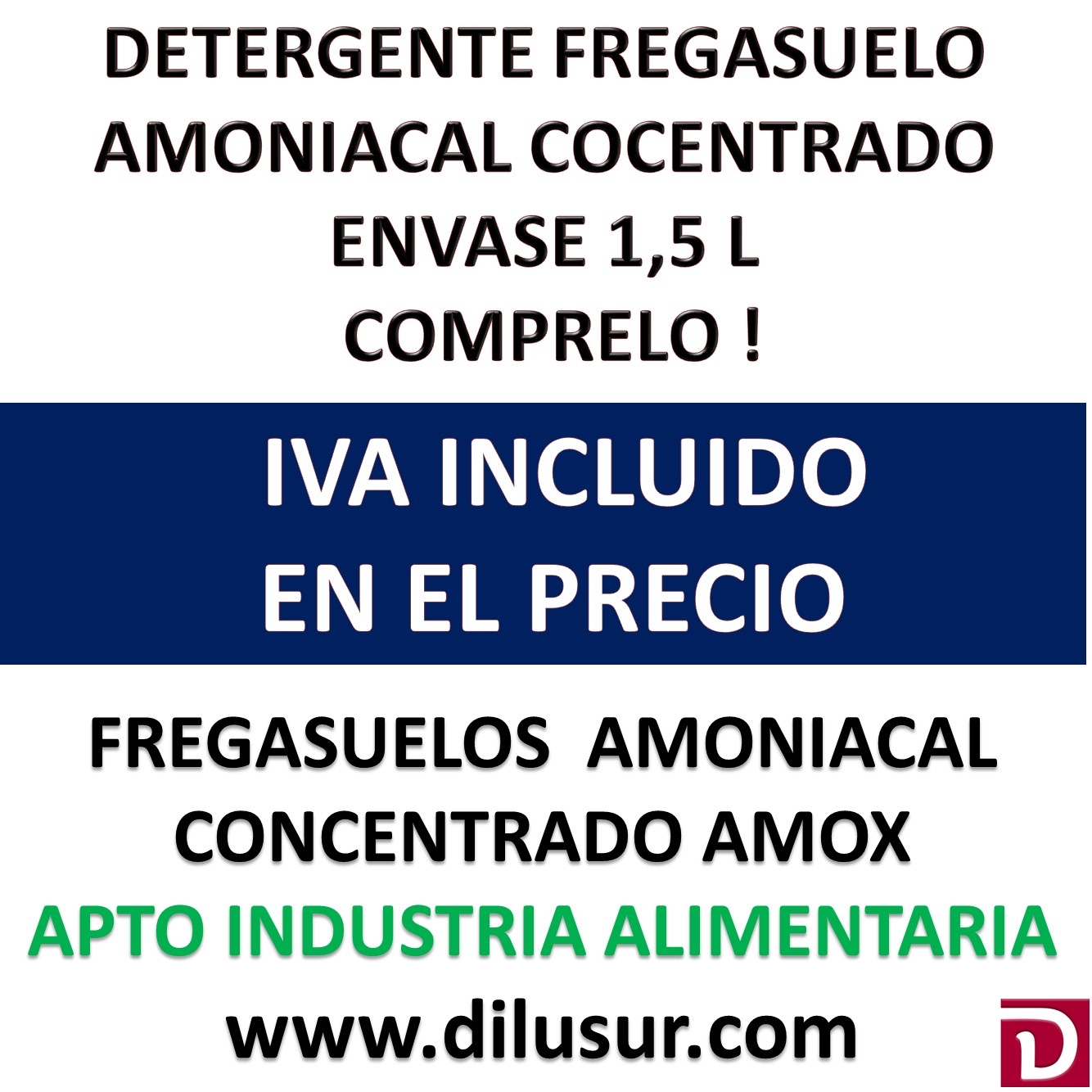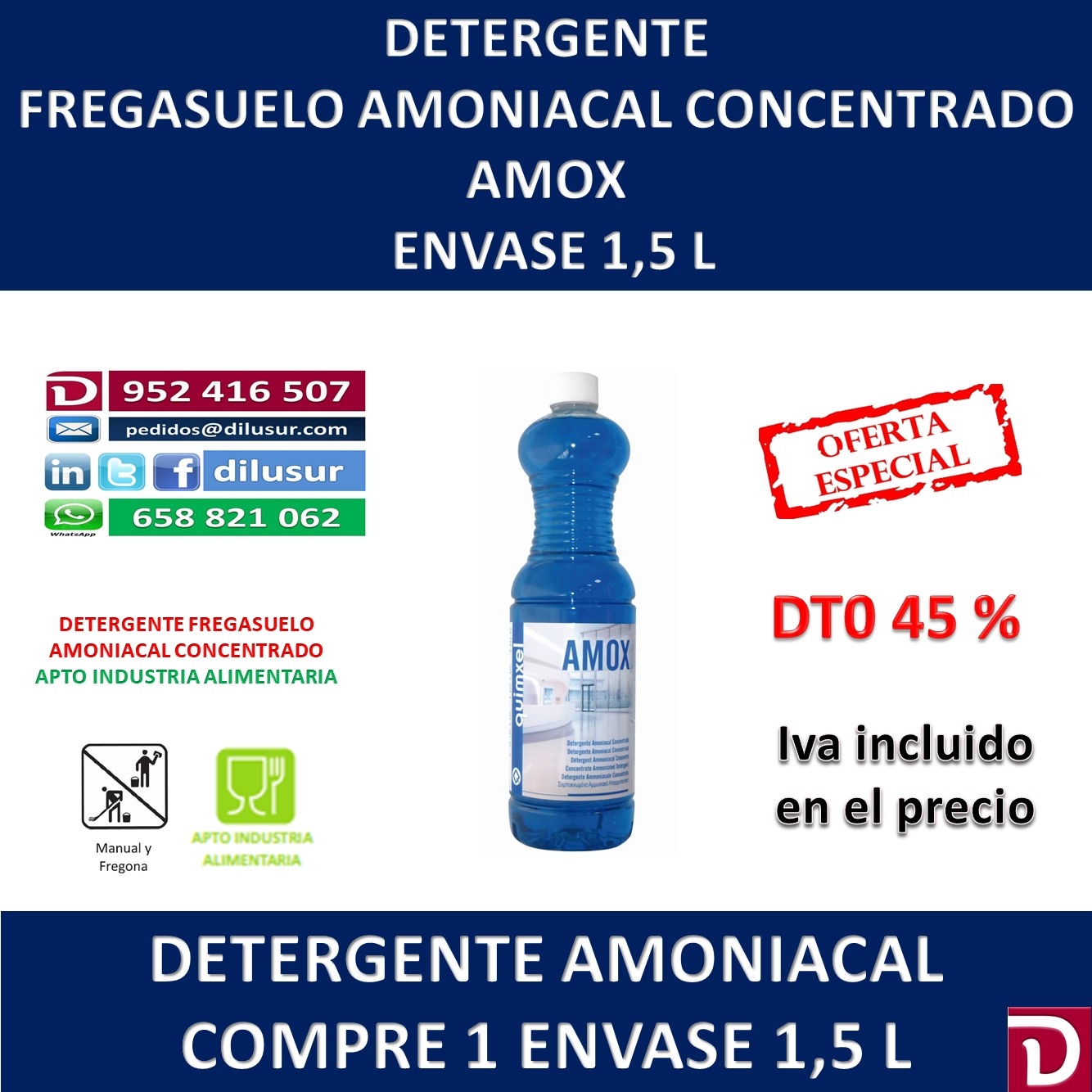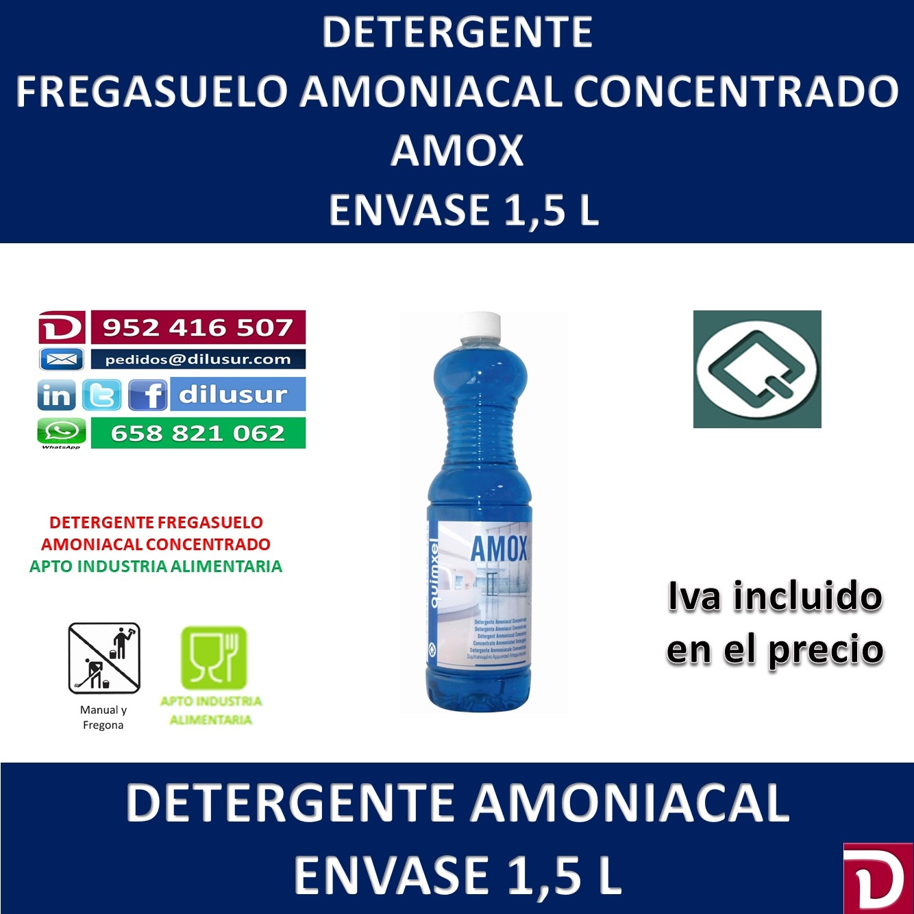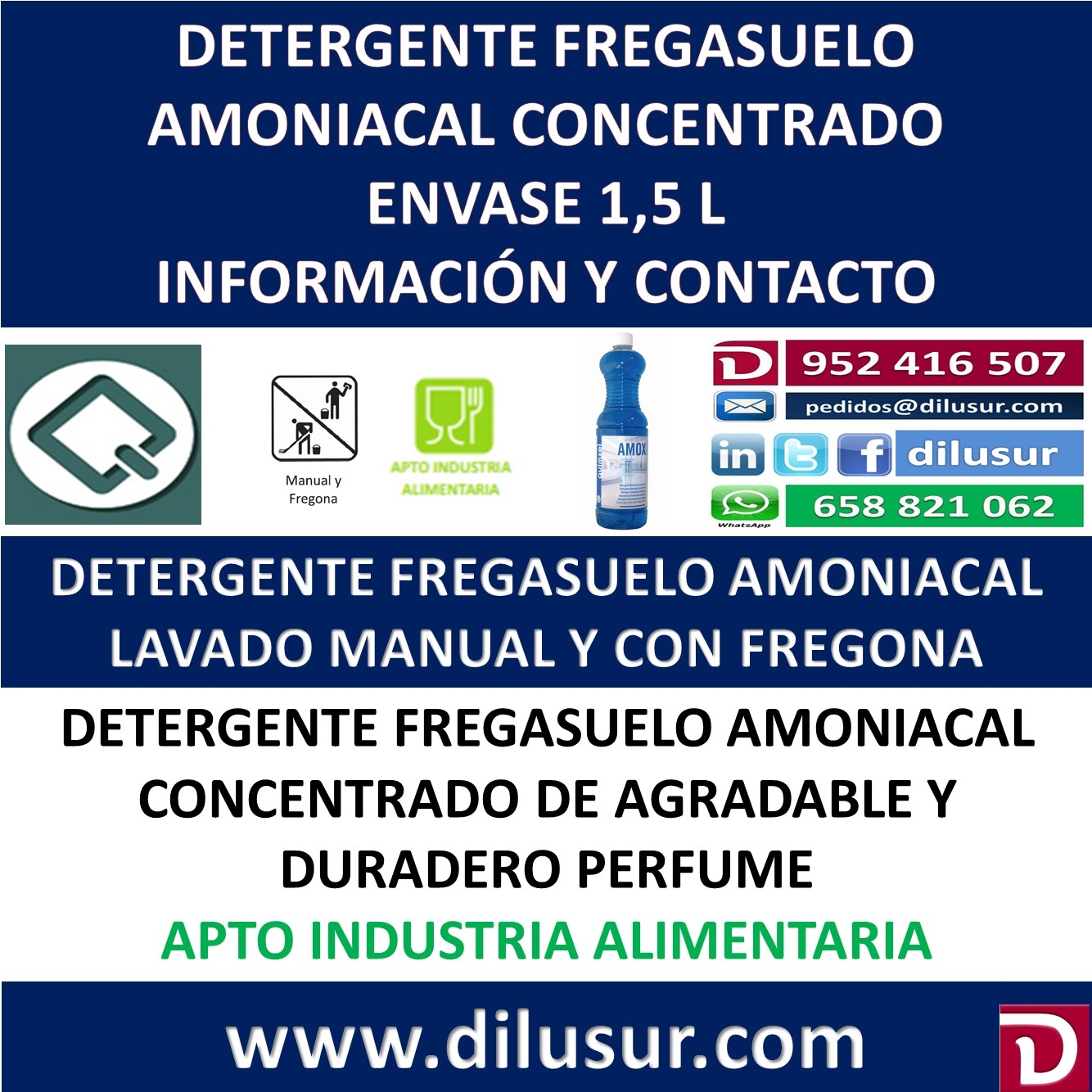 Detergente amoniacal concentrado apto para todo tipo de suelos, de alto poder desengrasante y agradable perfume, recomendado en lugares donde se necesite una profunda limpieza. Apto para la industria alimentaria. Envase 1,5 L. Iva incluido