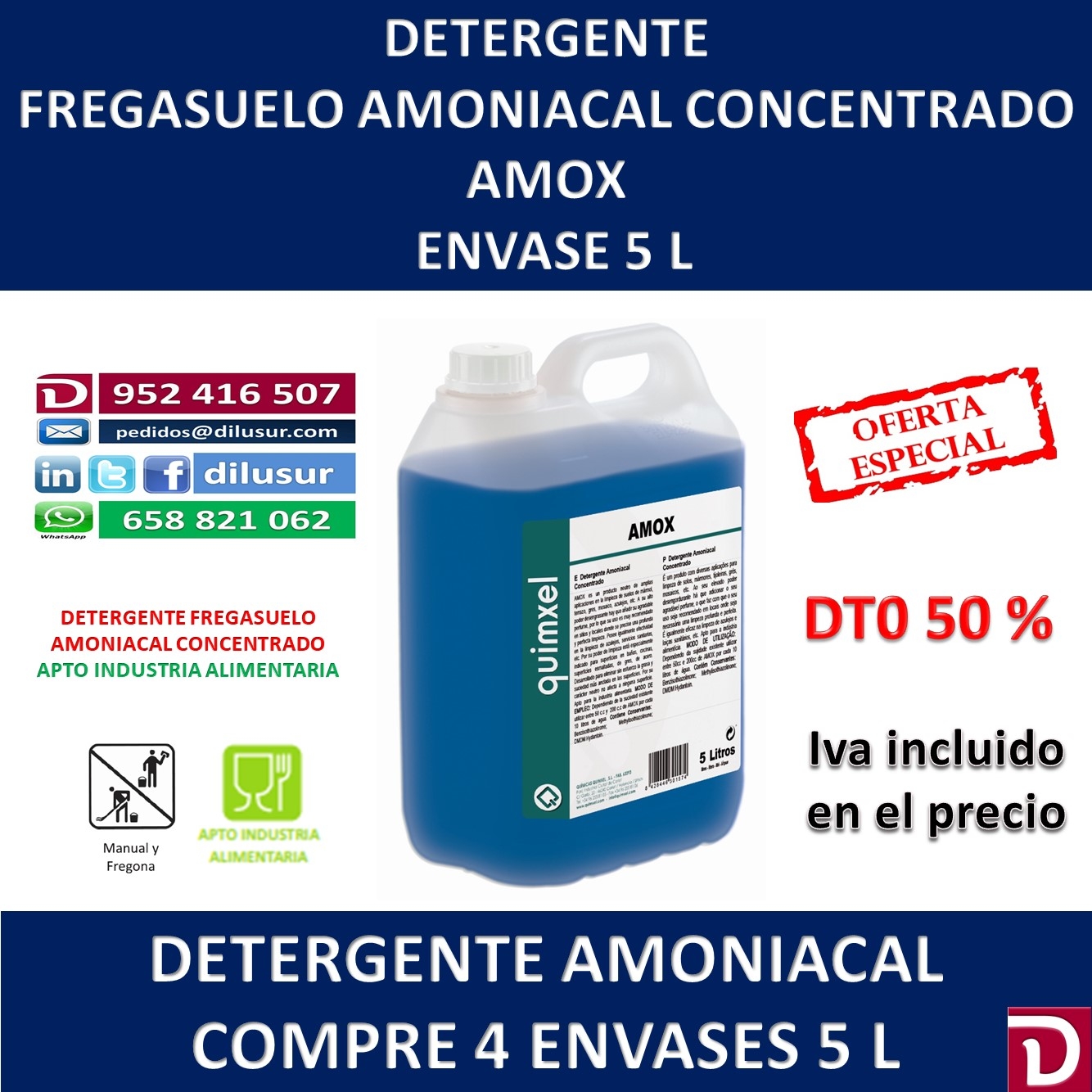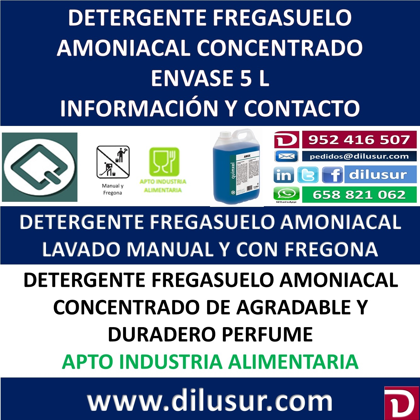 Detergente amoniacal concentrado apto para todo tipo de suelos, de alto poder desengrasante y agradable perfume, recomendado en lugares donde se necesite una profunda limpieza. Apto para la industria alimentaria. Envase 5 L. Iva incluido