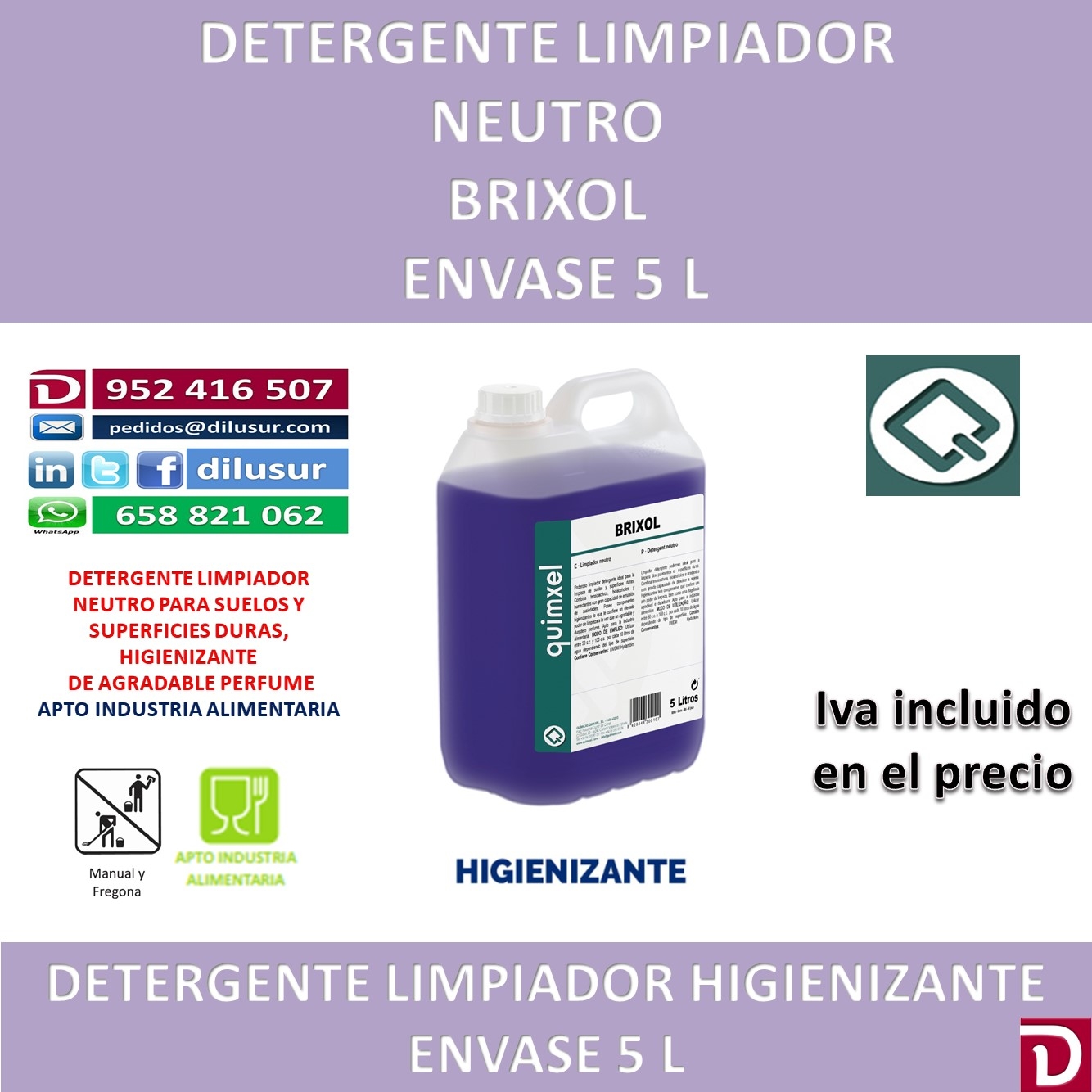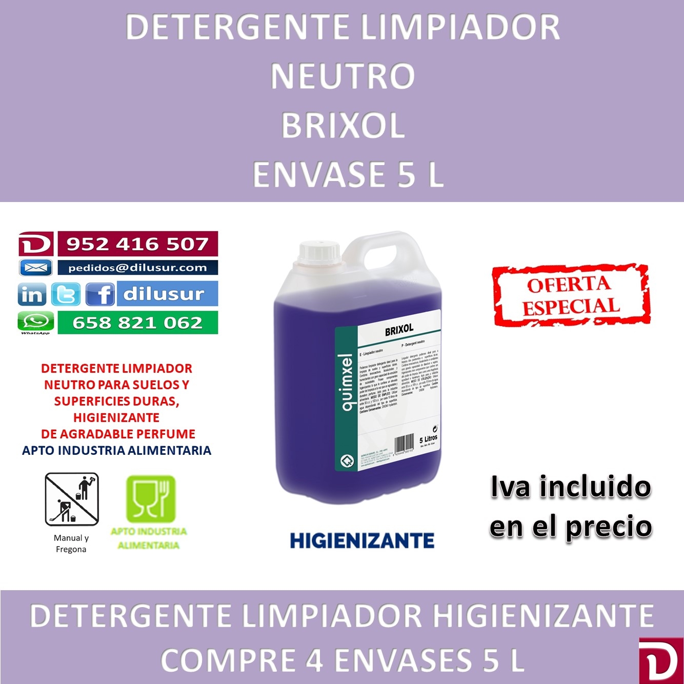 Limpiador detergente neutro para suelso y supeficies duras , higienizante y de gran capacidad de limpieza, ligeramente perfumado. Apto para la industria alimentaria. Envase 5 L, Iva incluido