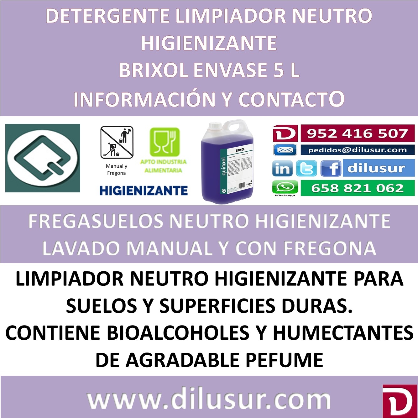 Limpiador neutro con detergente para la limpieza de suelos y superficies duras, con tensoactivos, bioalcoholes y humentactantes, de gran capacidad de emulsion de grasas y suciedades. Higienizante, que le confiere un elevado poder de limpieza, a la vez que un agradable y duradero perfume. Apto para la industria alimentaria.