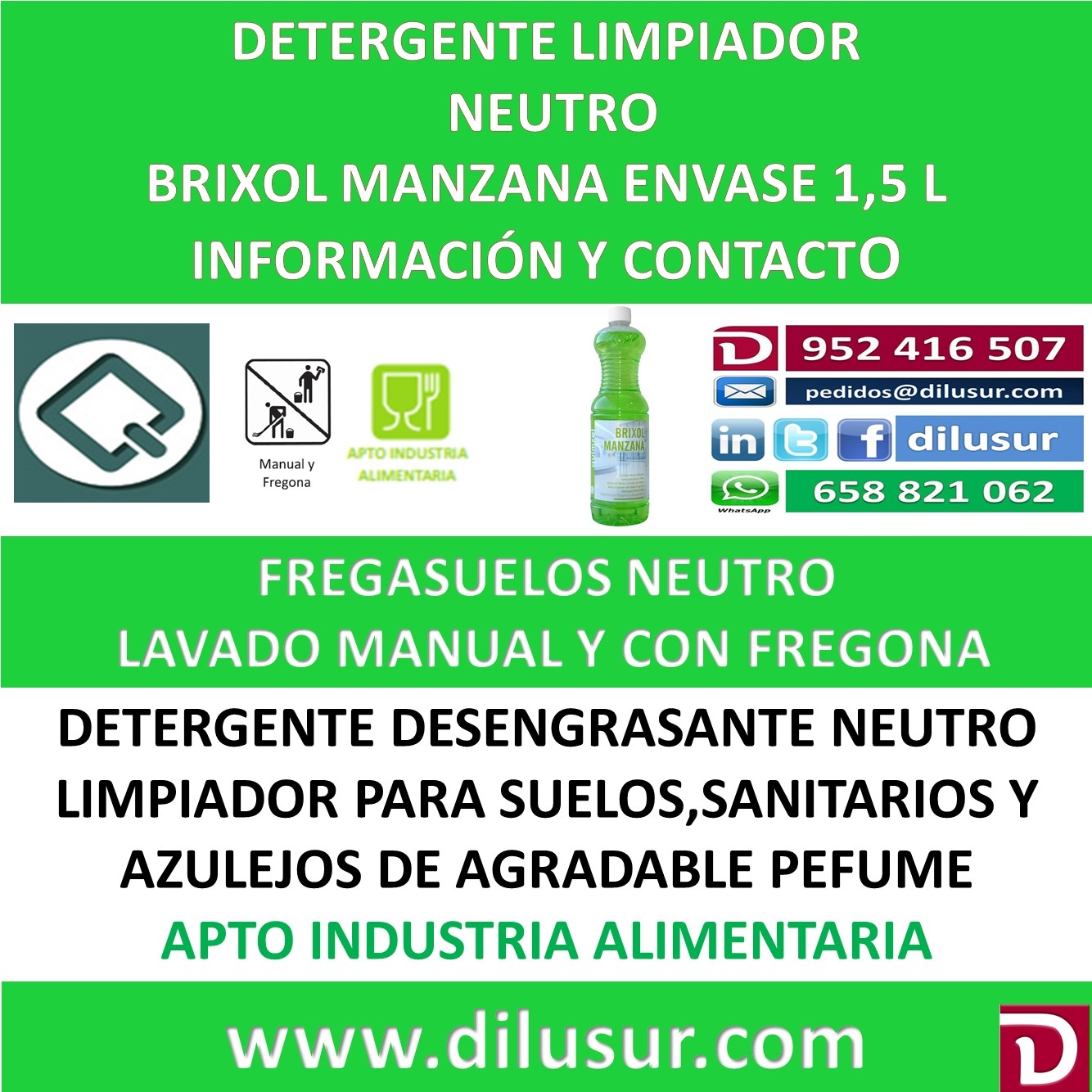 Detergente desengrasante neutro para todo tipo de suelos, sanitarios, y azulejos de agradable aroma a manzana, para lugares donde se precise una profunda limpieza. Apto para industria alimentaria. Envase de 1,5 L. Iva incluido