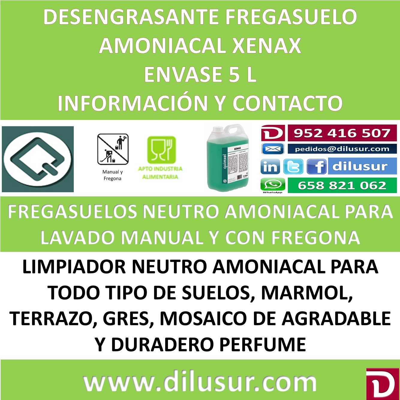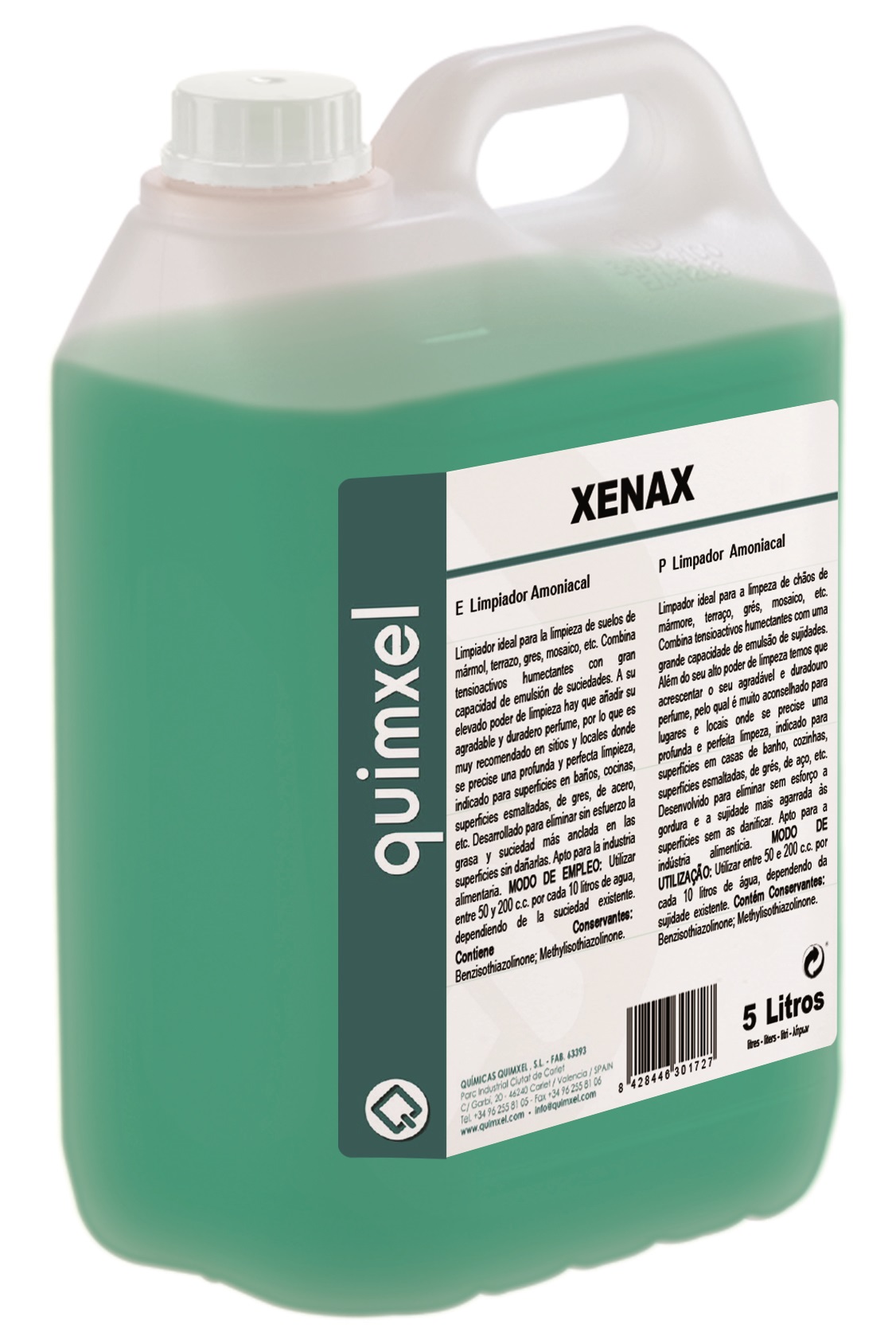 Fregasuelo amoniacal neutro Xenax, para todo tipo de suelos, marmol, terrazo, gres y mosaico, etc. De alto poder de limpieza y agradable perfume. Envase 5 L