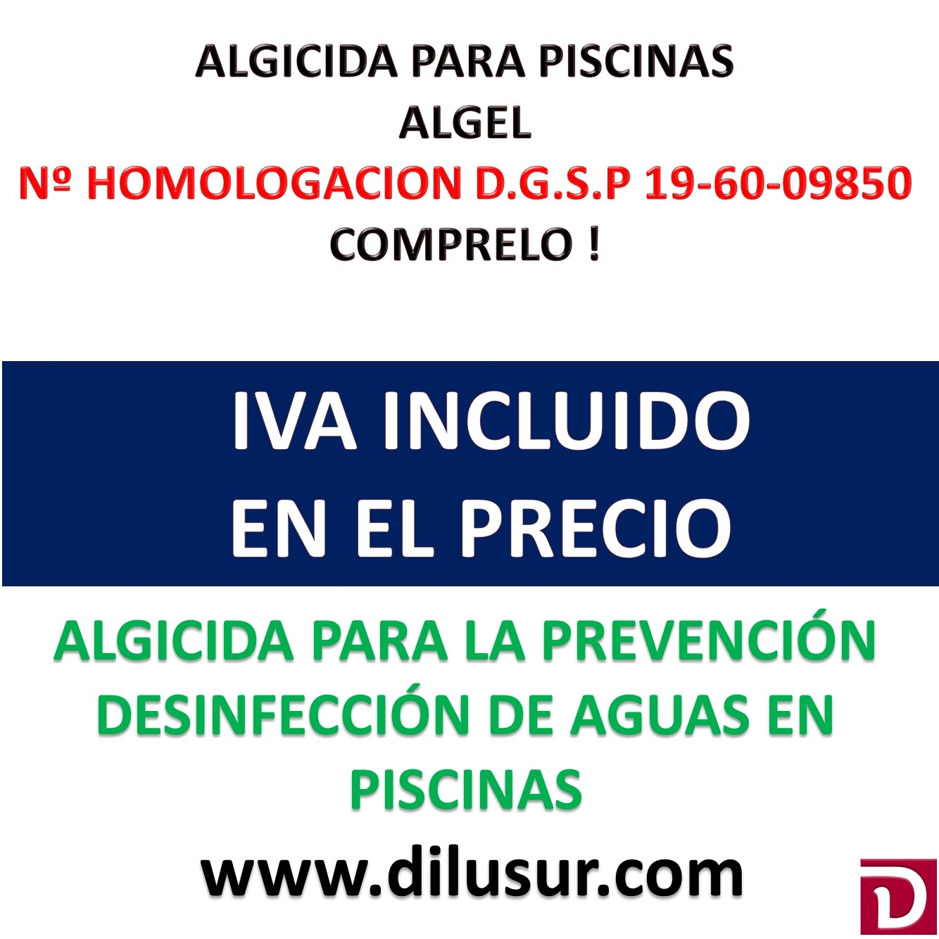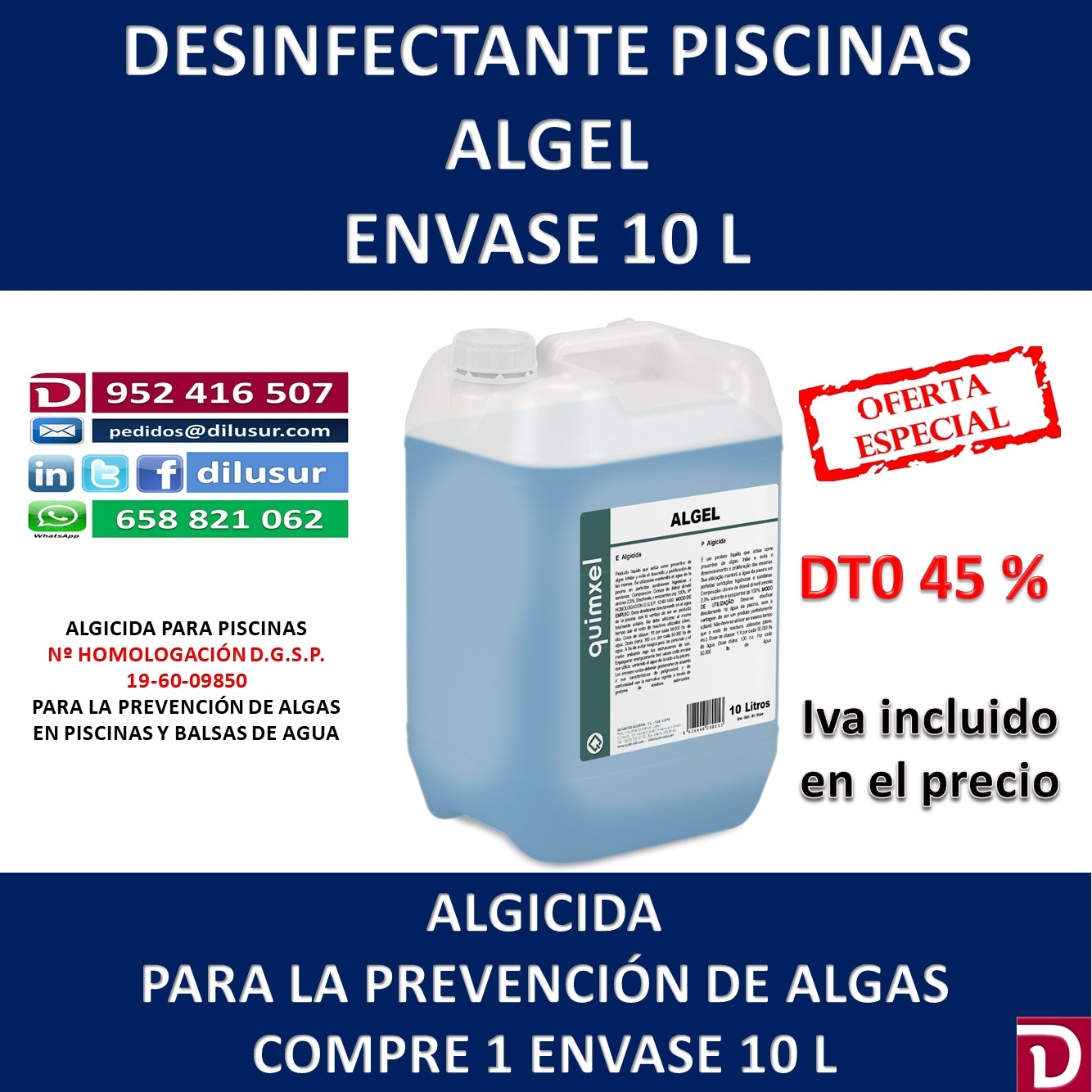 Algicida para piscinas que actúa como preventivo de algas. Su utilización mantendrá el agua de la piscina en perfectas condiciones higiénicas y sanitarias. Homologado por la D.G.S.P 19-60-09850, Envase 10 L. Iva incluido