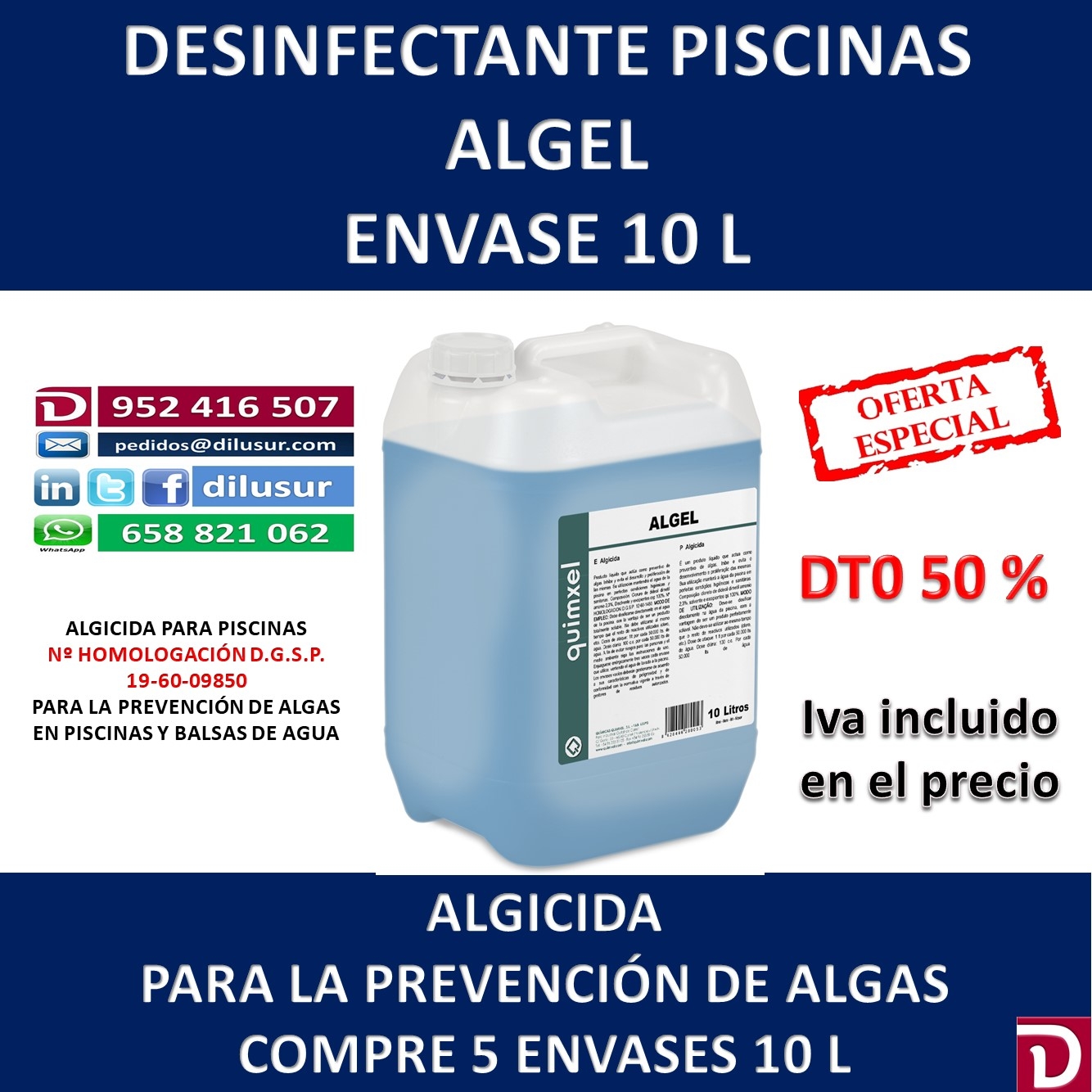 Algicida para piscinas que actúa como preventivo de algas. Inhibe y evita el desarrollo y proliferación de las mismas. Su utilización mantendrá el agua de la piscina en perfectas condiciones higiénicas y sanitarias. Homologado por la D.G.S.P 19-60-09850.