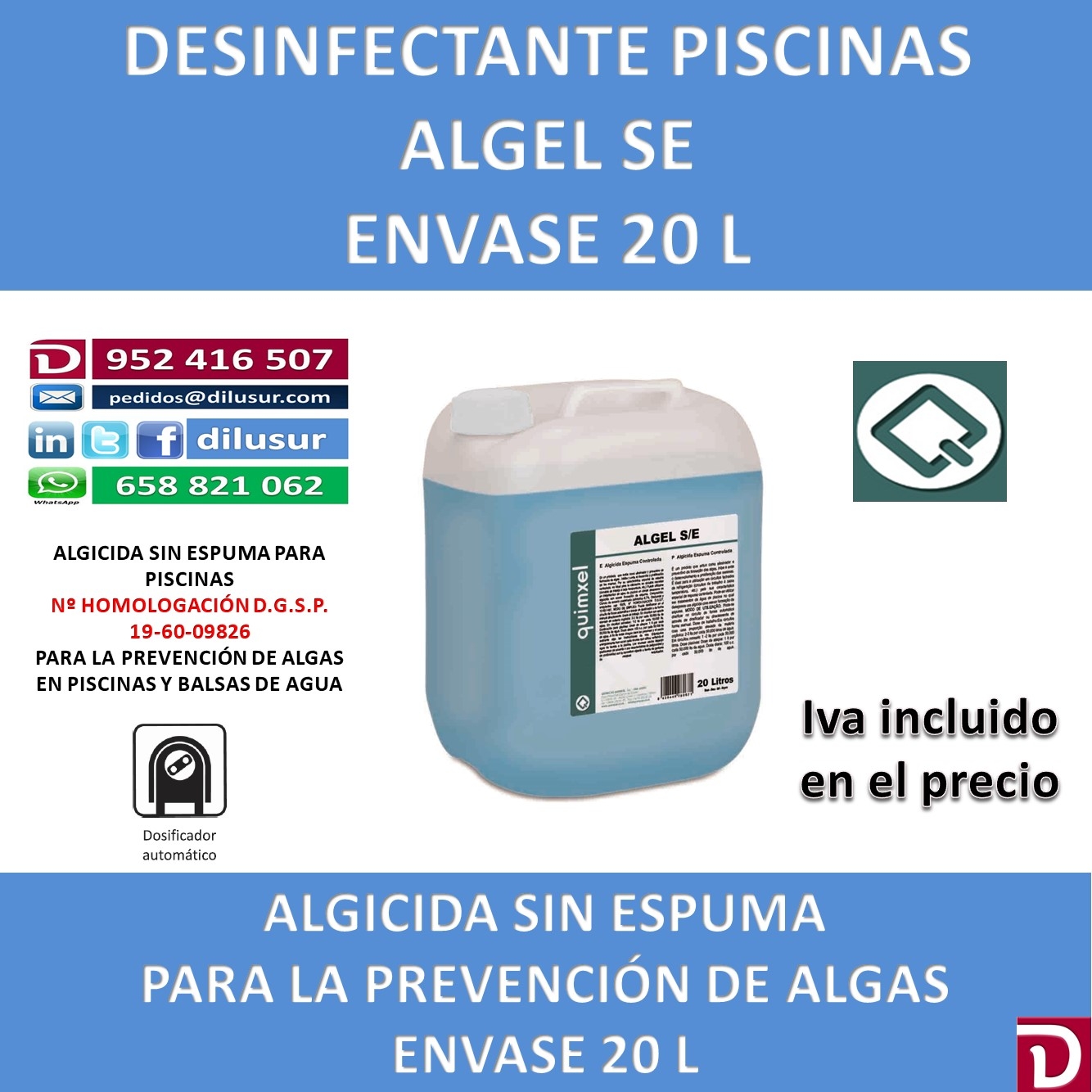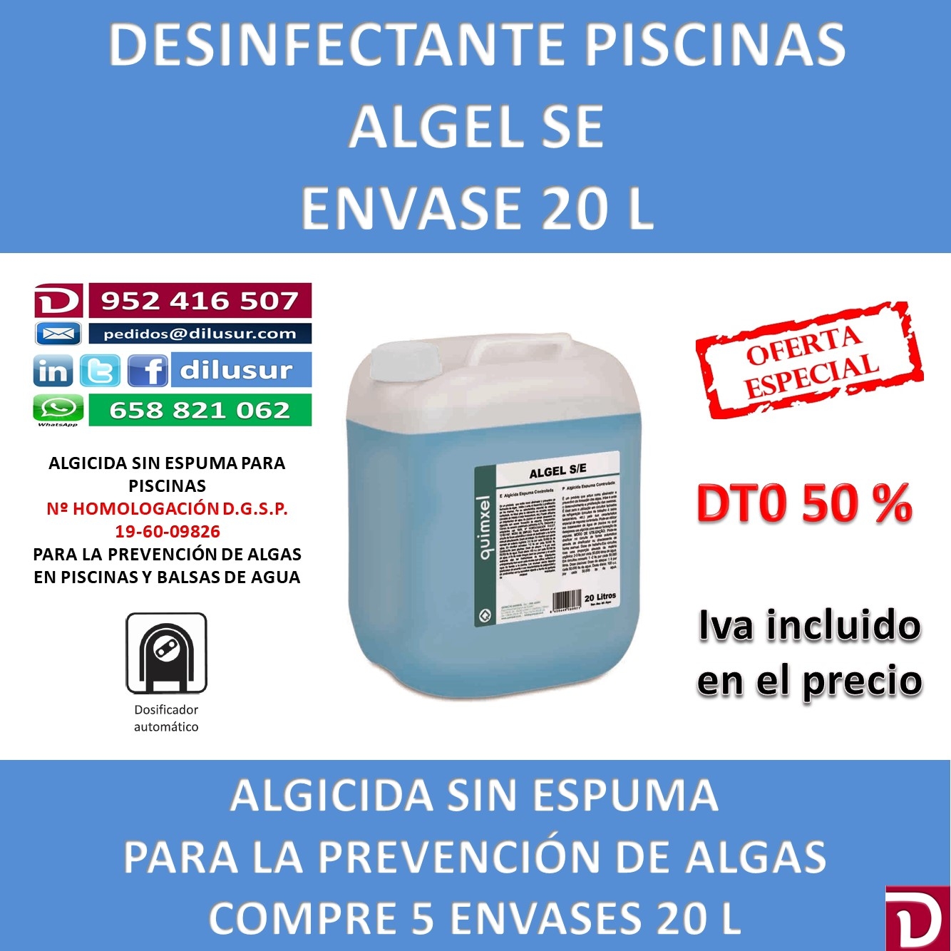 Dosis diaria: 100 c.c por cada 50.000 litros de agua