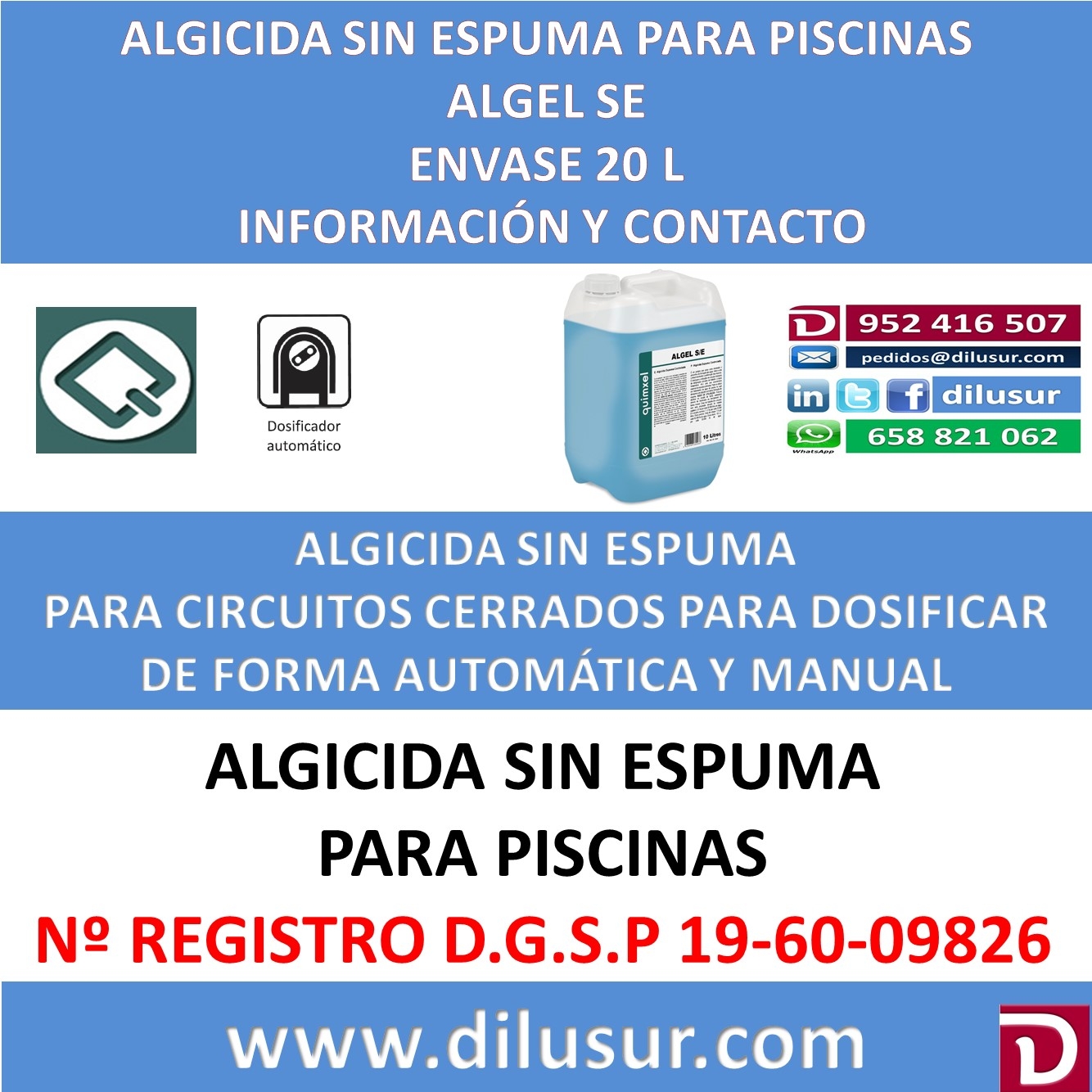 Algicida sin espuma concentrado, el cual actúa como eliminador y preventivo de formación de algas. Inhibe y evita el desarrollo y proliferación de las mismas. Es adecuado para su utilización manual y en circuitos cerrados. (incluso a baja temperatura).