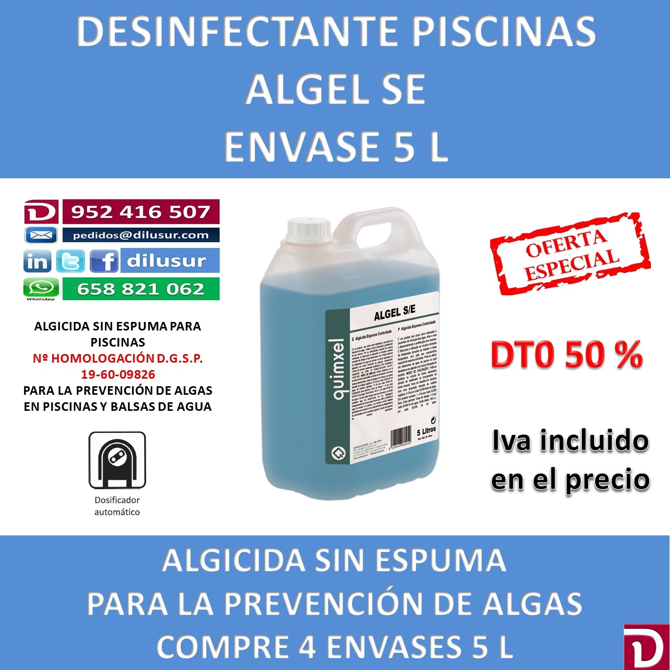 Dosis diaria: 100 c.c por cada 50.000 litros de agua