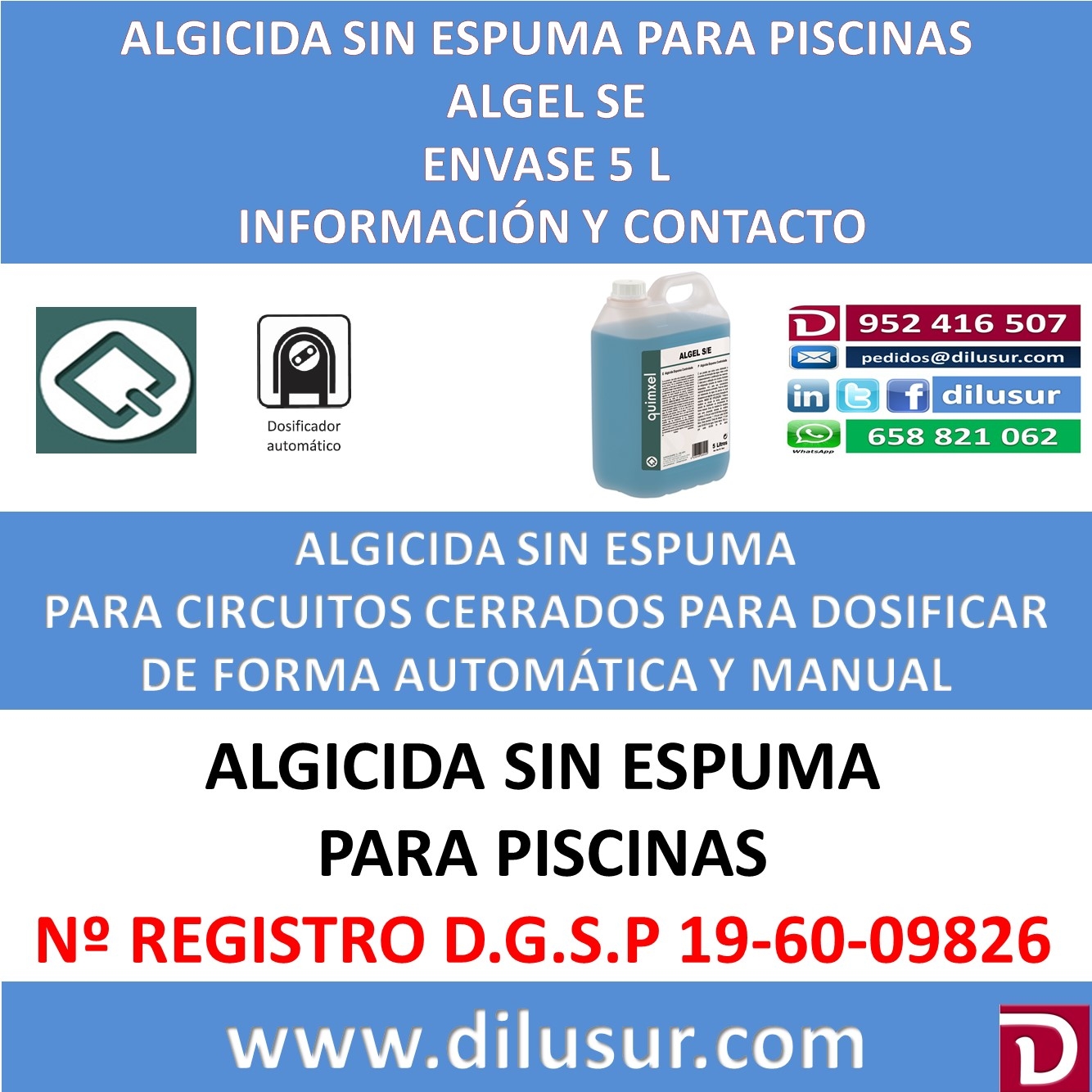 Algicida sin espuma concentrado, el cual actúa como eliminador y preventivo de formación de algas. Inhibe y evita el desarrollo y proliferación de las mismas. Es adecuado para su utilización manual y en circuitos cerrados. (incluso a baja temperatura).