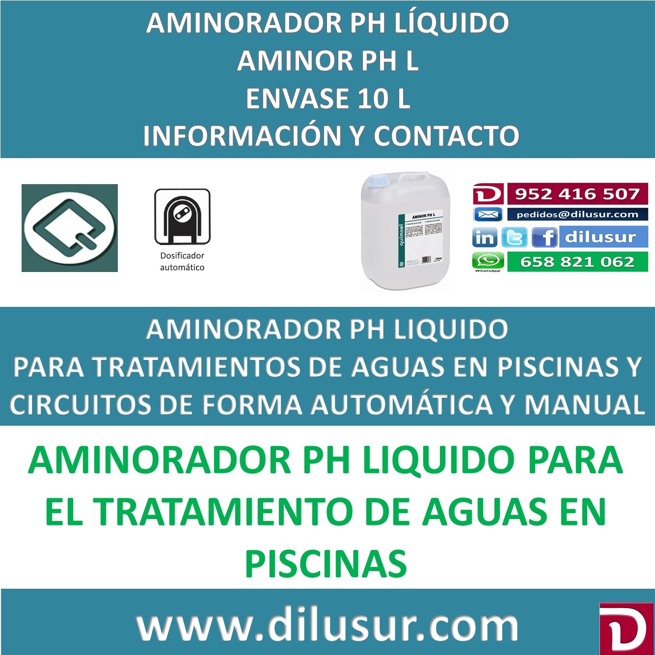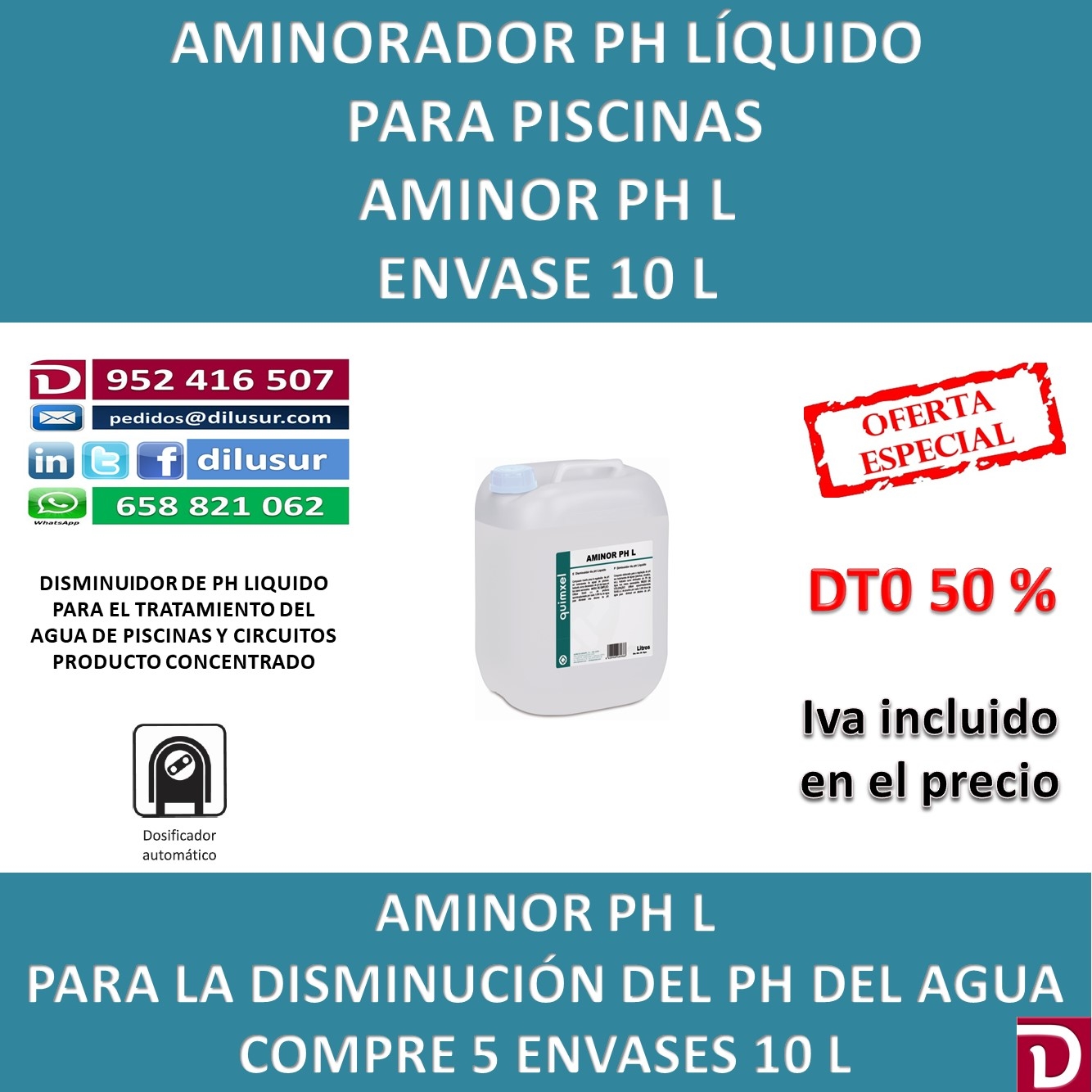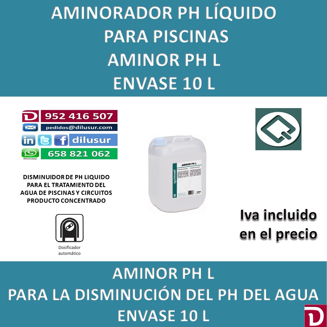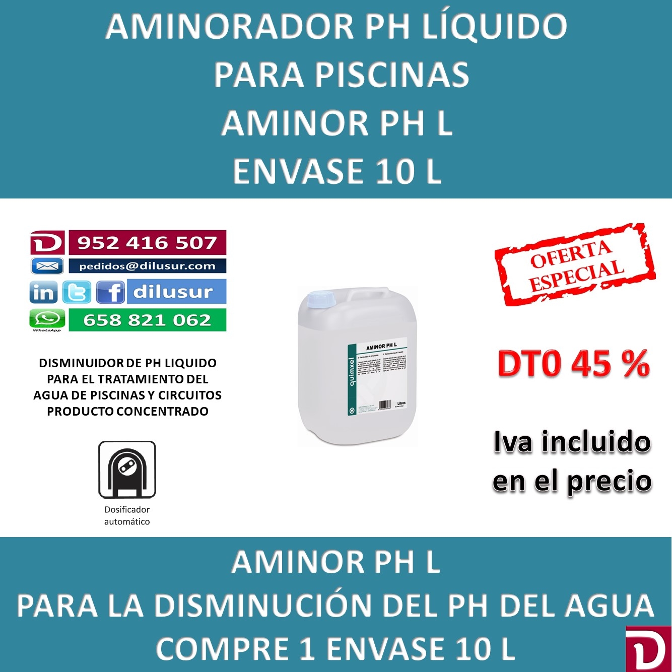 Disminuidor de Ph líquido para tratamientos de aguas en piscinas, circuitos etc. Indicado como disminuidor del Ph del agua en casos necesarios.
