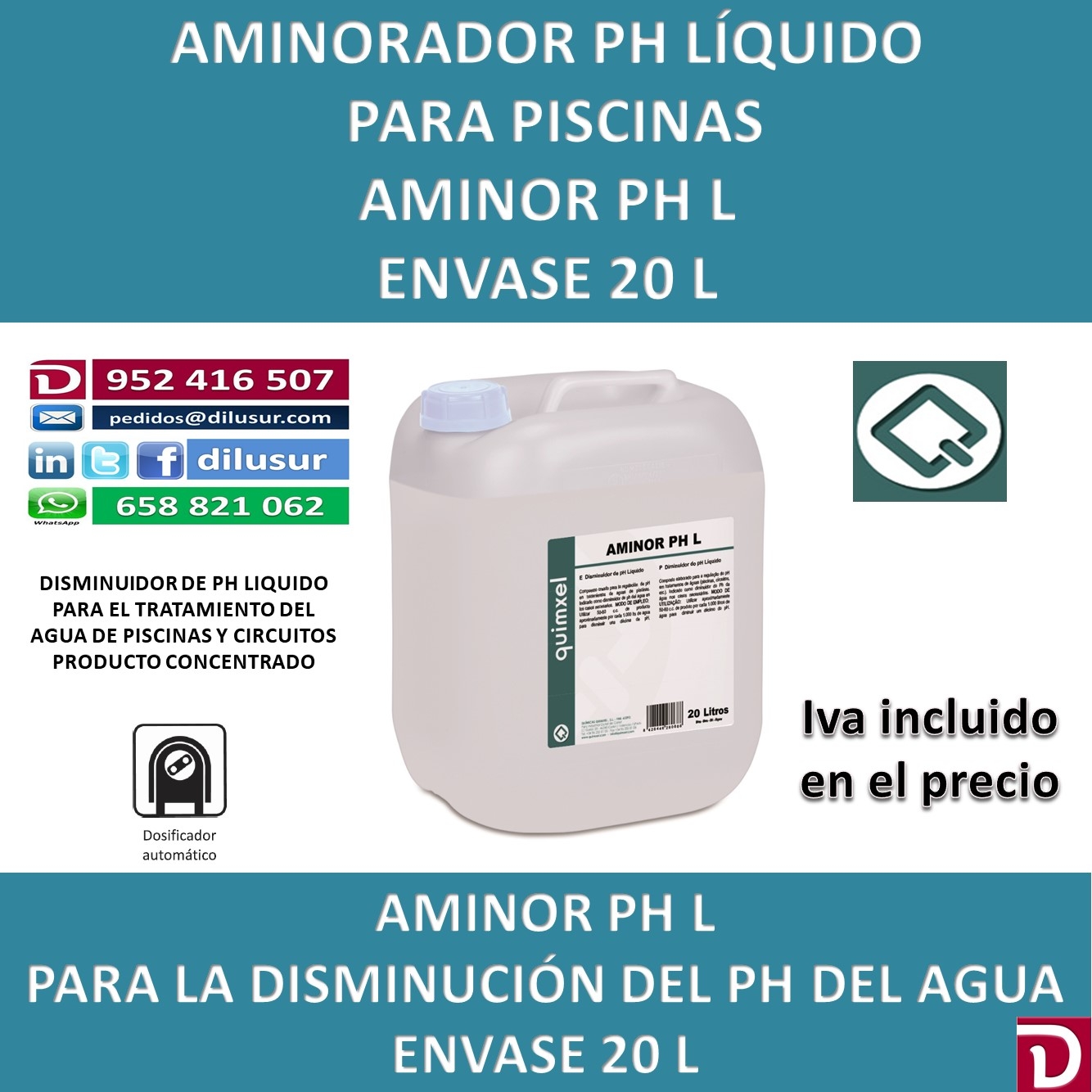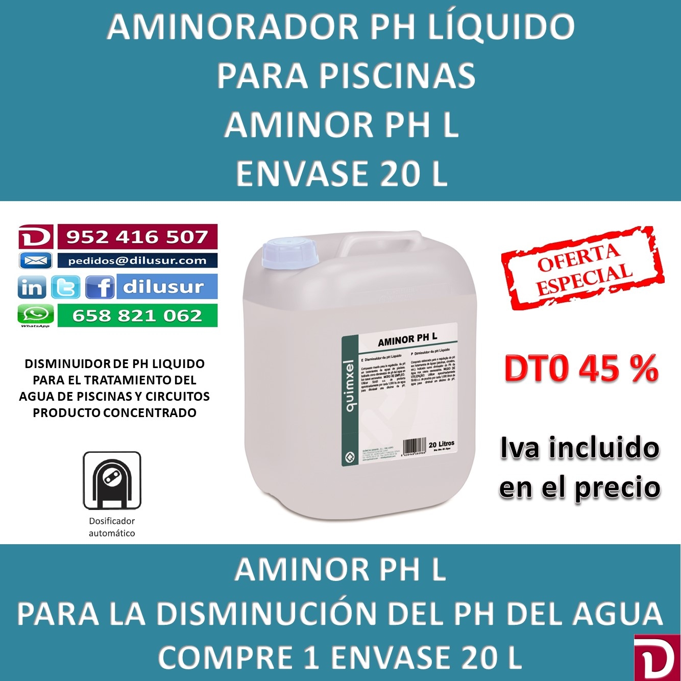 Disminuidor de ph líquido concentrado para el tratamiento de aguas de piscinas y circuitos. Envase 20 L. Iva incluido.