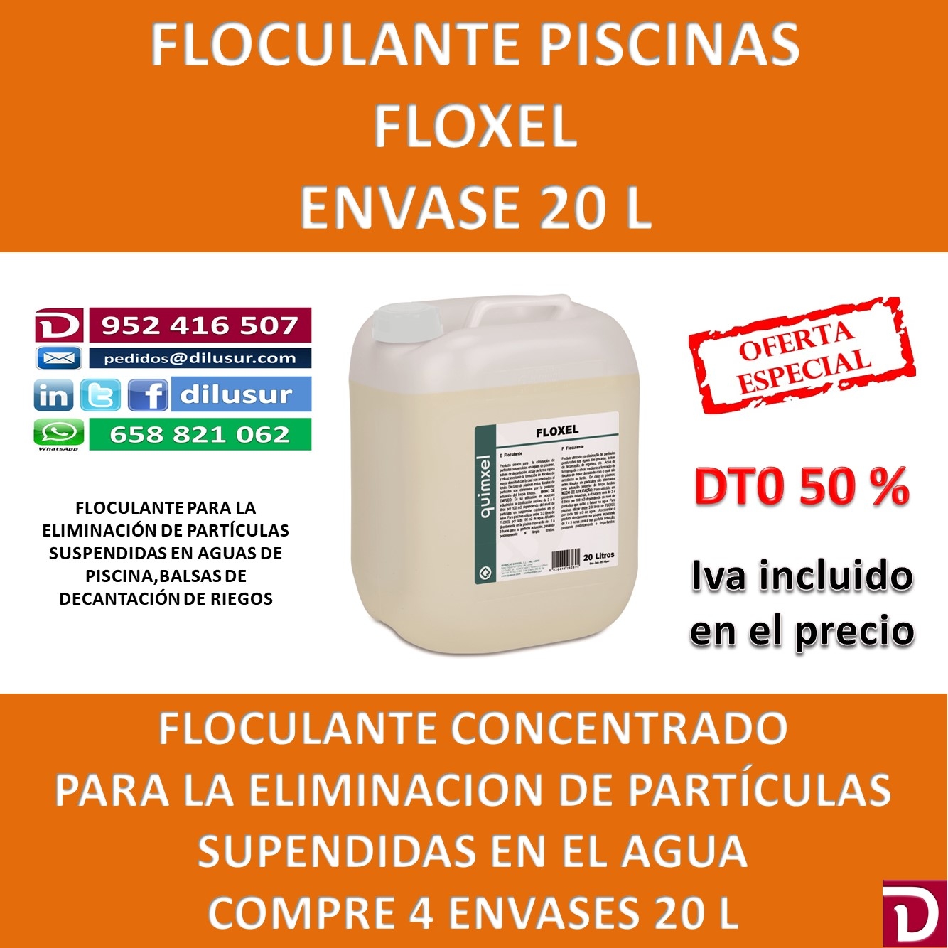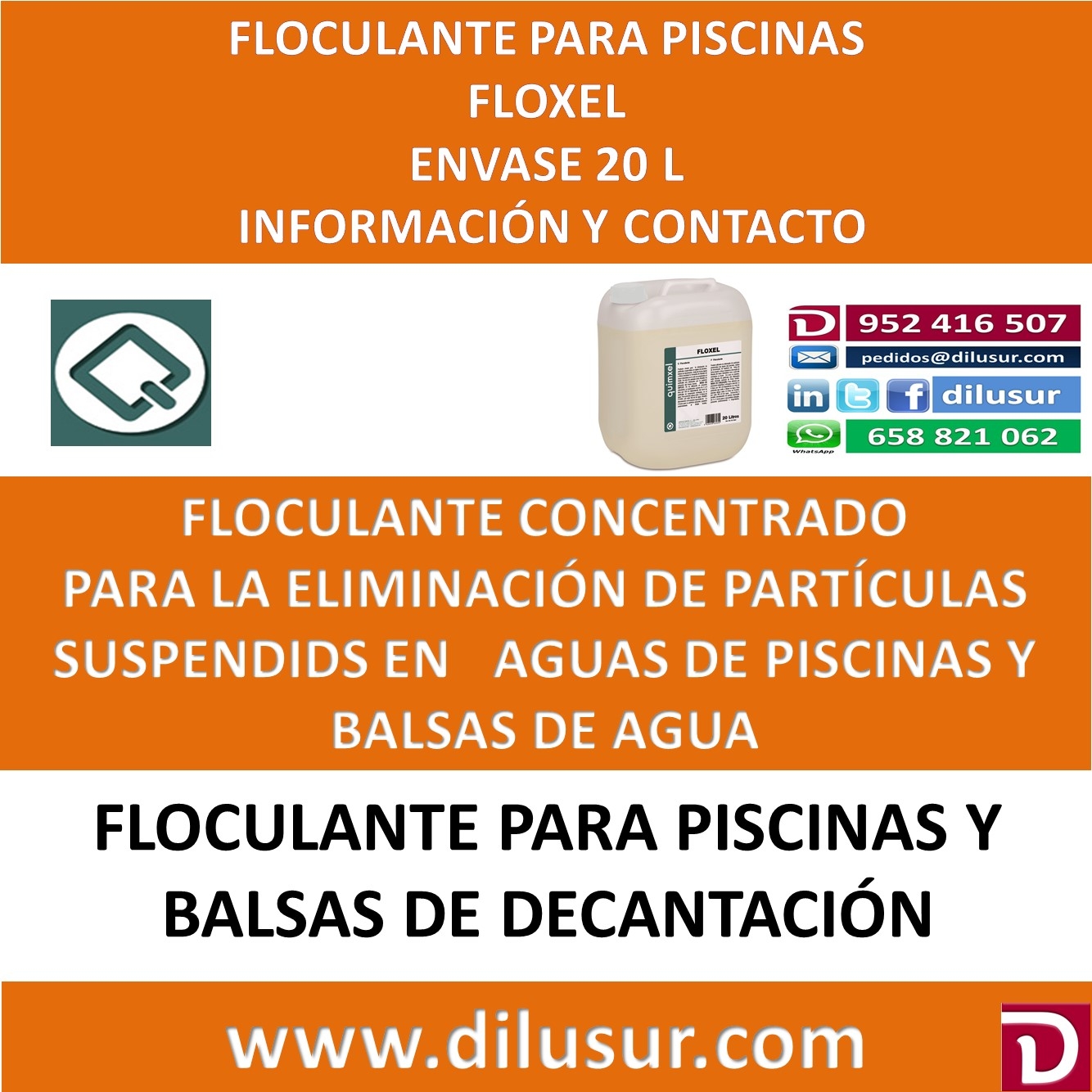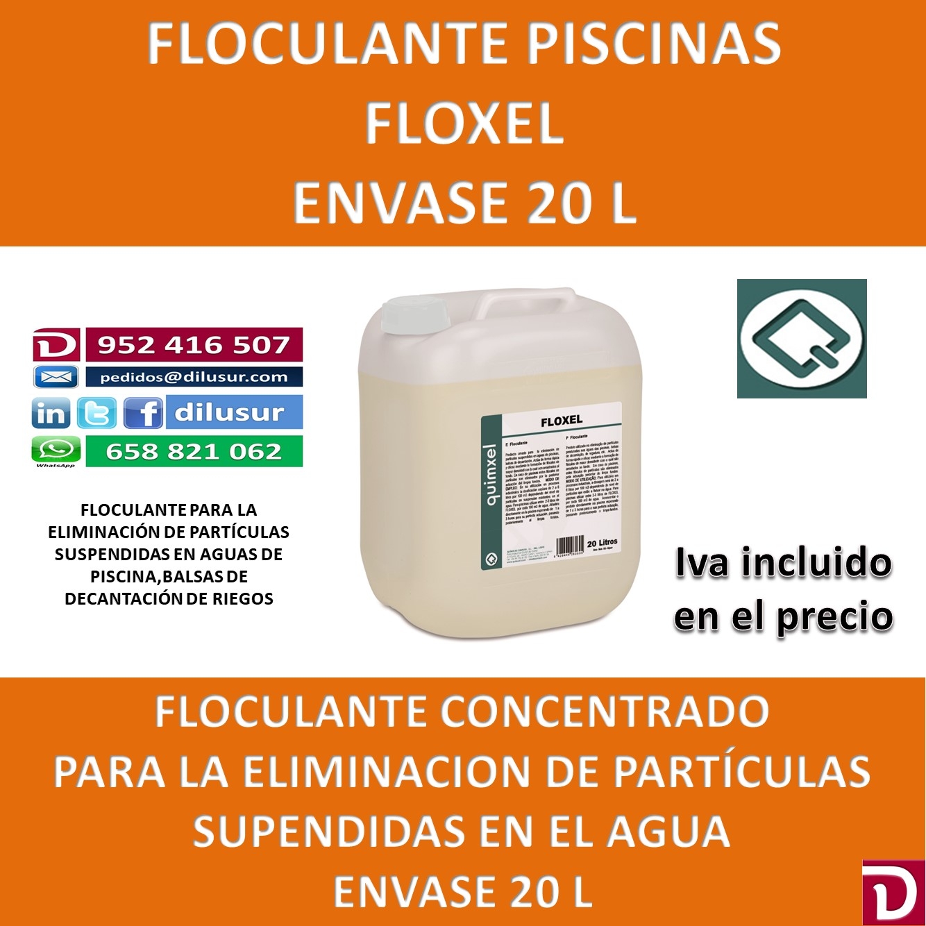 Floculante para la eliminación de partículas suspendidas en aguas de piscinas, balsas de decantación de riegos, etc. Actúa de forma rápida y eficaz, producto concentrado. Envase 20 L. Iva incluido