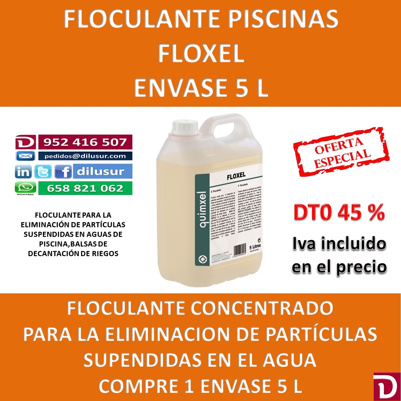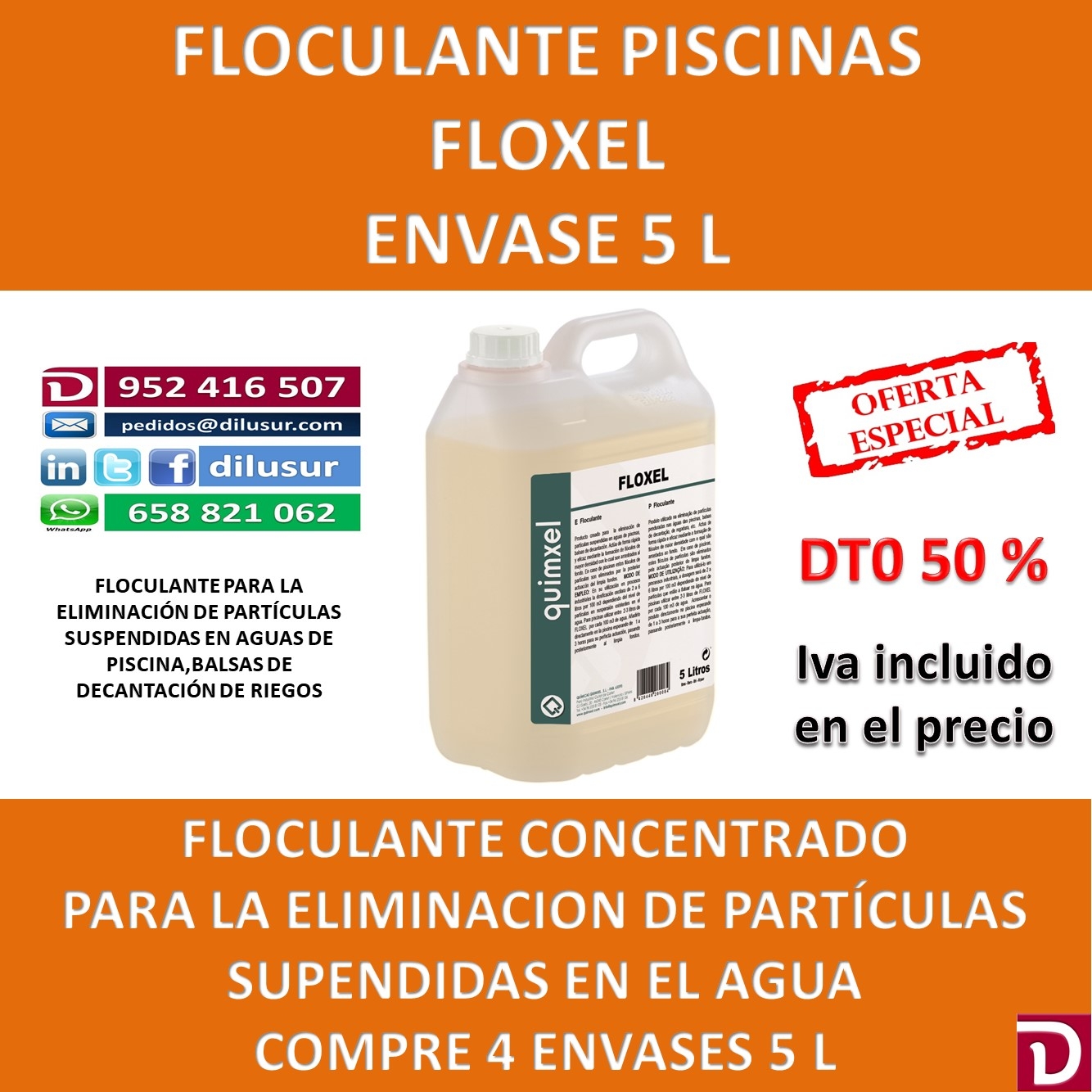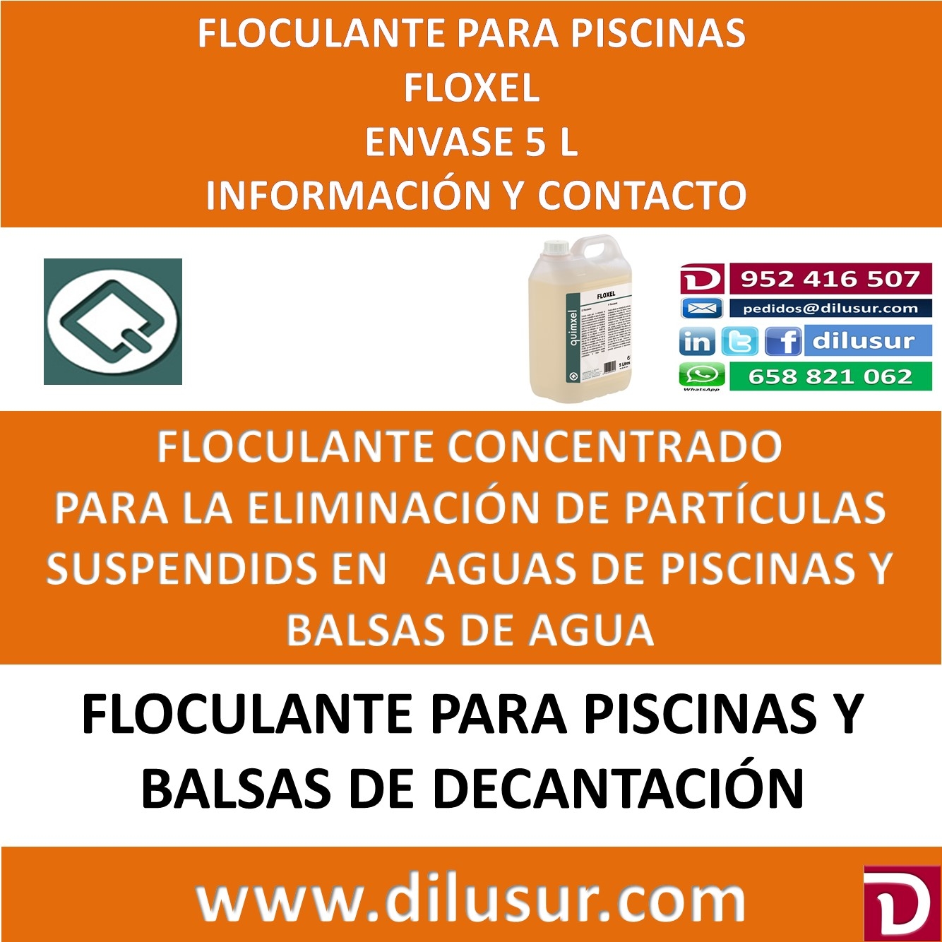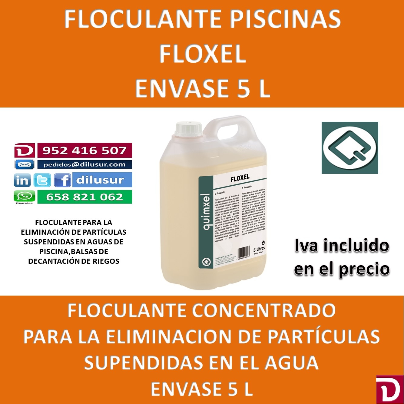Floculante para la eliminación de partículas suspendidas en aguas de piscinas, balsas de decantación de riegos, etc. Actúa de forma rápida y eficaz, producto concentrado. Envase 5 L. Iva incluido