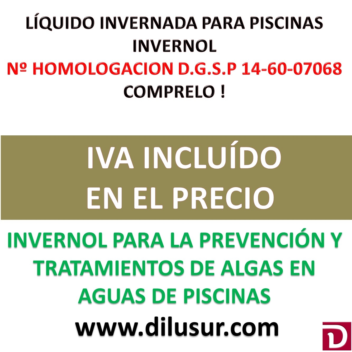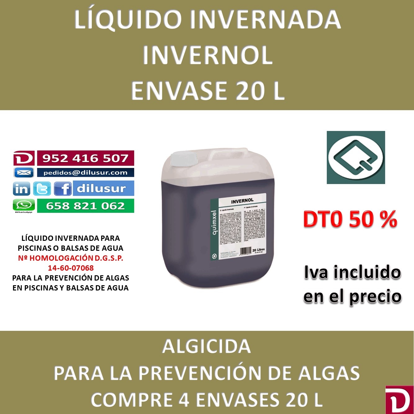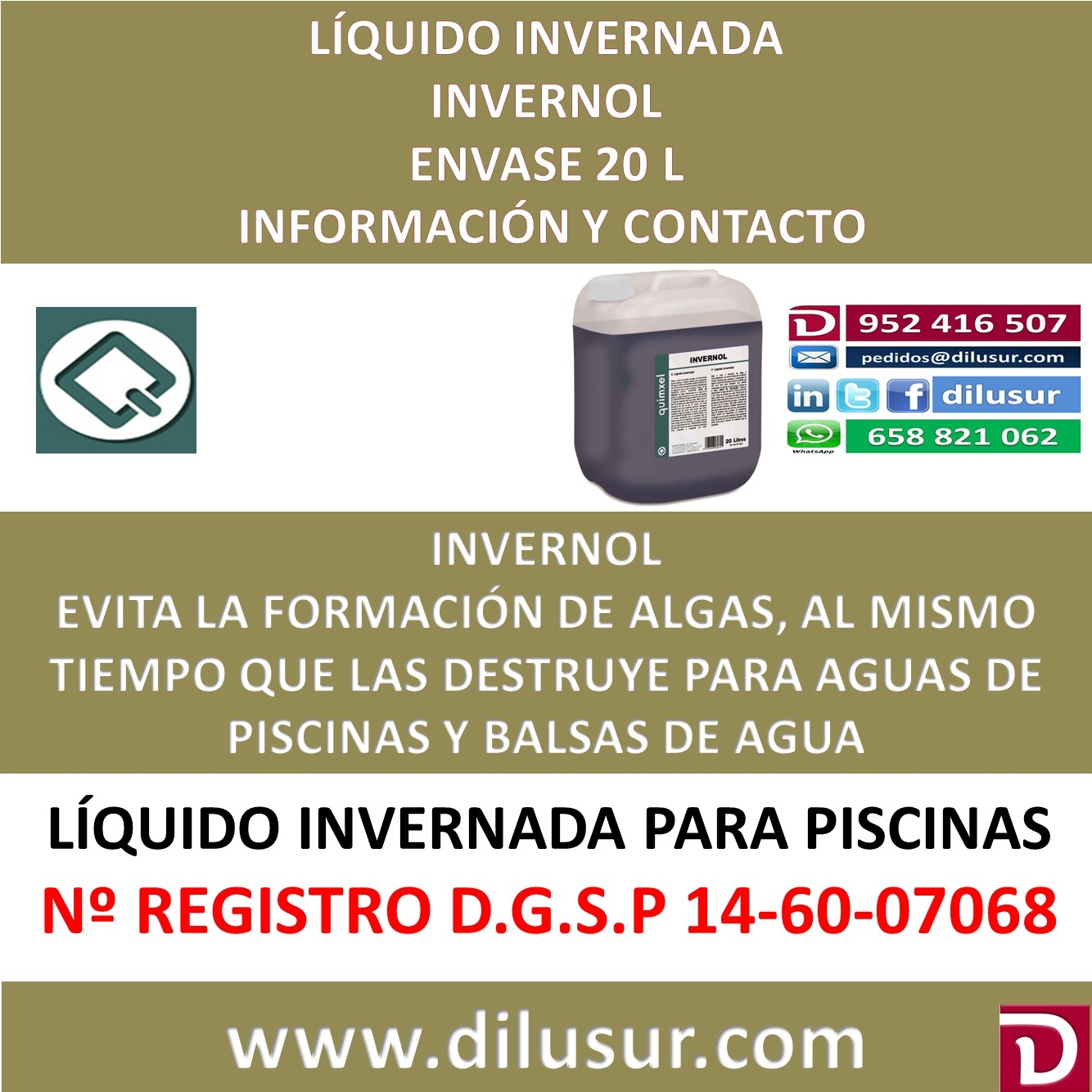 Líquido invernada, evita la formación de algas y las elimina al mismo tiempo. Indicado como mantenedor del agua en época de invernada. Homologado por la D.G.S.P nº 14-60-07068, Envase 20 L. Iva incluido
