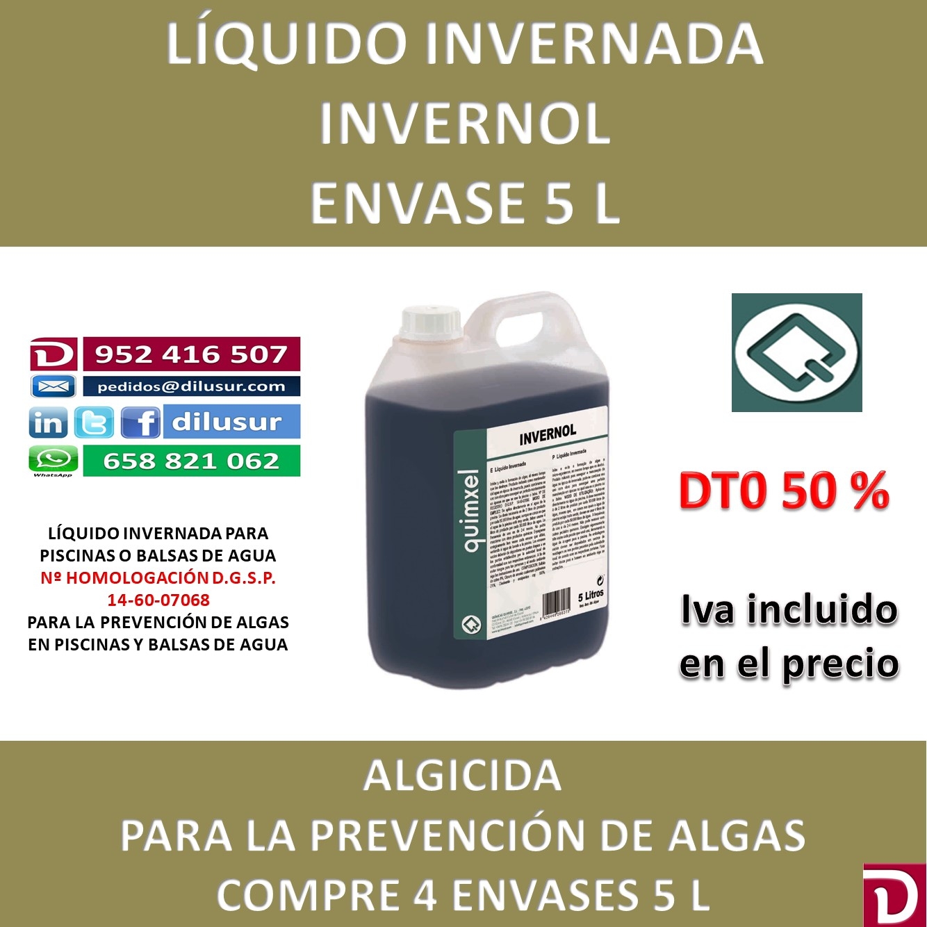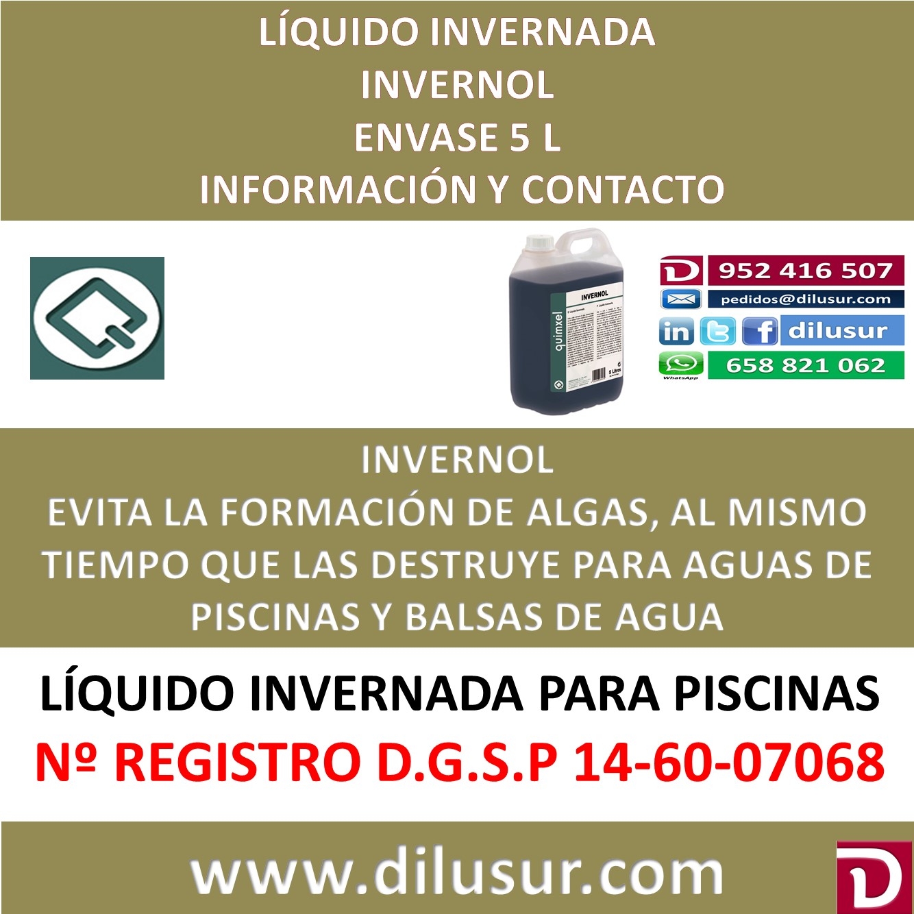 Líquido invernada, evita la formación de algas y las elimina al mismo tiempo. Indicado como mantenedor del agua en época de invernada. Homologado por la D.G.S.P nº 14-60-07068, Envase 5 L. Iva incluido