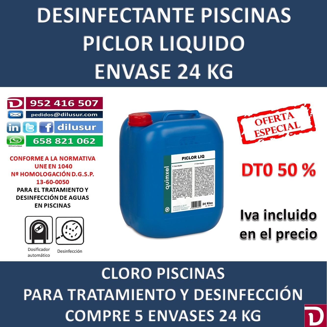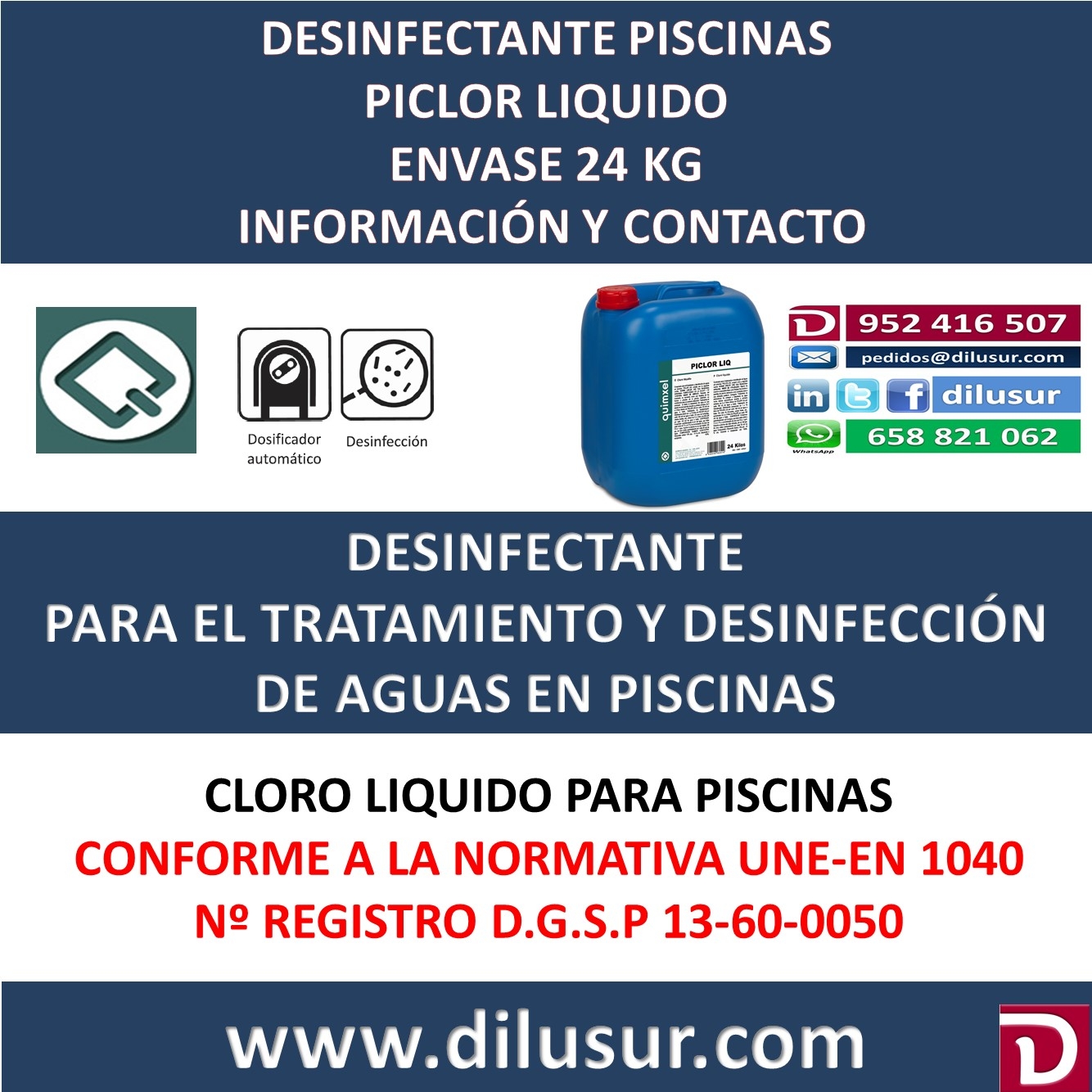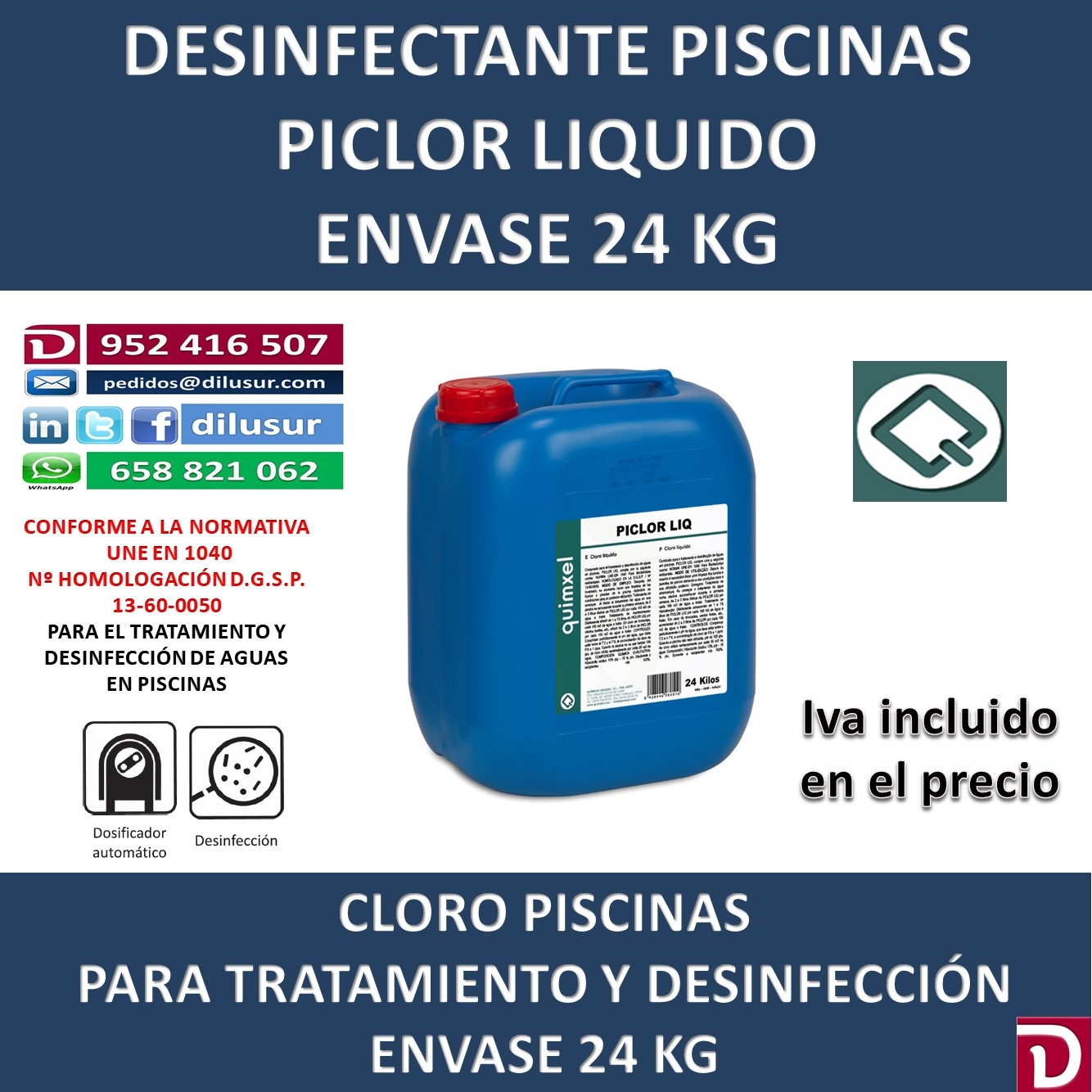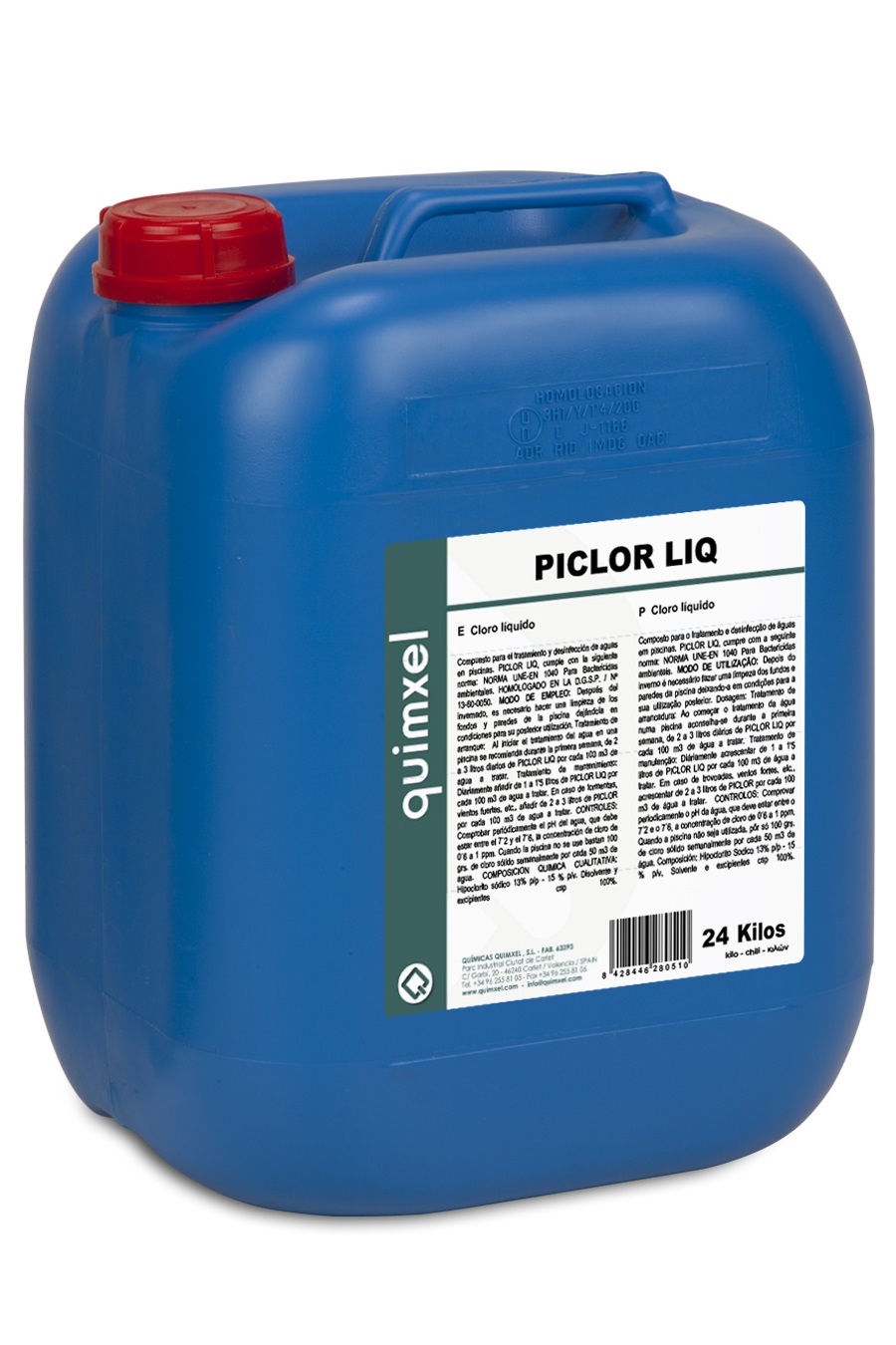 Cloro líquido desinfectante para el tratamiento de aguas en piscinas, conforme a la normativa UNE-EN 1040, Homologado por la D.G.S.P 13-60-0050, Envase 24 kg, Iva incluido