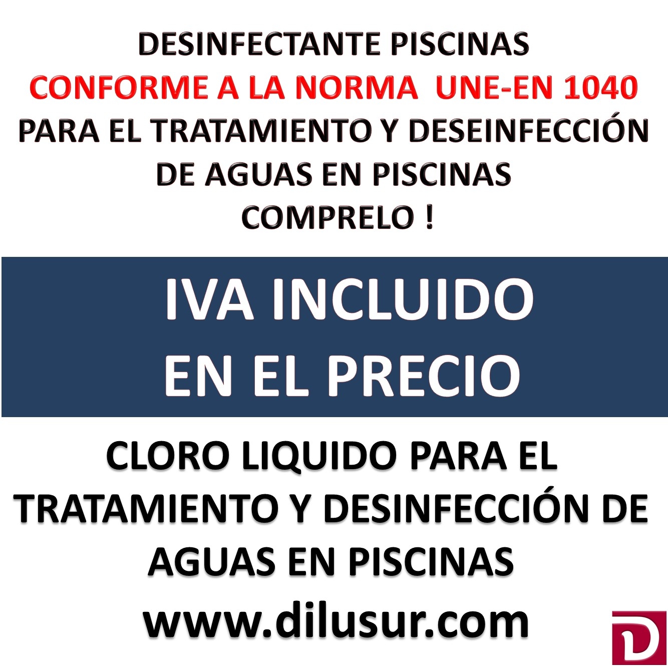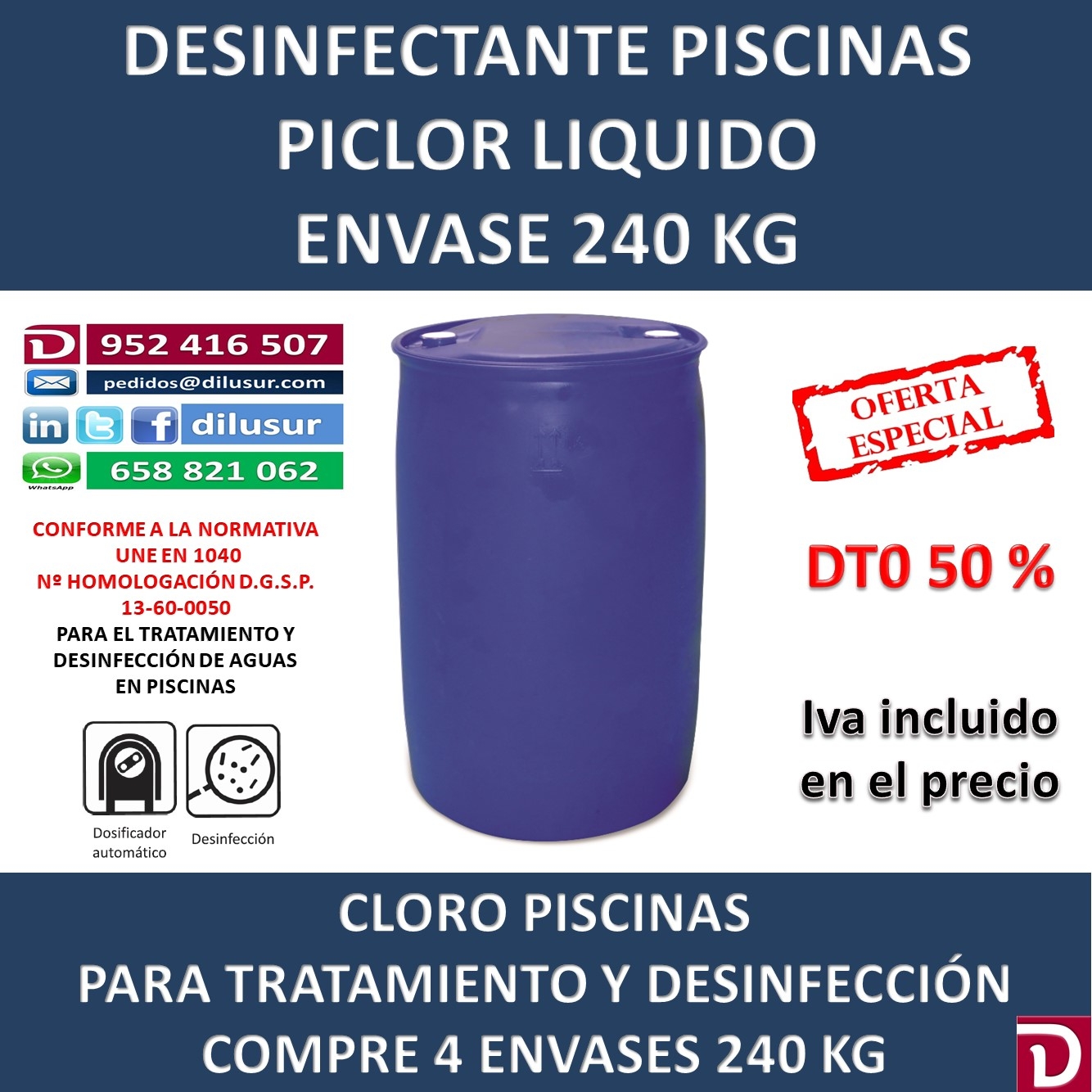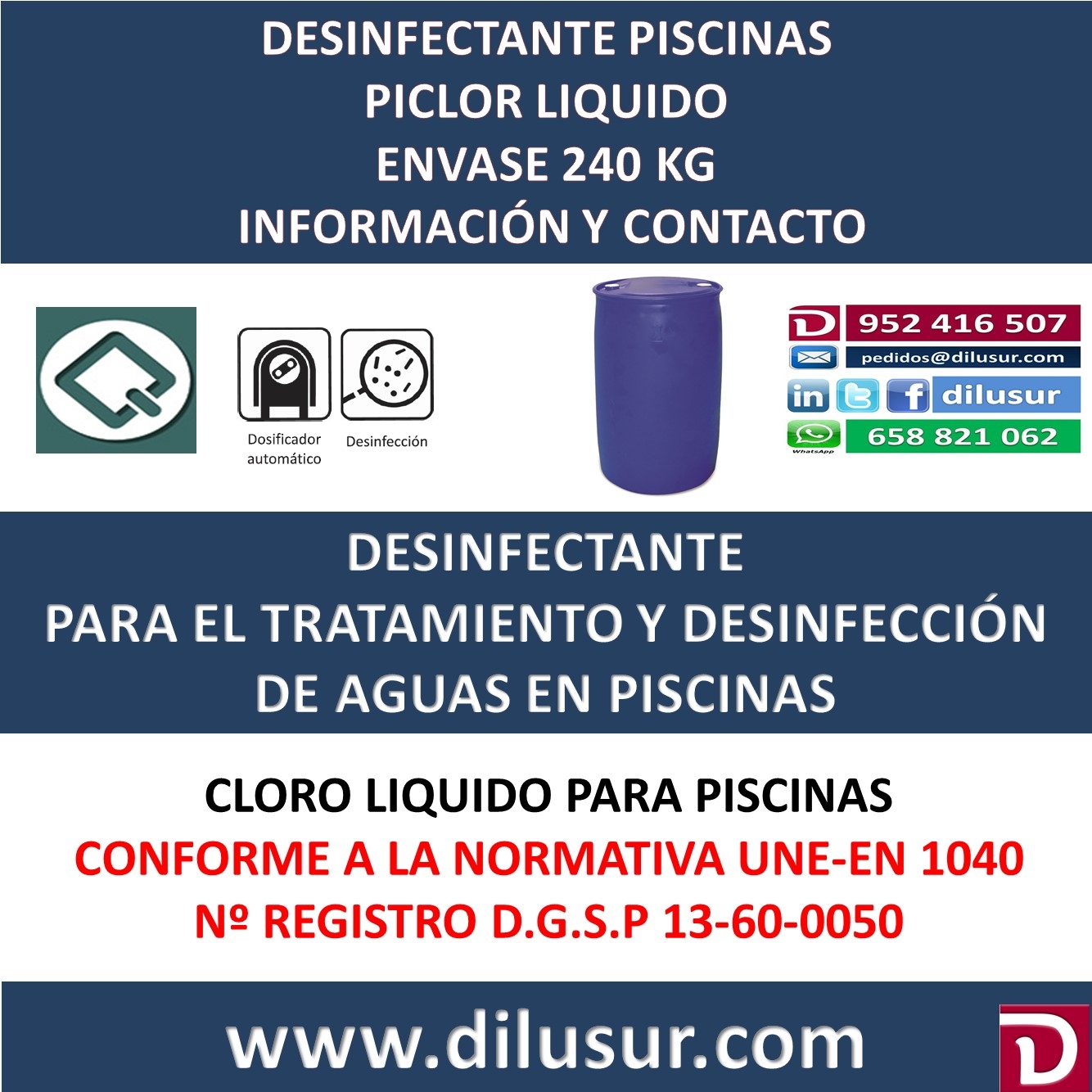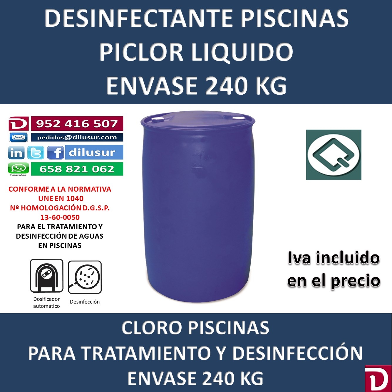 Cloro líquido desinfectante para el tratamiento de aguas en piscinas, conforme a la normativa UNE-EN 1040, Homologado por la D.G.S.P 13-60-0050, Envase 240 kg, Iva incluido