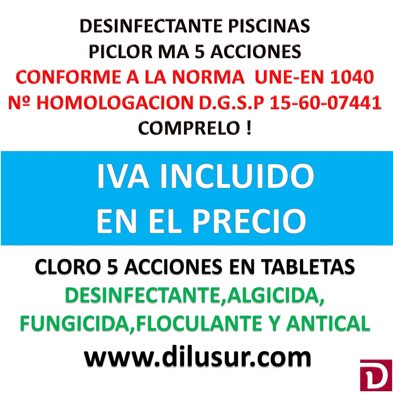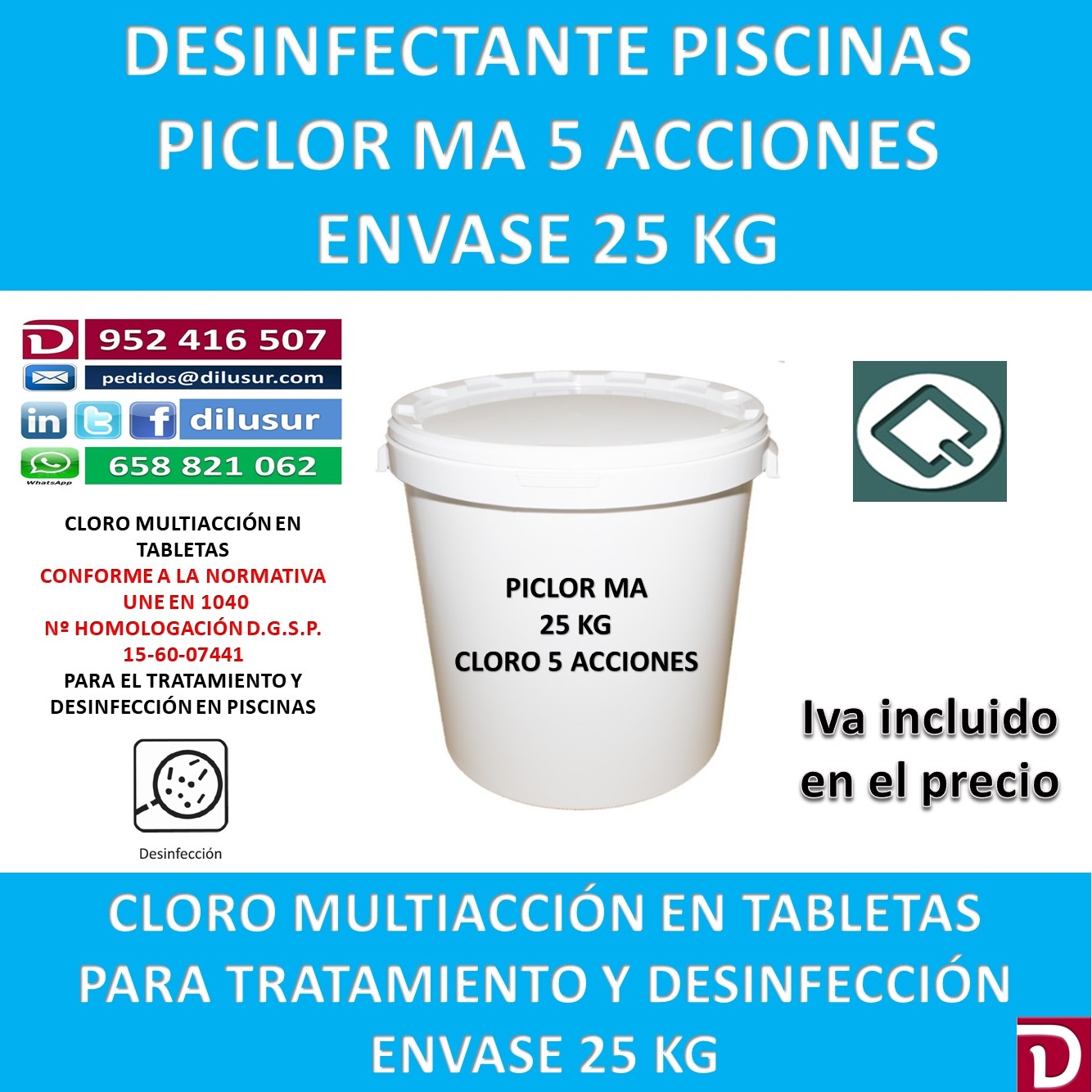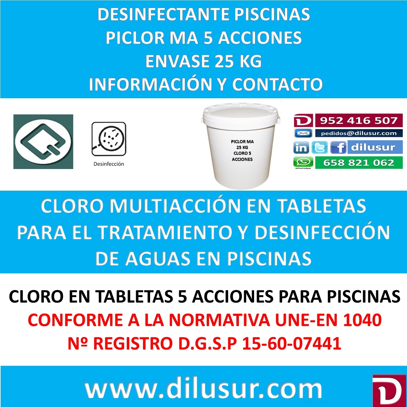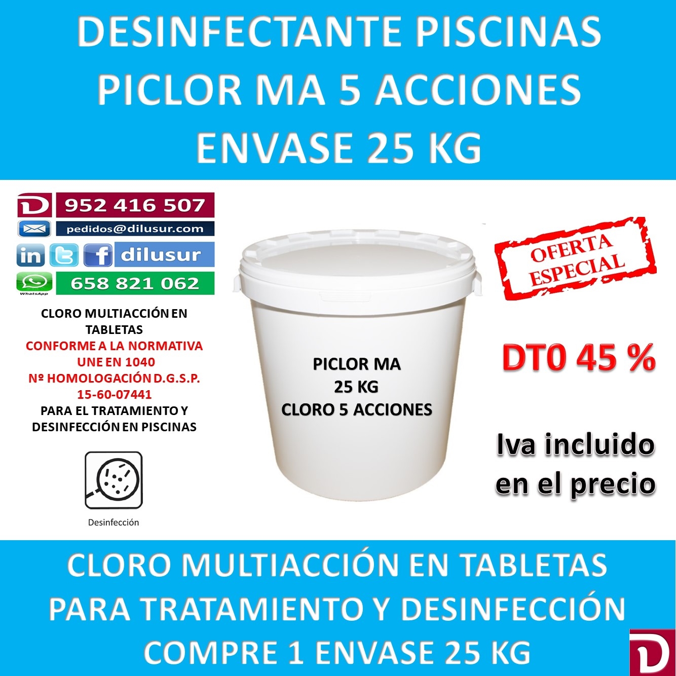 Cloro 5 acciones para tratamiento y desinfección en piscinas, clorador y desinfectante, algicida,fungicida,floculante, regulador de Ph, y antical. Con normativa UNE-EN 1040 y num homologación D.G.S.P 15-60-07441. Envase 25 Kg, Iva incluido