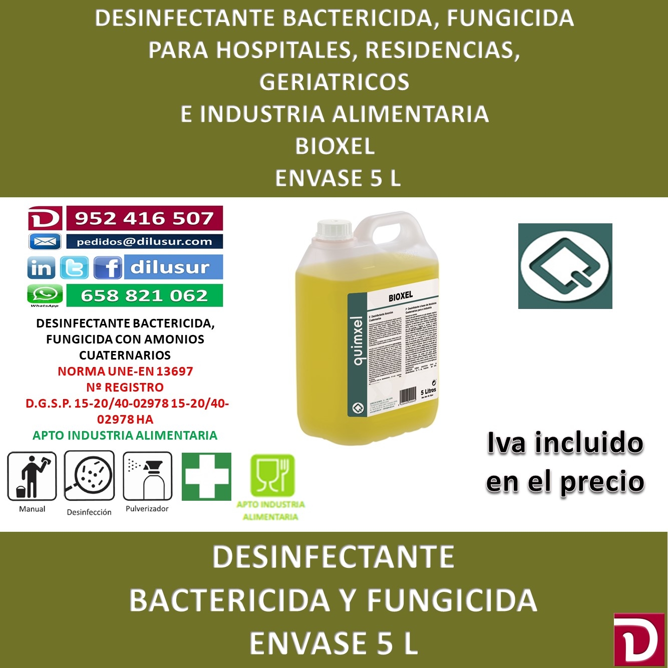 Desinfectantedetergente fungicida y bactericida contiene amonios cuaternarios. Para superficies duras en la limpieza de hospitales,residencias, geriatricos. Apto para industria Alimentaria. Envase 5 L, Caja 4 und Iva incluido