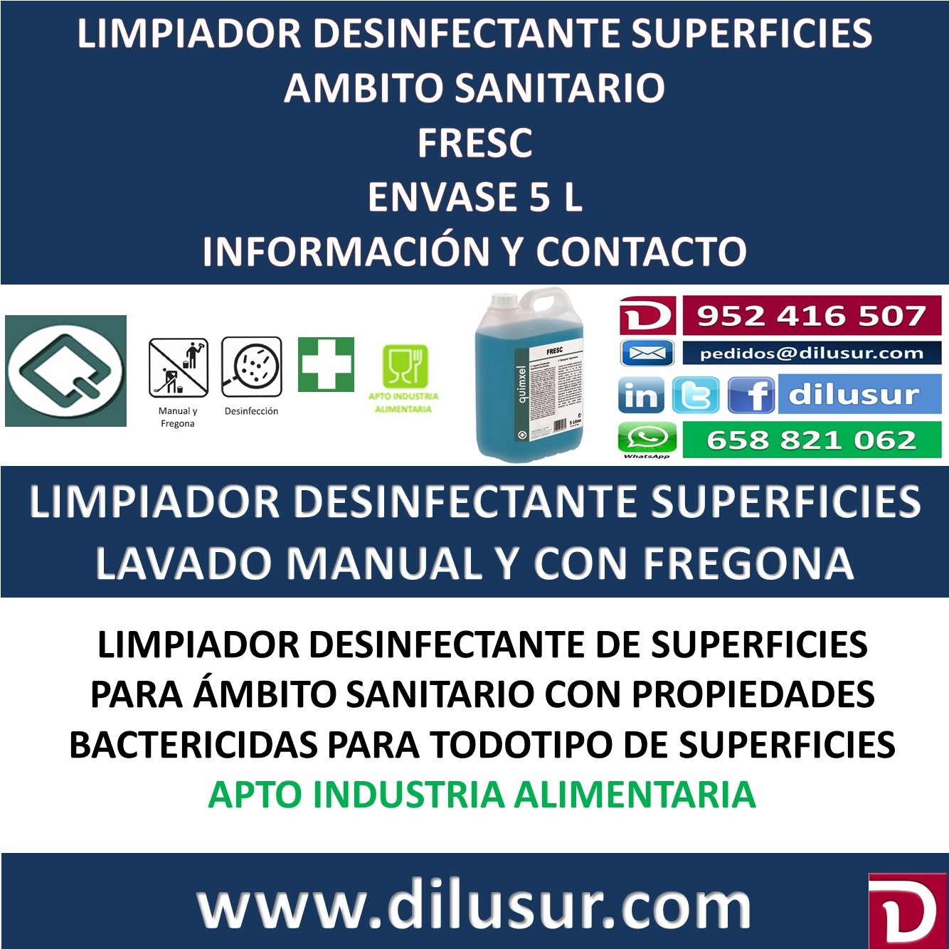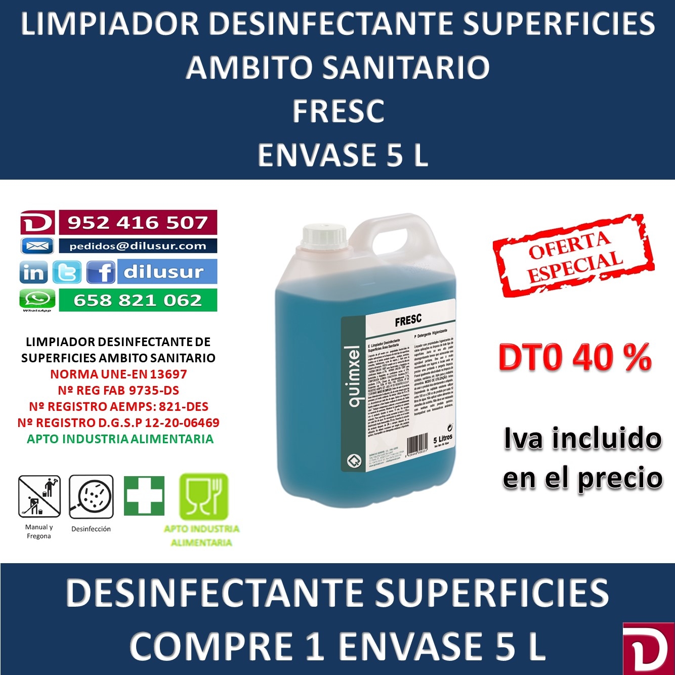 Limpiador desinfectante de superficies, ámbito sanitario con propiedades bactericidas para la limpieza de todo tipo de superficies lavables en el ámbito sanitario.( suelos, azulejos, servicios, consultas, habitaciones, salas de espera). Apto para la industria alimentaria.