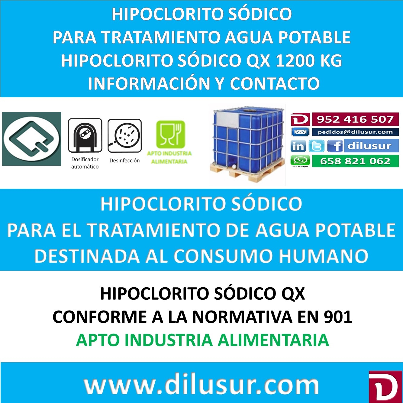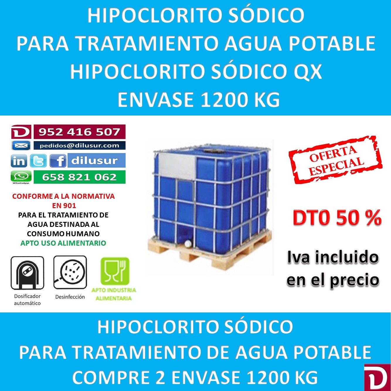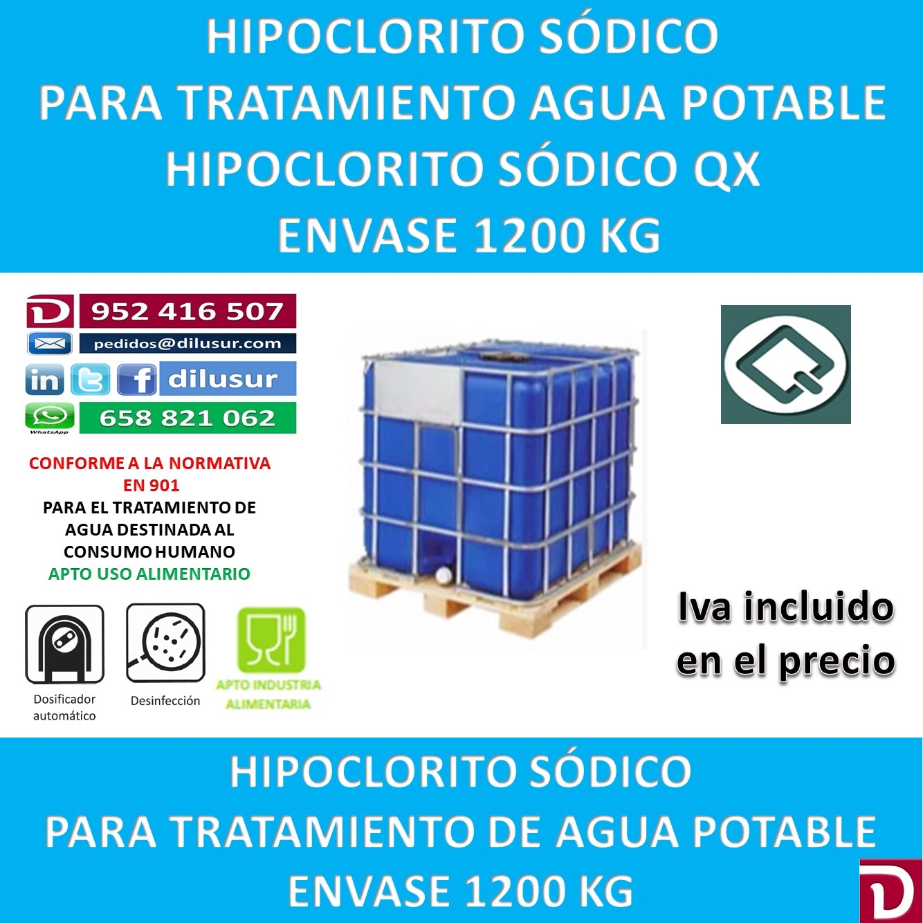 Hipoclorito sódico para el tratamiento de agua potable destinada al consumo humano conforme a la normativa EN 901. Apto para la industria alimentaria. Envase 1200 kg. Iva incluido