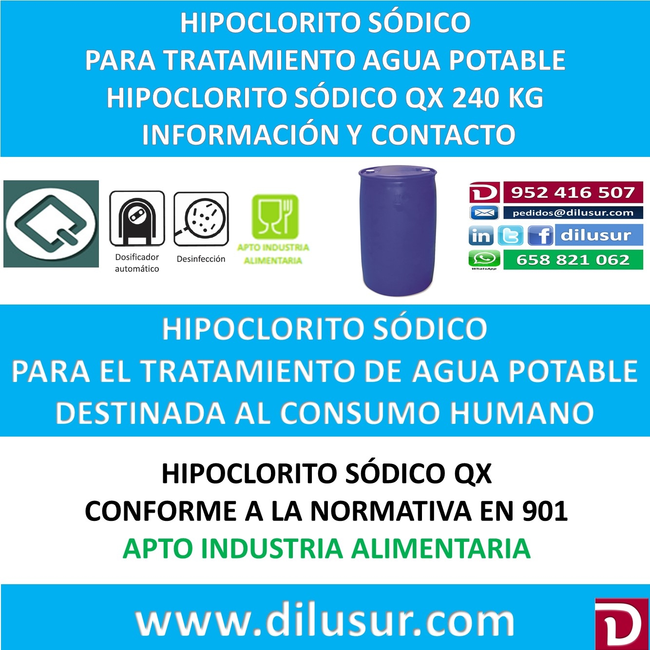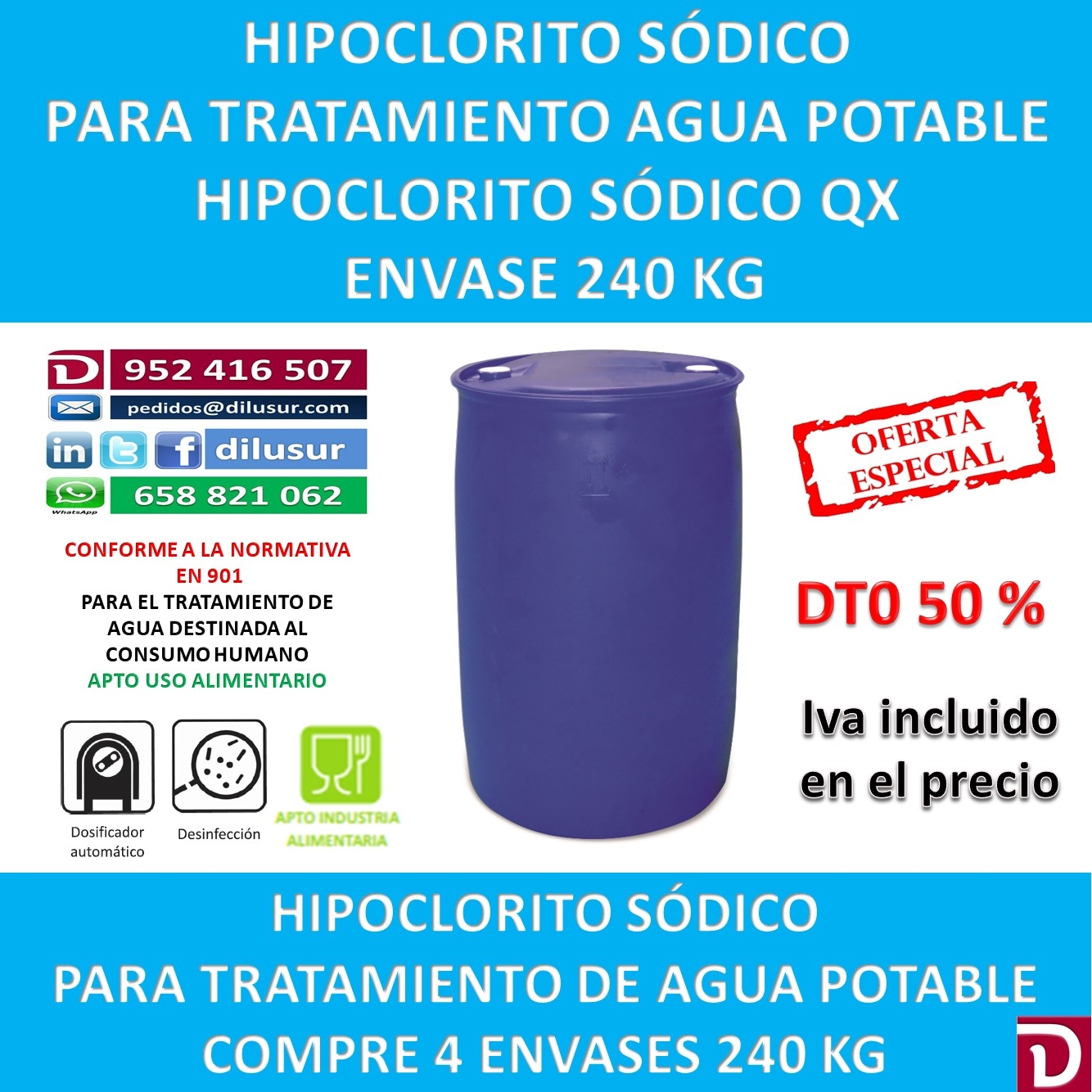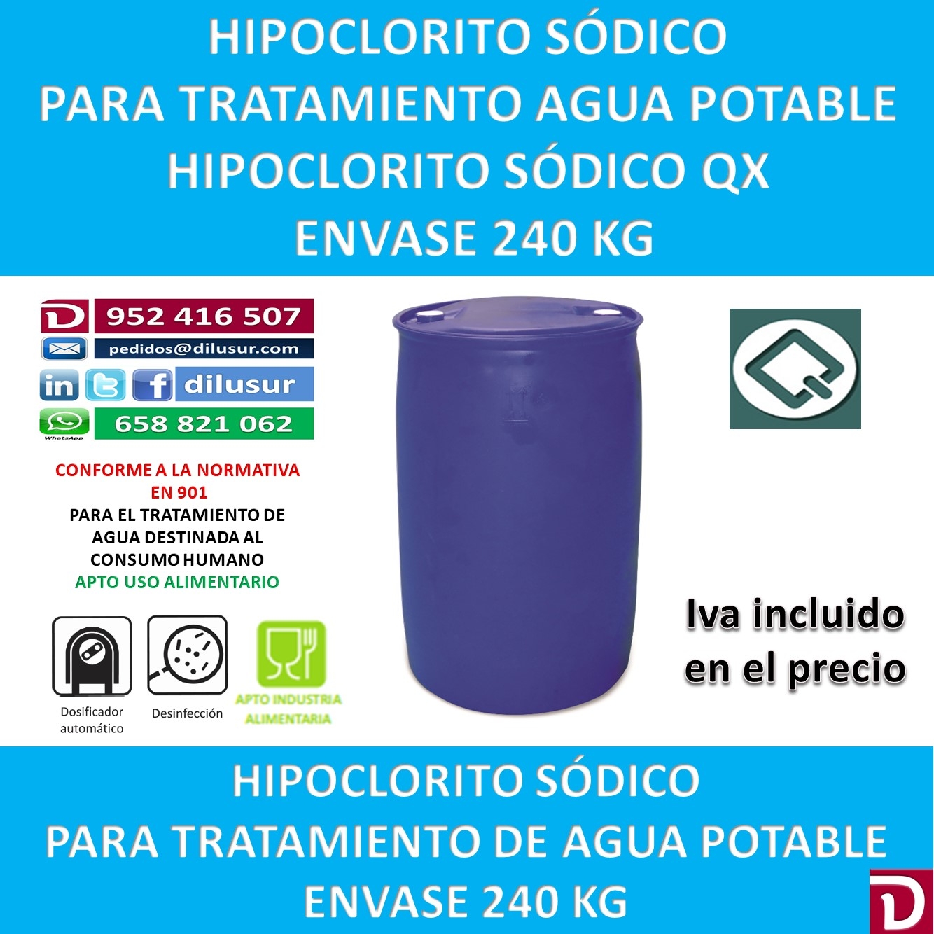 Hipoclorito sódico para el tratamiento de agua potable destinada al consumo humano conforme a la normativa EN 901. Apto para la industria alimentaria. Envase 240 kg. Iva incluido
