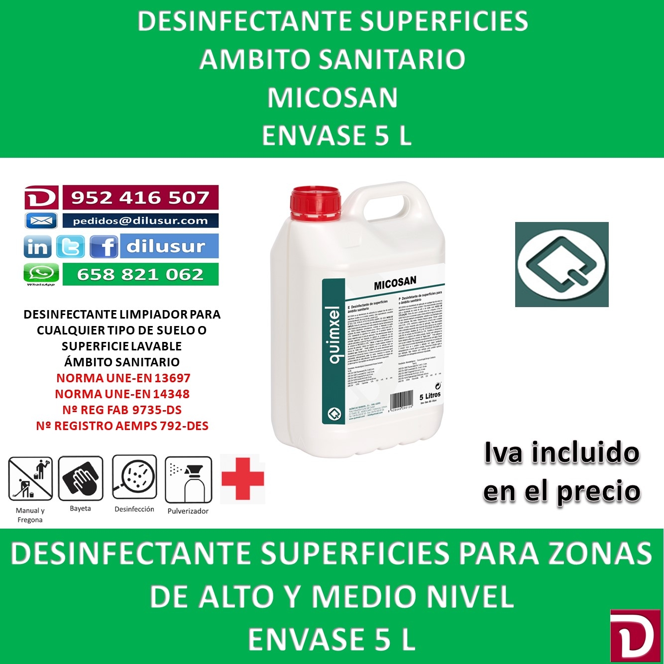 Desinfectante de superficies para el ámbito sanitario, eficaz, frente a virus encapsulados, ( Hepatitis,VIH,Coronavirus, influenza, como virus no encapsulados ( poliovirus, adenovirus, Norovirus). Envase 5 L, Iva incluido