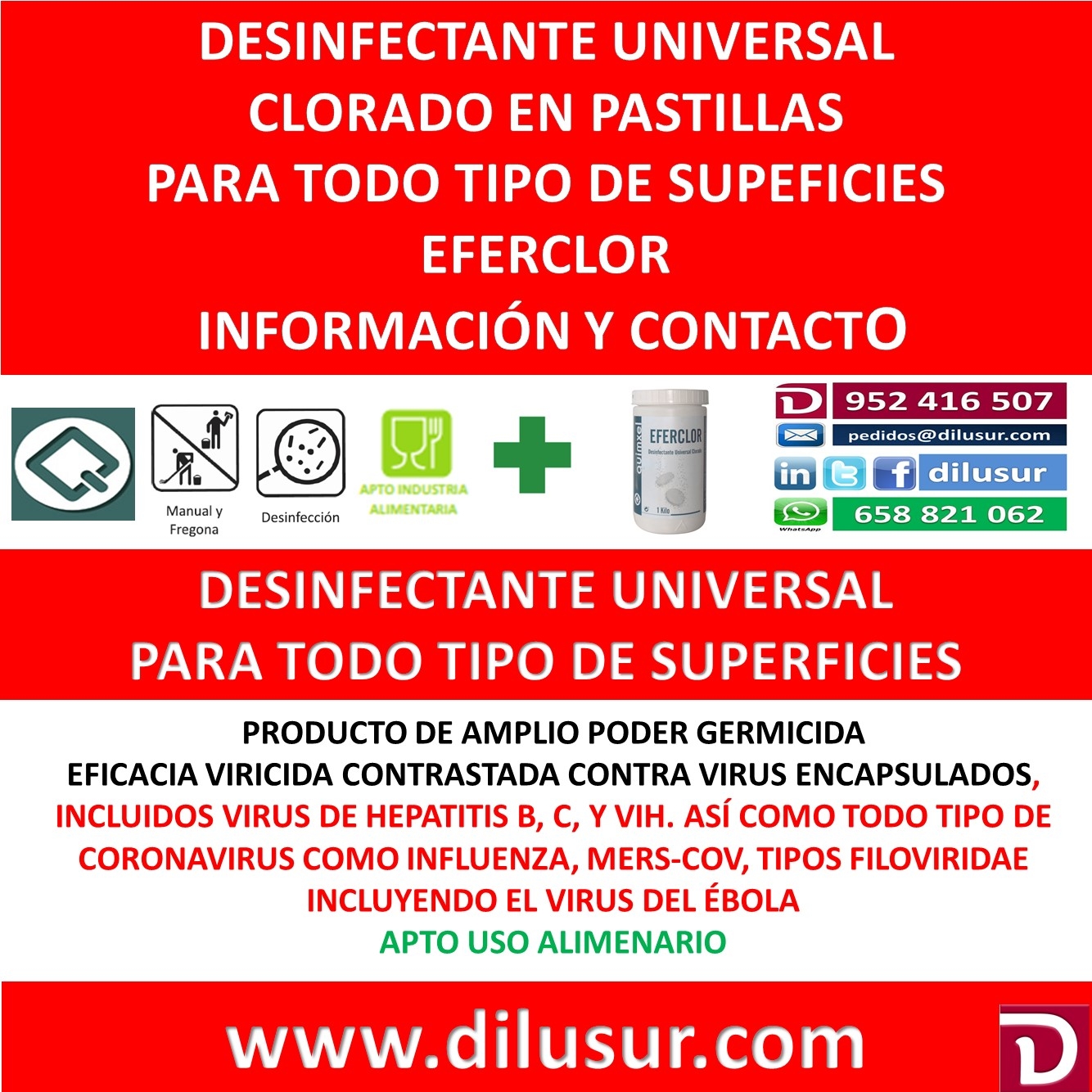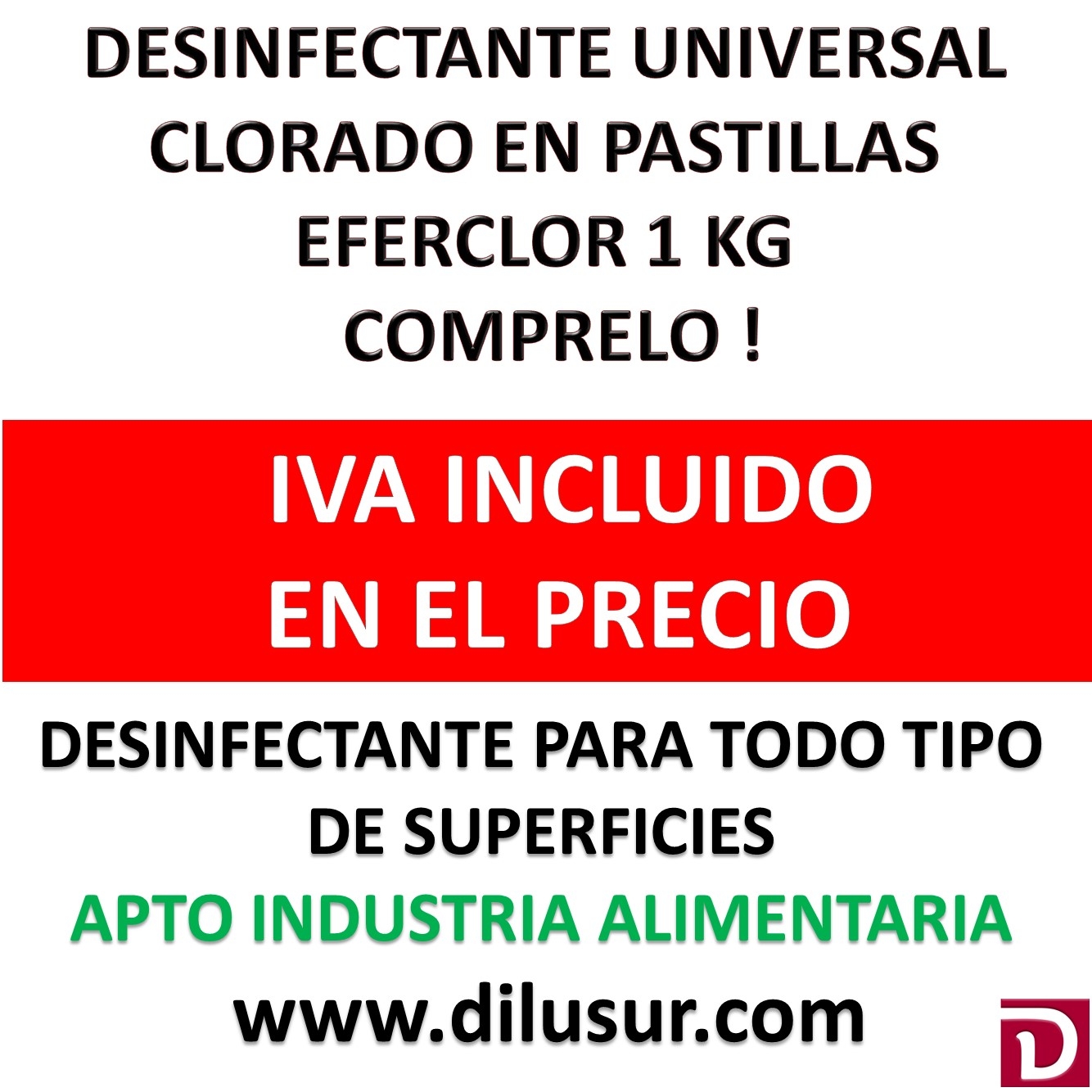 Desinfectante universal clorado en pastillas, de tipo esfervescente que en contacto con el agua libera cloro activo. Para la desinfección de todo tipo de superficies, germicida. Apto industria alimentaria. Envase 1 Kg. Iva incluido.