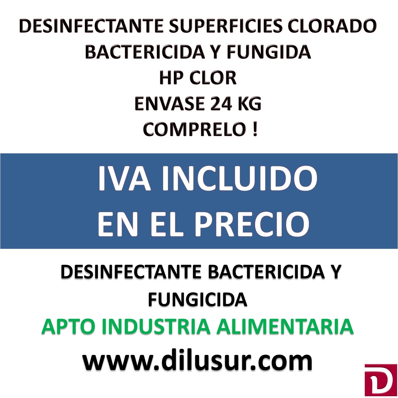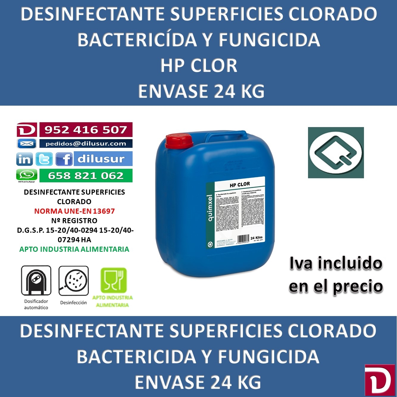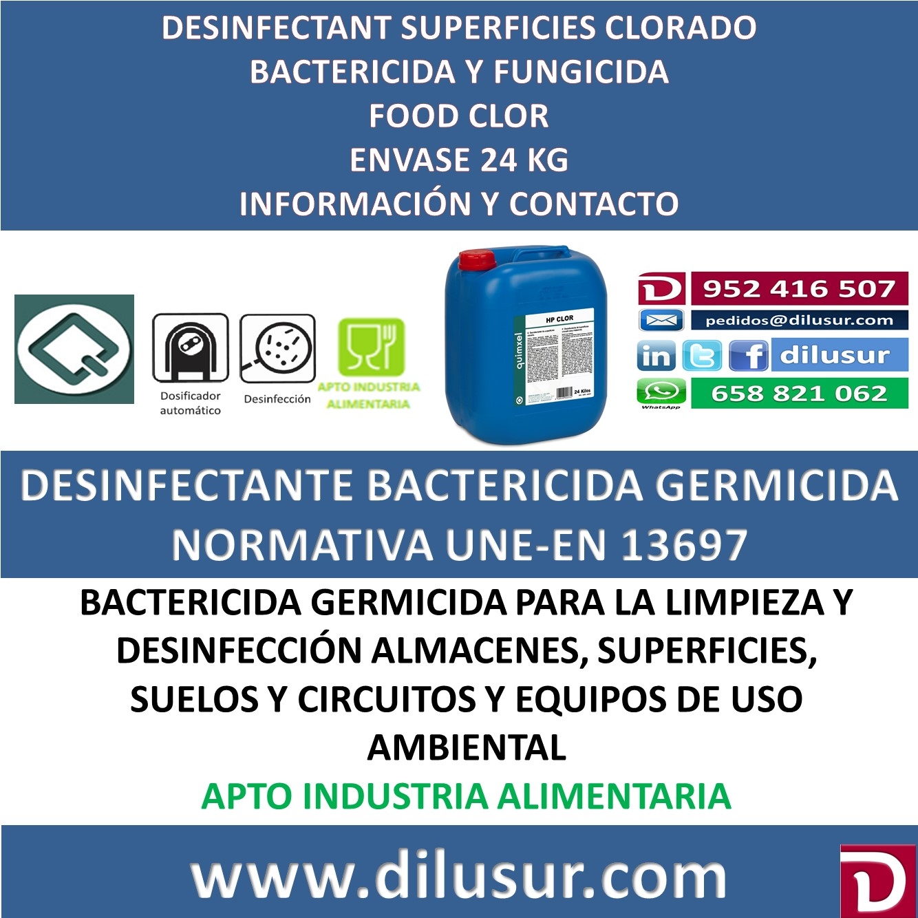 Desinfectante de superficies clorado,para la limpieza y desinfección de almacenes, suelos, circuitos y equipos de uso ambiental. Apto industria alimentaria, producto bactericida y fungicida cumple la norma UNE-EN 13697. Envase 24 Kg. Iva incluido