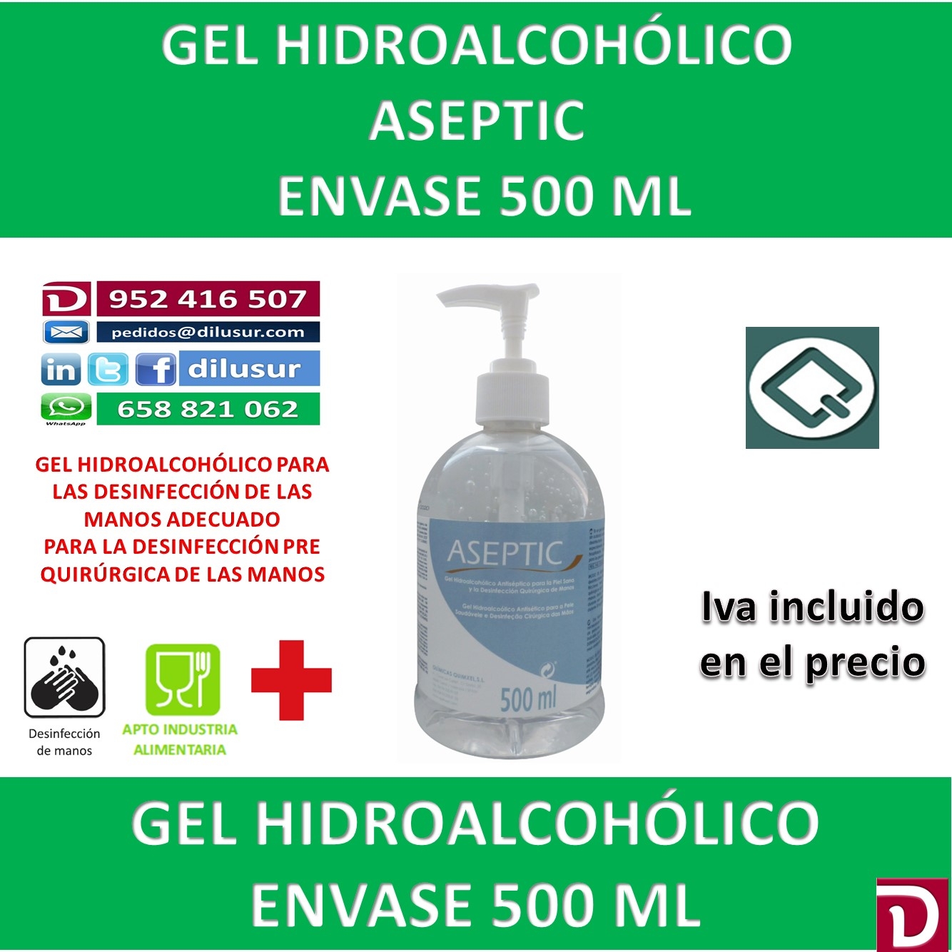 Gel hidroalcoholico de uso alimentario, Aseptic para la desinfeccion de manos y aplicaciones prequirúrgicas, para servicios medicos, centros hospitalarios. Envase 500 ML con pulverizador. Iva incluido