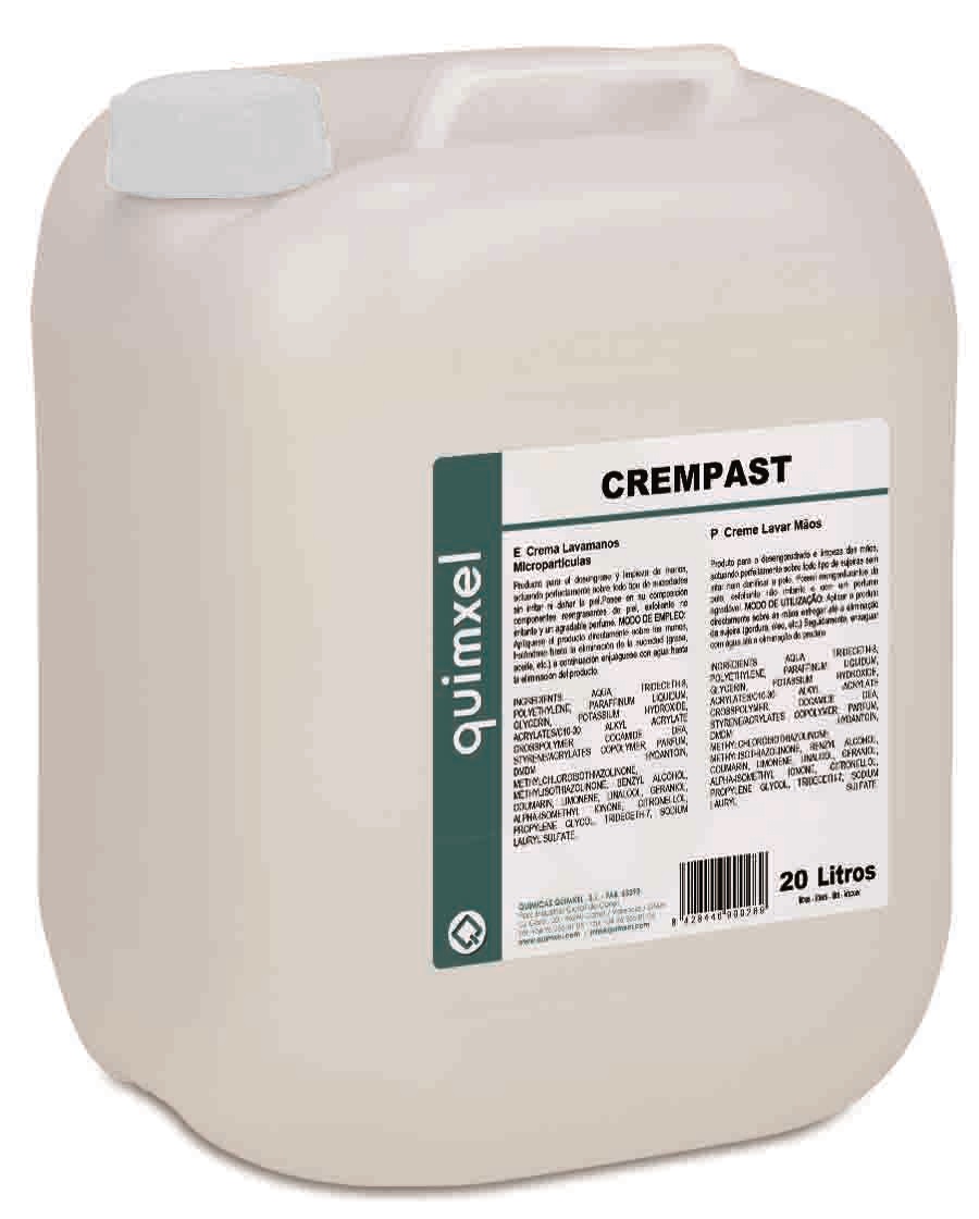 Crema lavamanos con micropartículas Crempast. Para el desengrase y limpieza de manos, actua eficazmente sobre todo tipo de suciedades sin irritar ni dañar la piel. Envase 20 L. Iva incluido