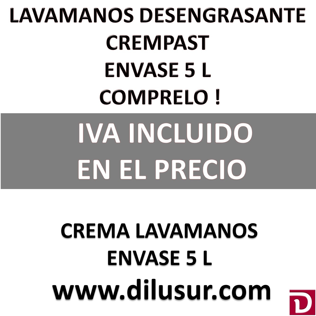 Crema lavamanos con micropartículas Crempast. Para el desengrase y limpieza de manos, actua eficazmente sobre todo tipo de suciedades sin irritar ni dañar la piel. Envase 5 L con dosificador. Iva incluido
