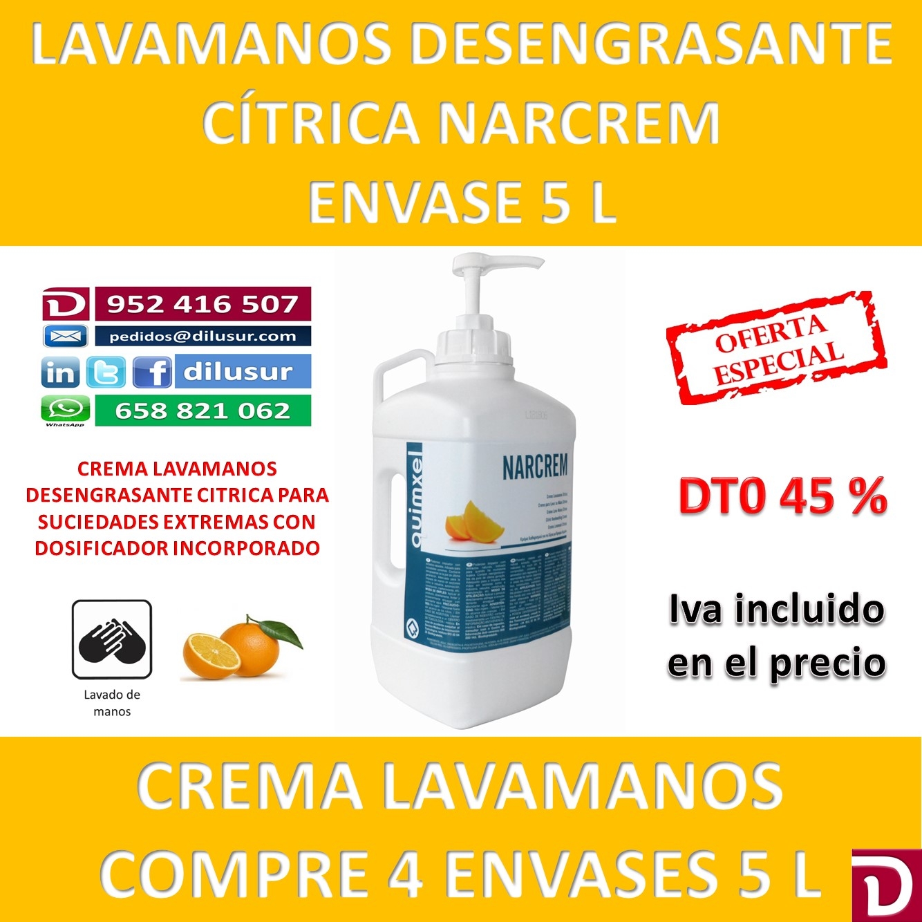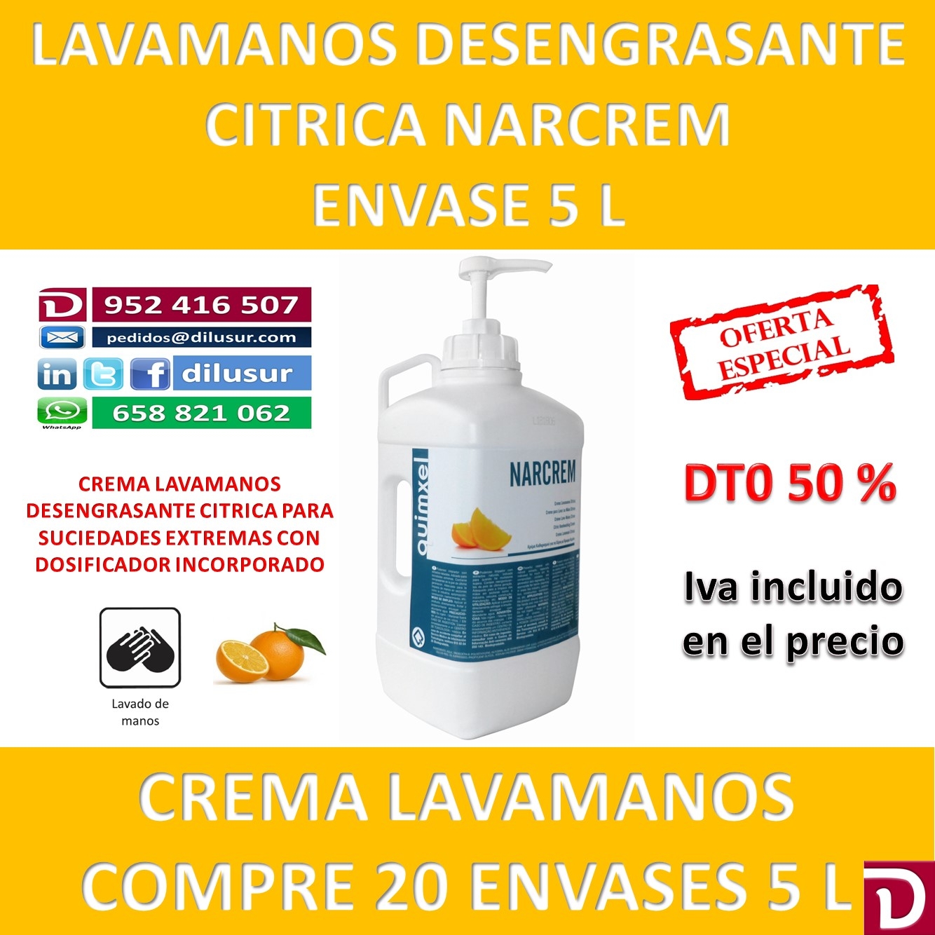 Poderoso limpiador y desengrasante de manos con extractos naturales de naranja, indicado para suciedades extremas, Se presenta en envase de 20 L.