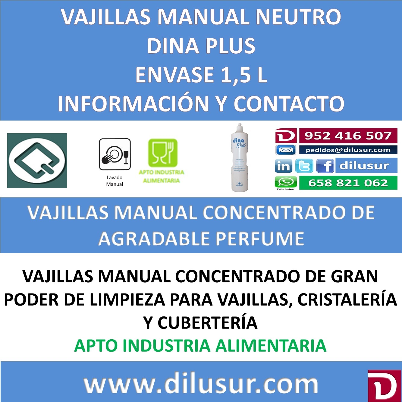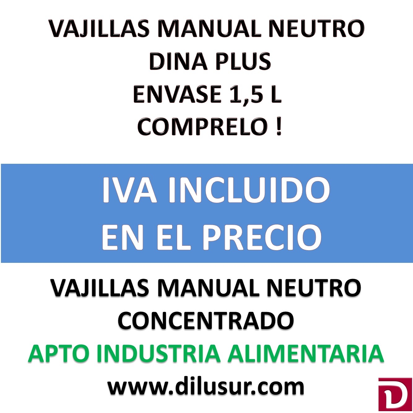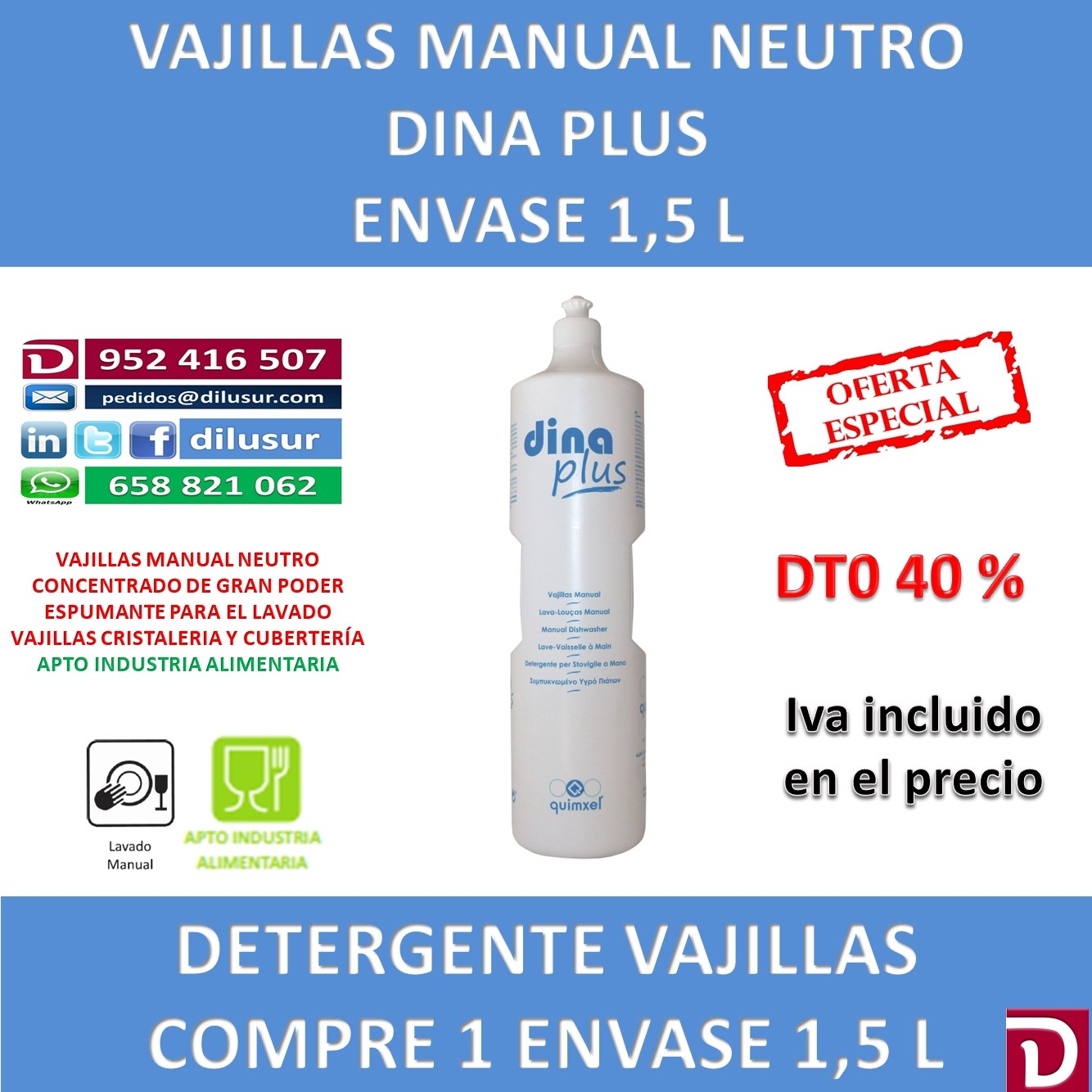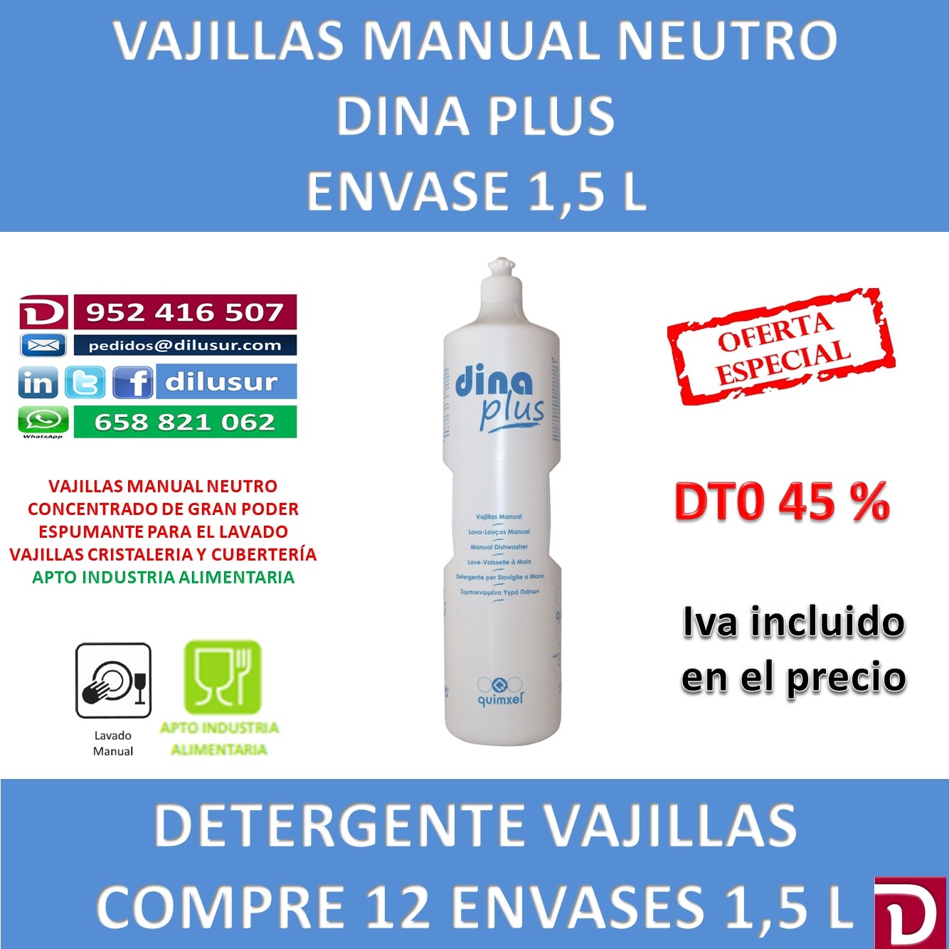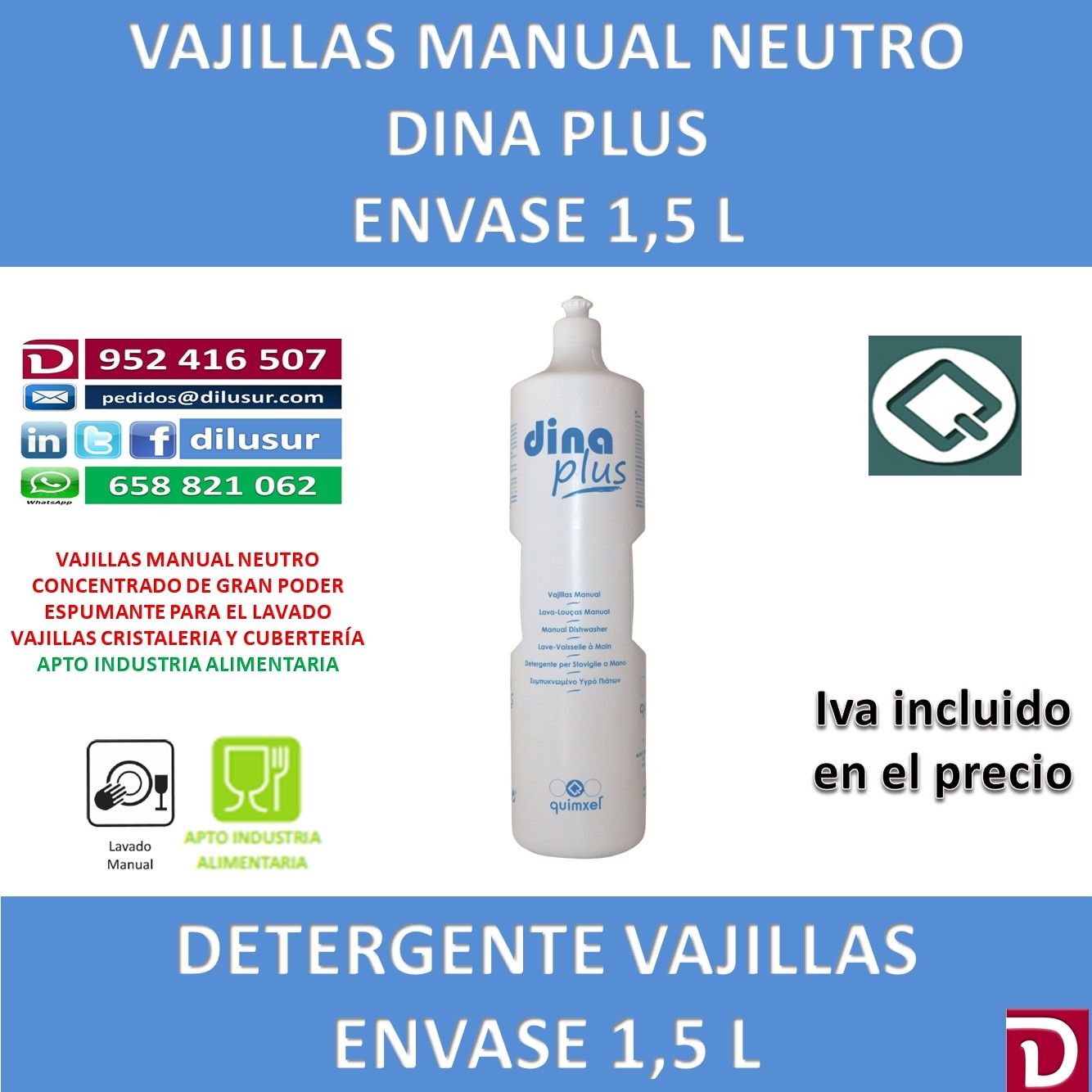 Vajillas manual neutro y concentrado para la limpieza de vajillas, cuberterías y cristalerias, de uso doméstico y profesional. posee un agradable perfume. Envase 1,5 L, Apto industria alimentaria.Iva incluido.