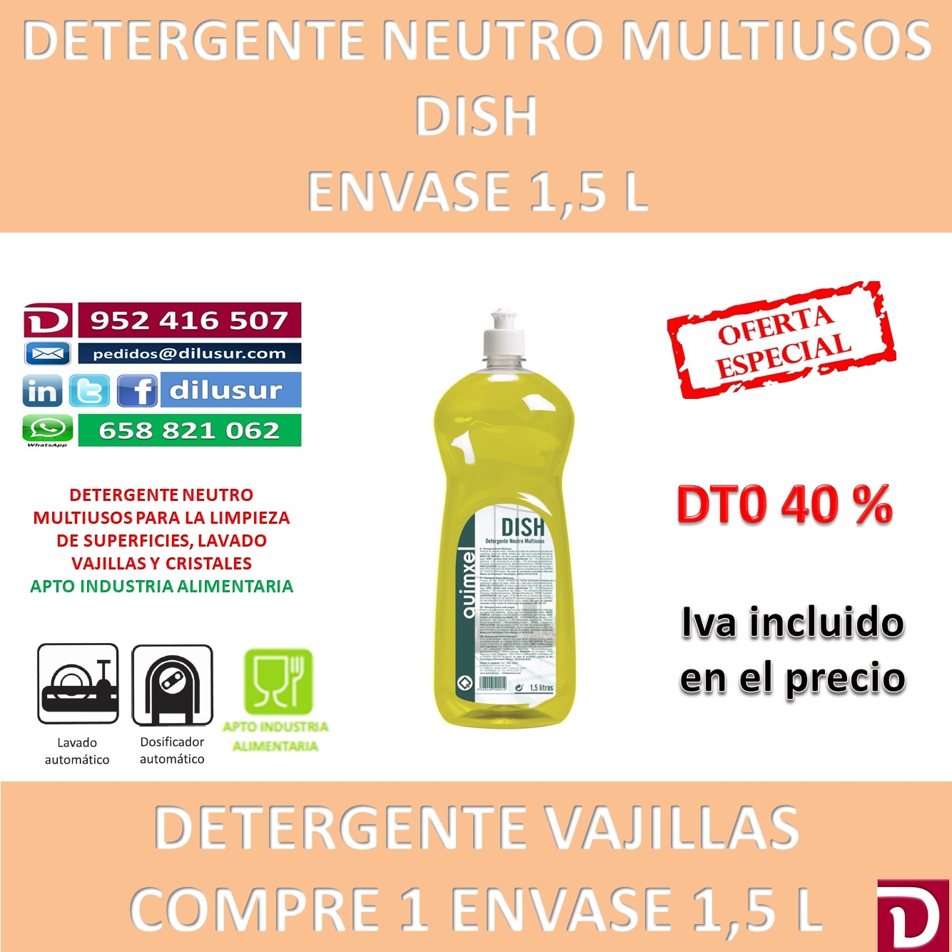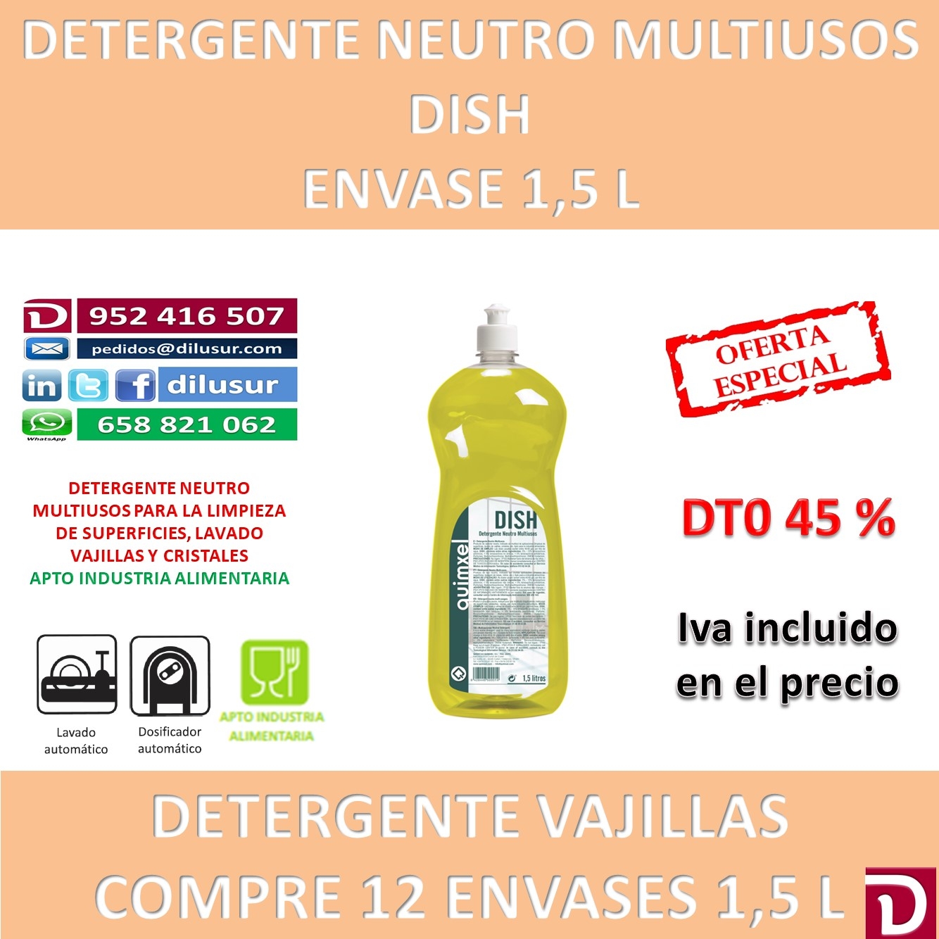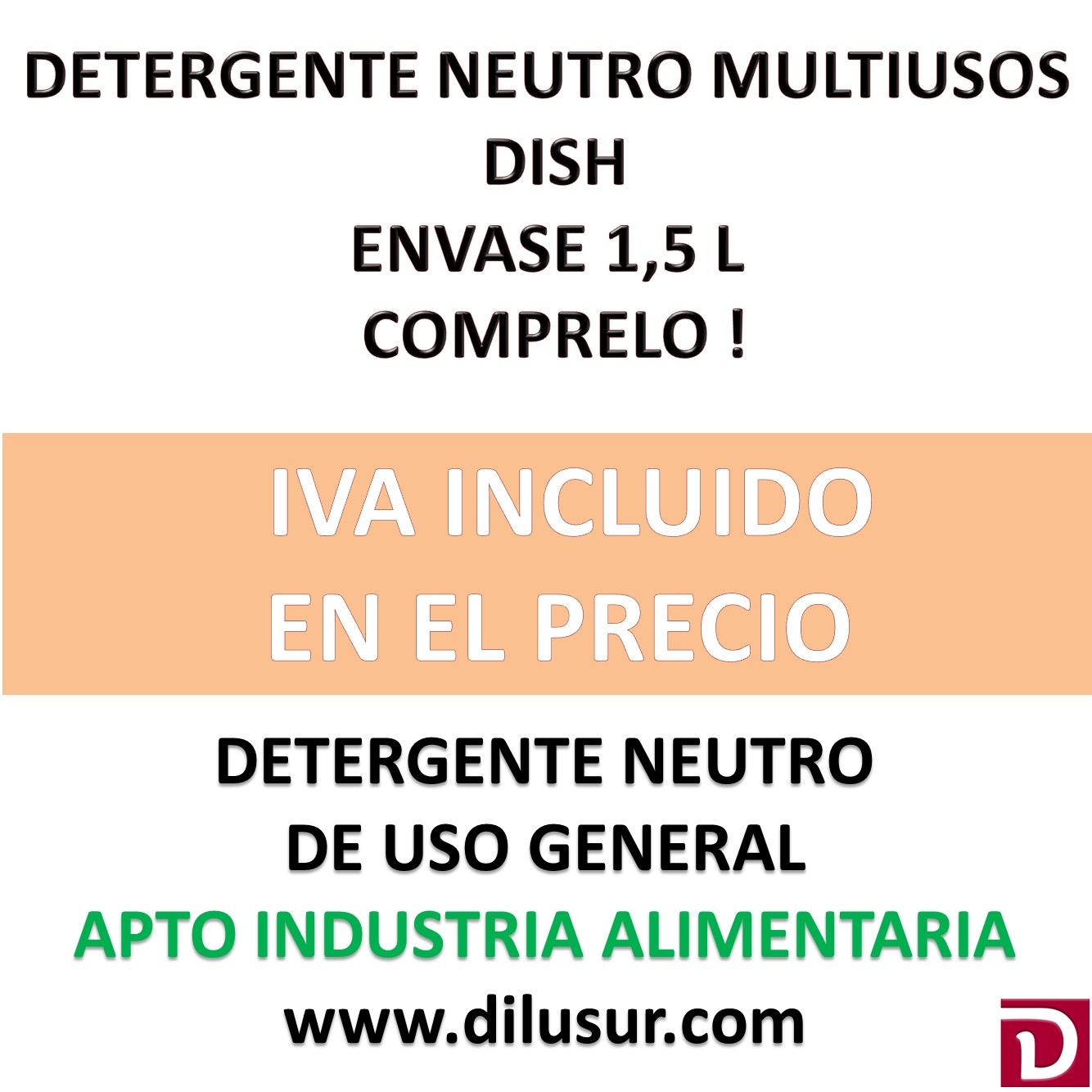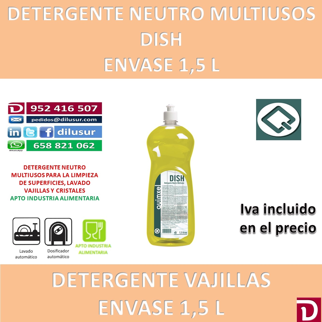 Detergente neutro multiusos, para todo tipo de aplicaciones en superficies, lavado de vajillas, cristales, etc. Apto industria alimentaria. Envase 1.5 L. Iva incluido