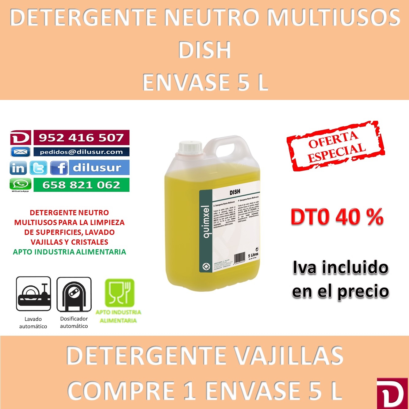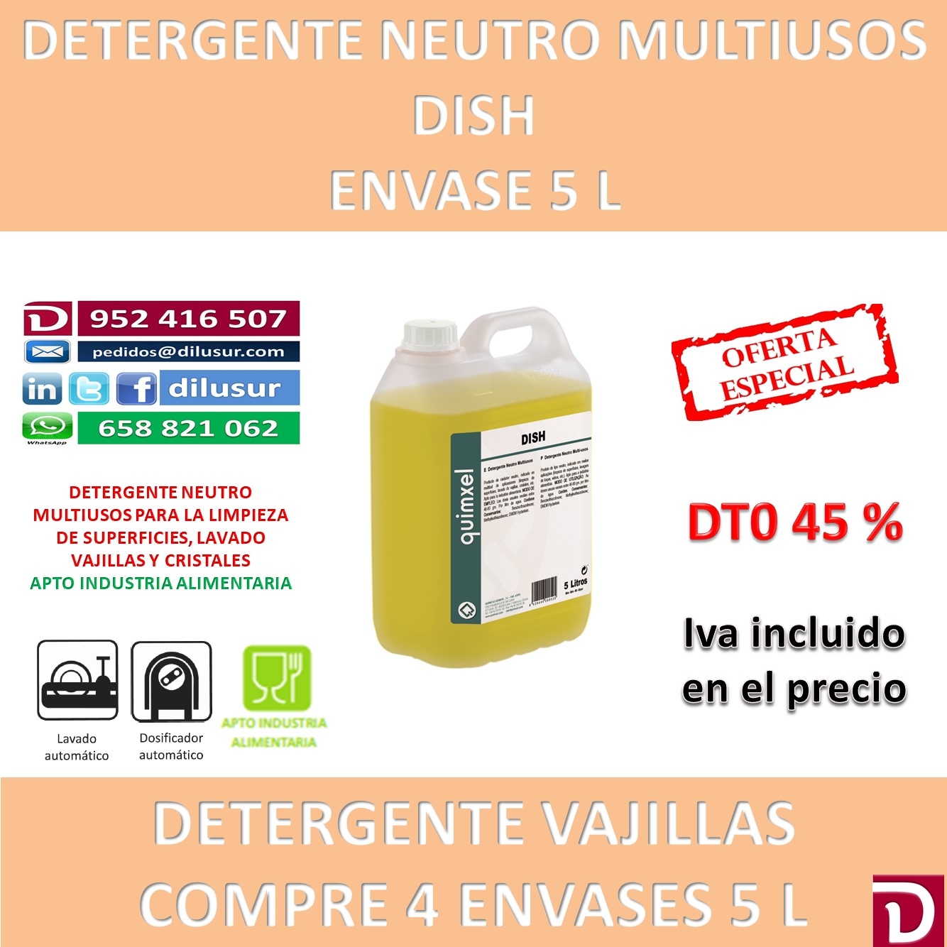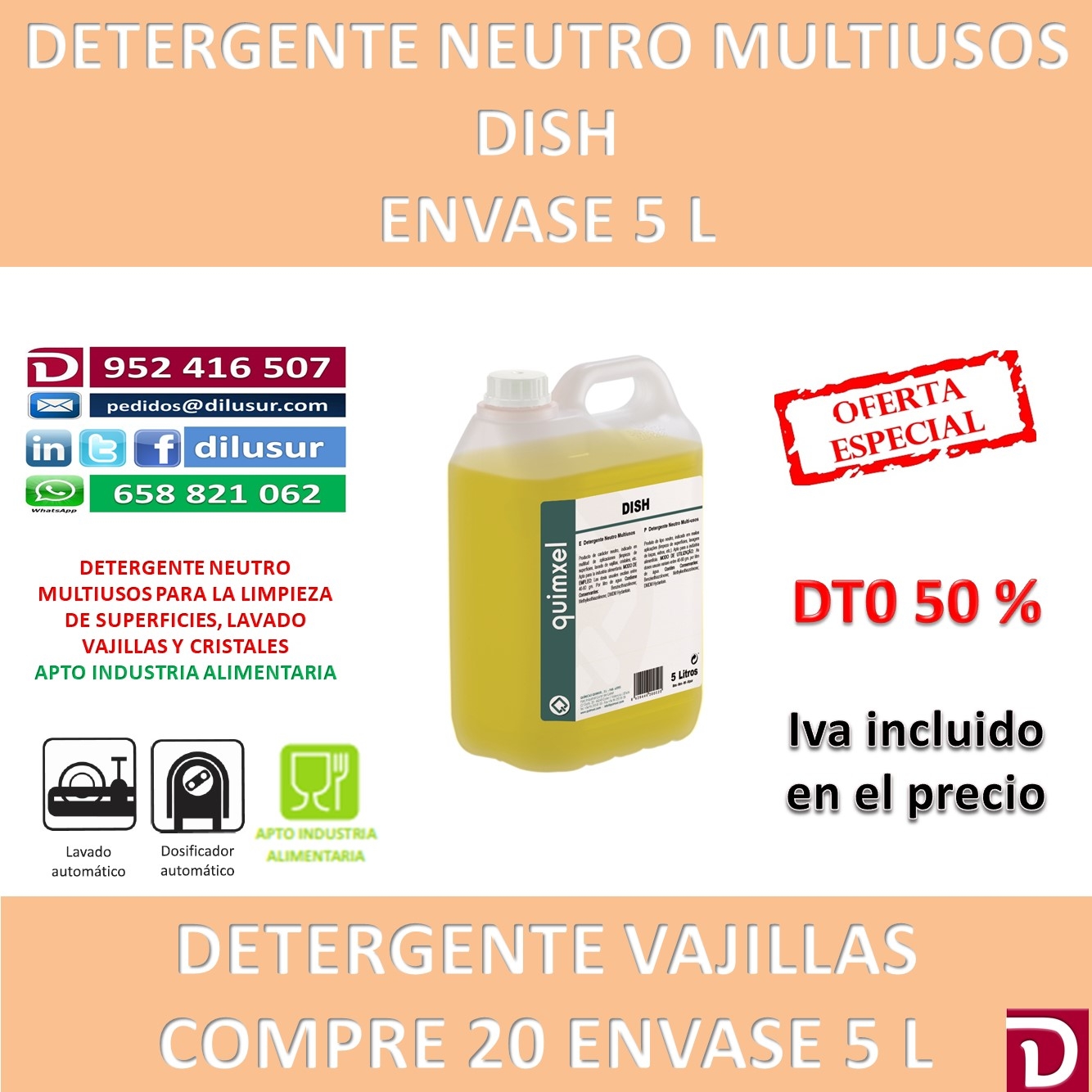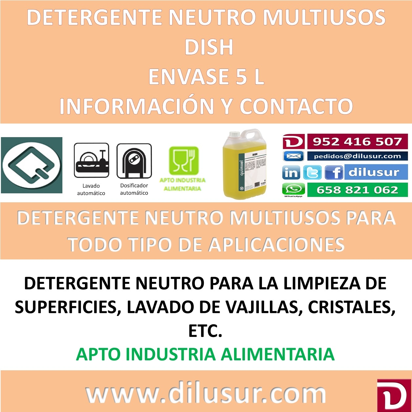 Detergente neutro multiusos, para todo tipo de aplicaciones en superficies, lavado de vajillas, cristales, etc. Apto industria alimentaria. Envase 5 L. Iva incluido