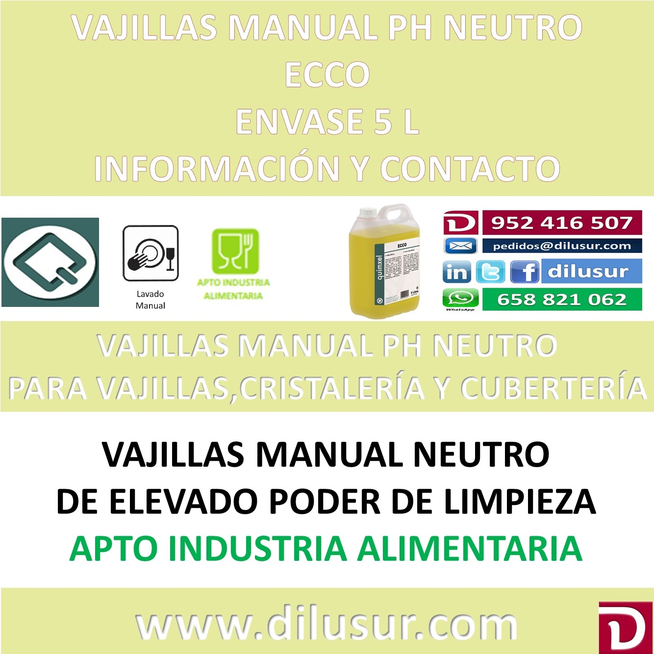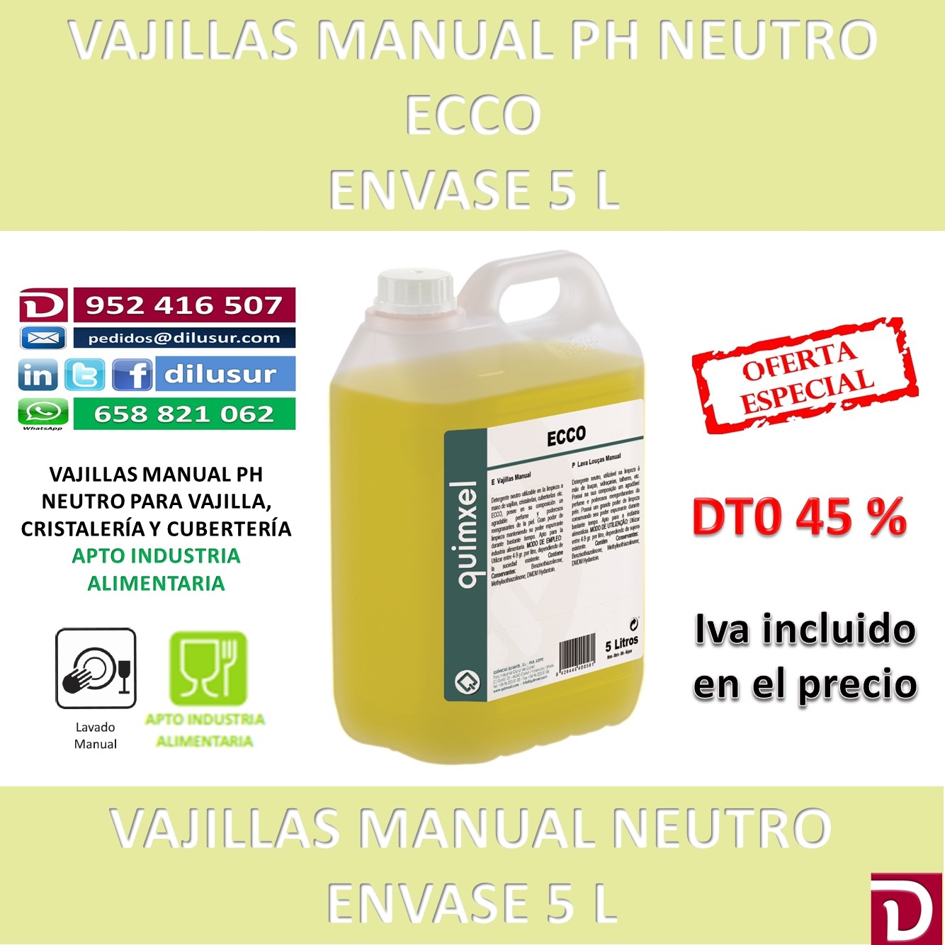 Vajillas manual con ph neutro, para la limpieza de vajillas, cristalería, cubiertos. Posee en su composición tensoactivos que le confieren un elevado poder de limpieza. Envase 5 L. Iva incluido