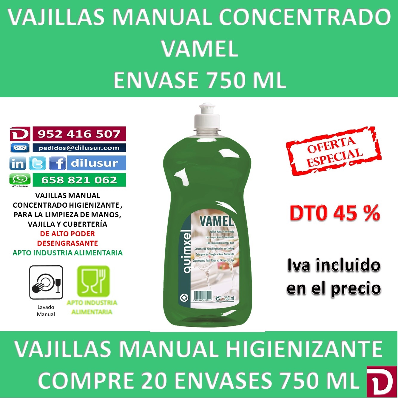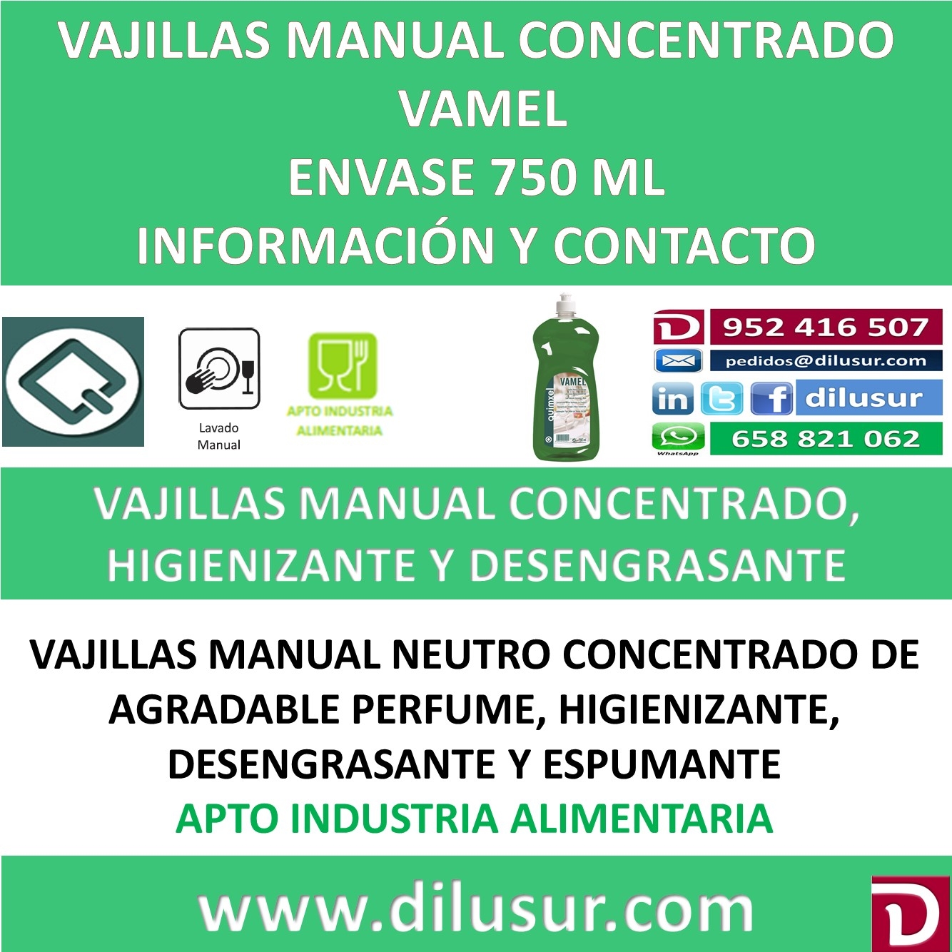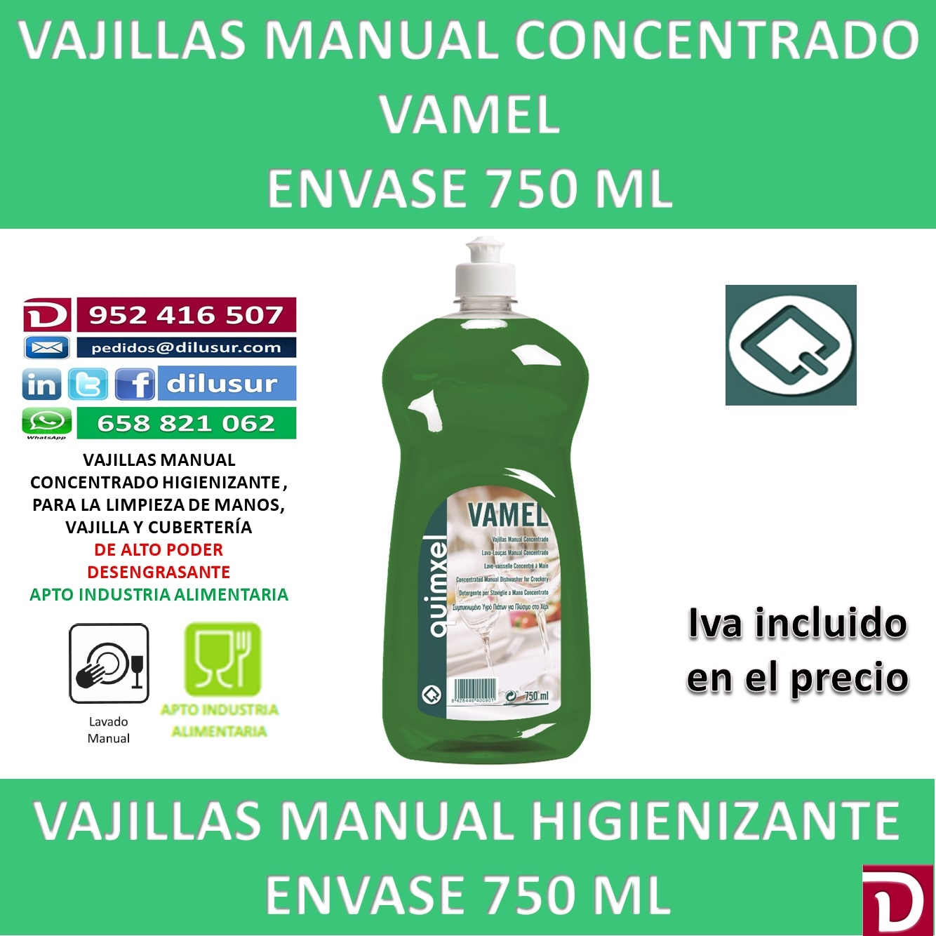 Vajillas manual neutro concentrado higienizante de agradable perfume, para la limpieza de vajillas, cristalería, cuberterías etc. Producto desengrasante de elevado poder de limpiza y espumante. Envase 750 ML. Apto industria alimentaria. IVA incluido