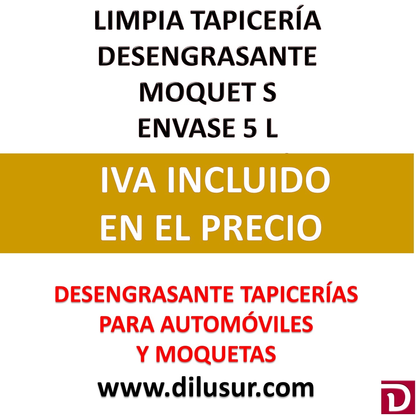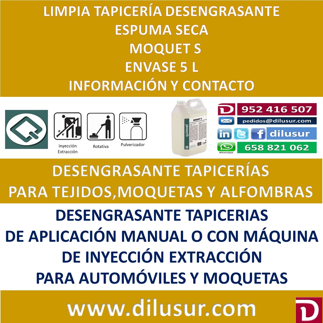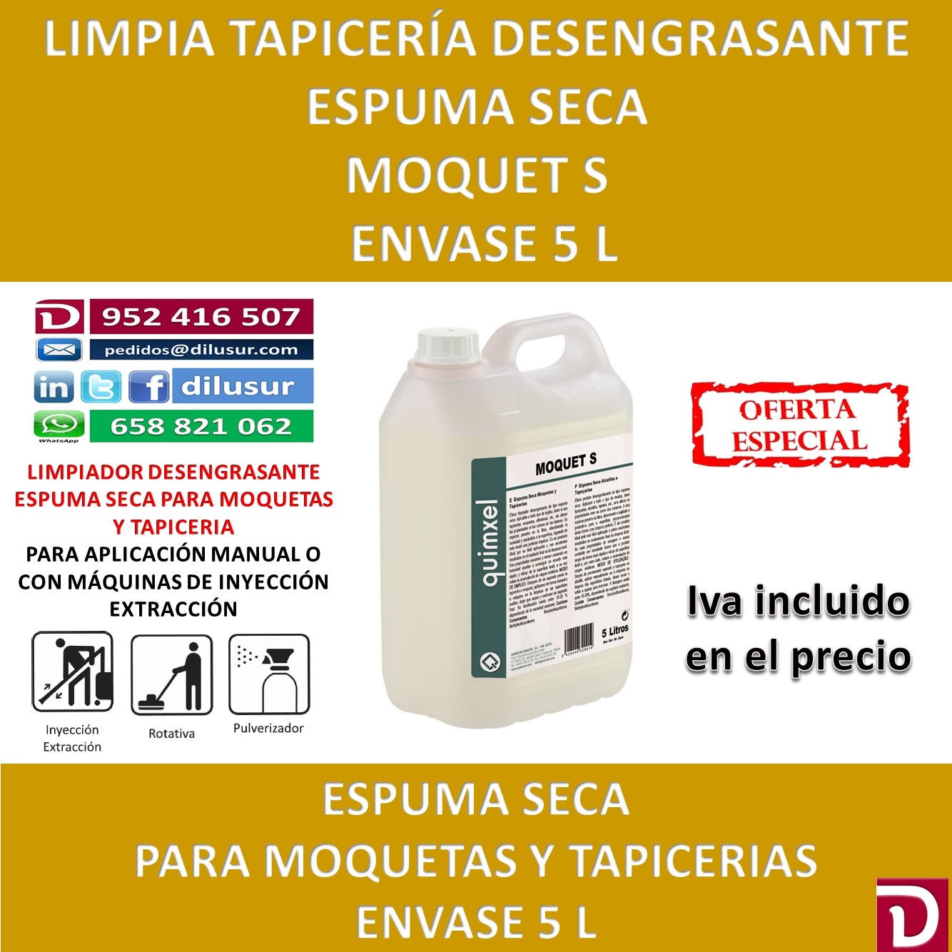 Limpia tapicerias tipo espuma seca desengrasante para moquetas y tapicerias y todo tipo de tejidos, no altera las propiedades ni los colores, de facil aplicación. Envase 5 L, Iva incluido