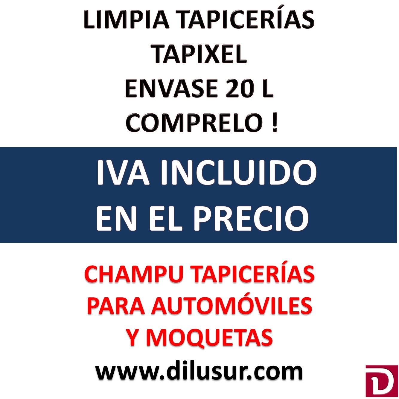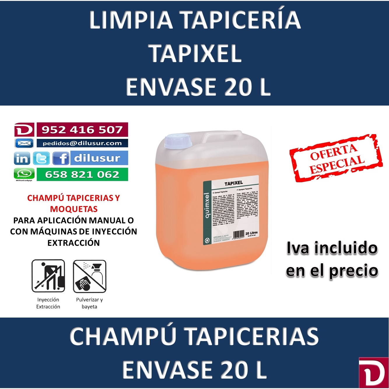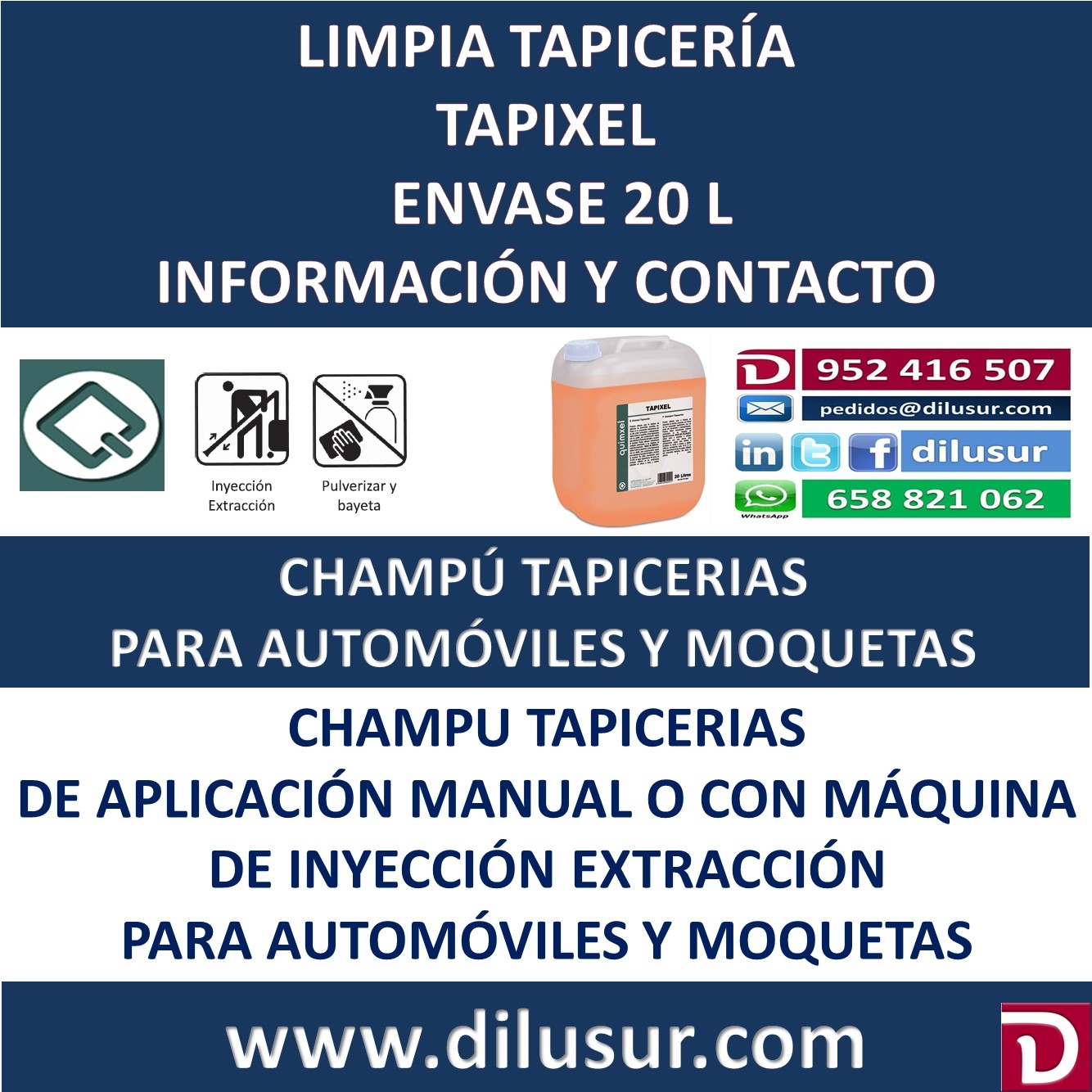 Champú tapicerias, para automóviles, moquetas, etc. Humectante y desengrasante, Aplicar sobre la superficies y frotar con un cepillo, para posteriormente aspirar. De aplicación manual o en máquinas de inyección. Envase 20 L. Iva incluido