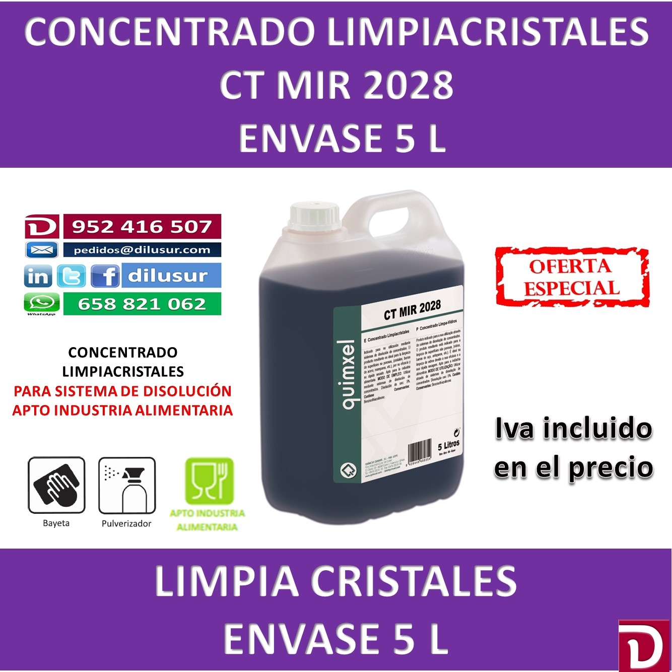 Concentrado limpiacristales, para utilizar mediante sistemas de disolucon, de uso profesional y rápido secado. Apto para la industria alimentaria. Envase 5 L. Iva incluido