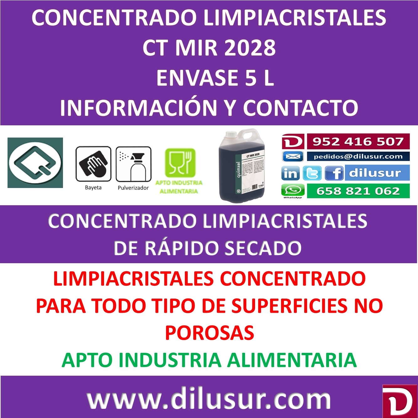 Producto muy adecuado para la limpieza de cristales por su eficacia y rápido secado. Apto para la industria alimentaria.