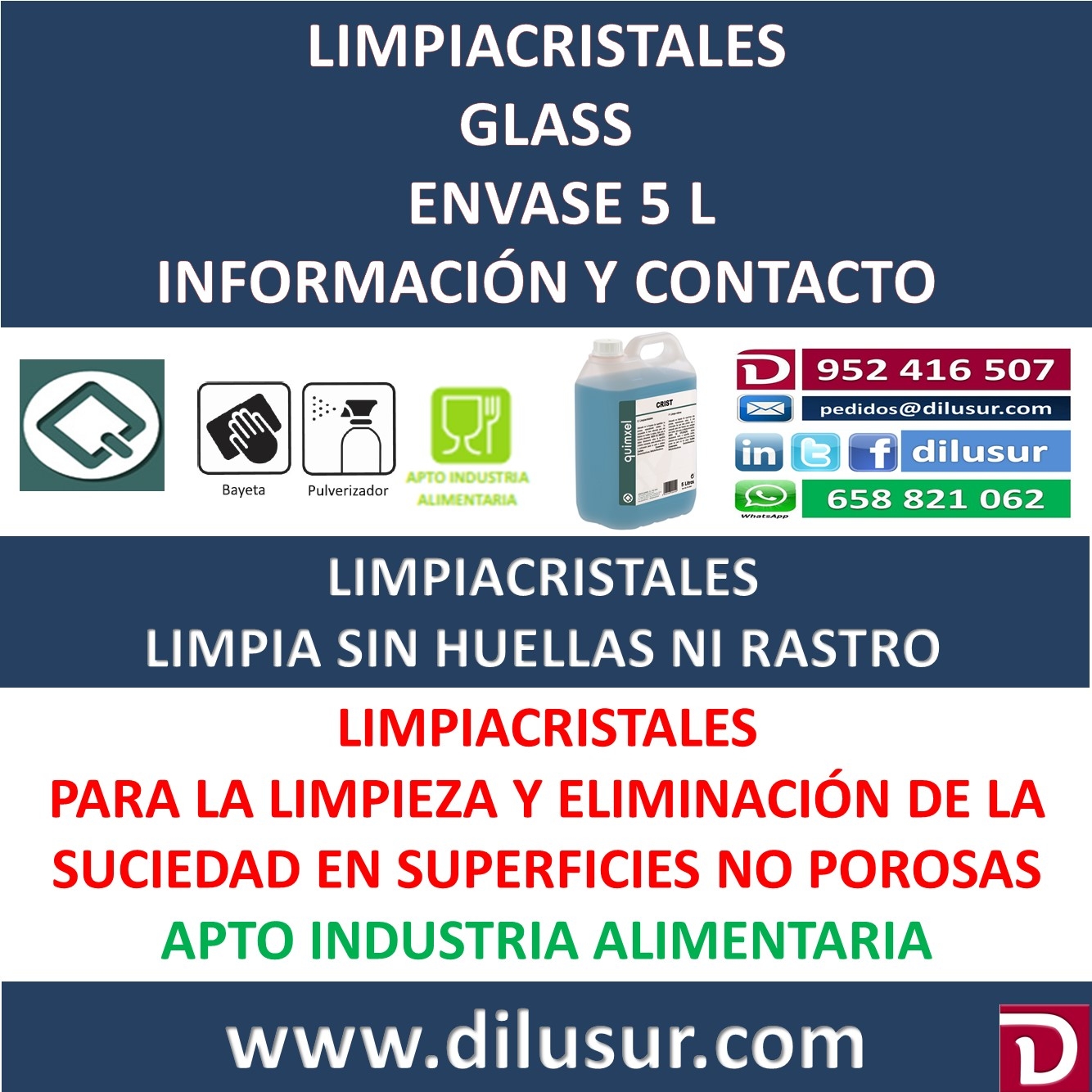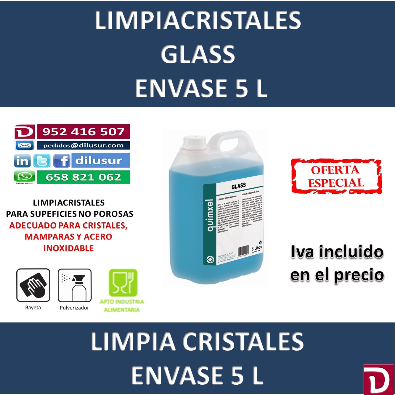 Limpiacristales para la limpieza y eliminación de suciedad en superficies no porosas. ( cristales, mamparas de acero,etc). De efecto anti vaho, no deja rastros ni velos. Apto industria alimentaria. Envase 5 L. Iva incluido.