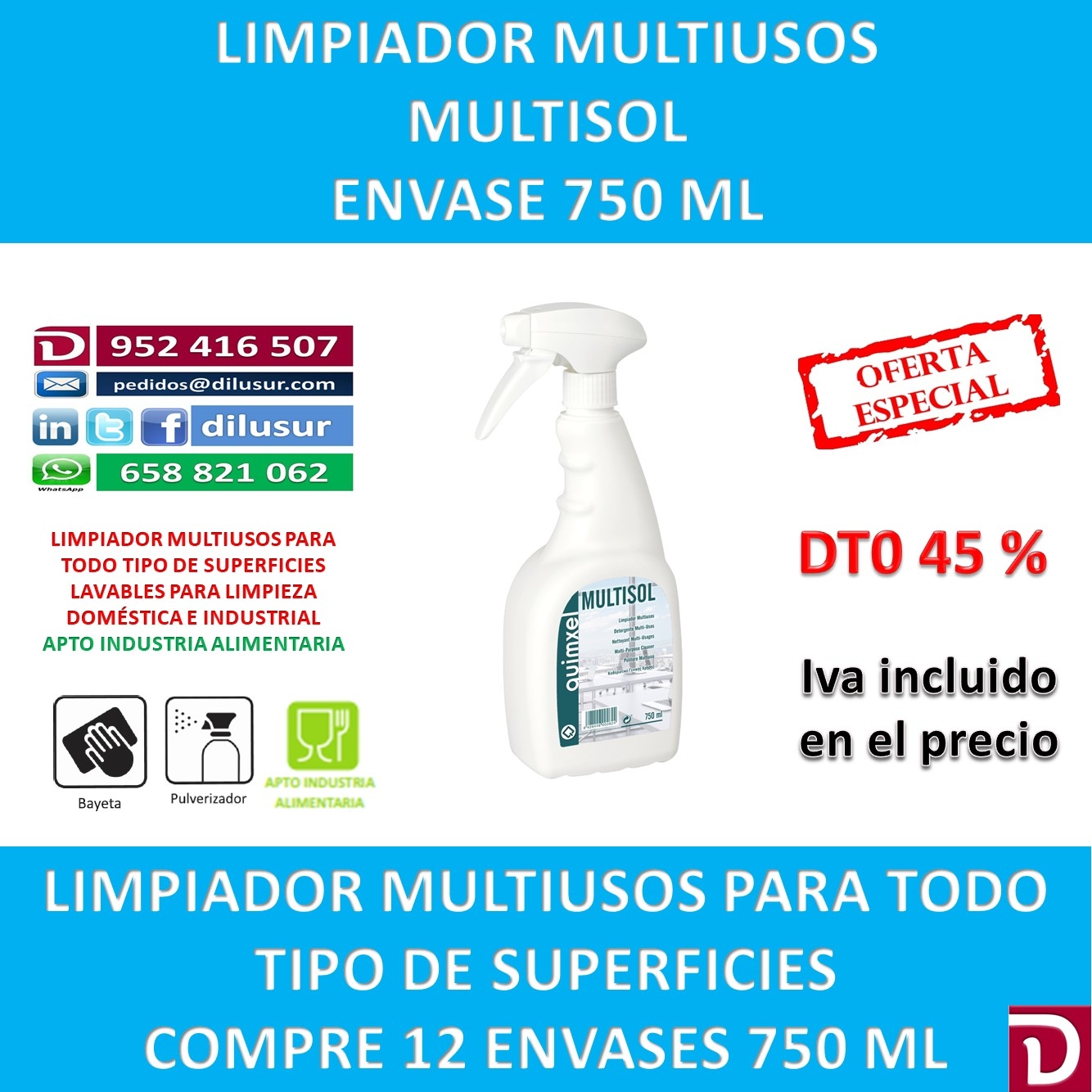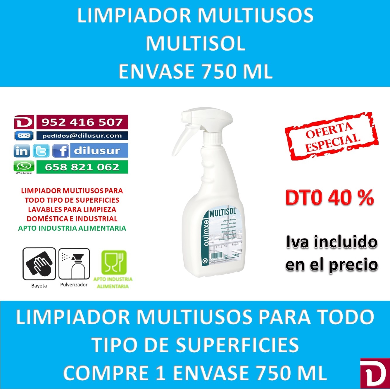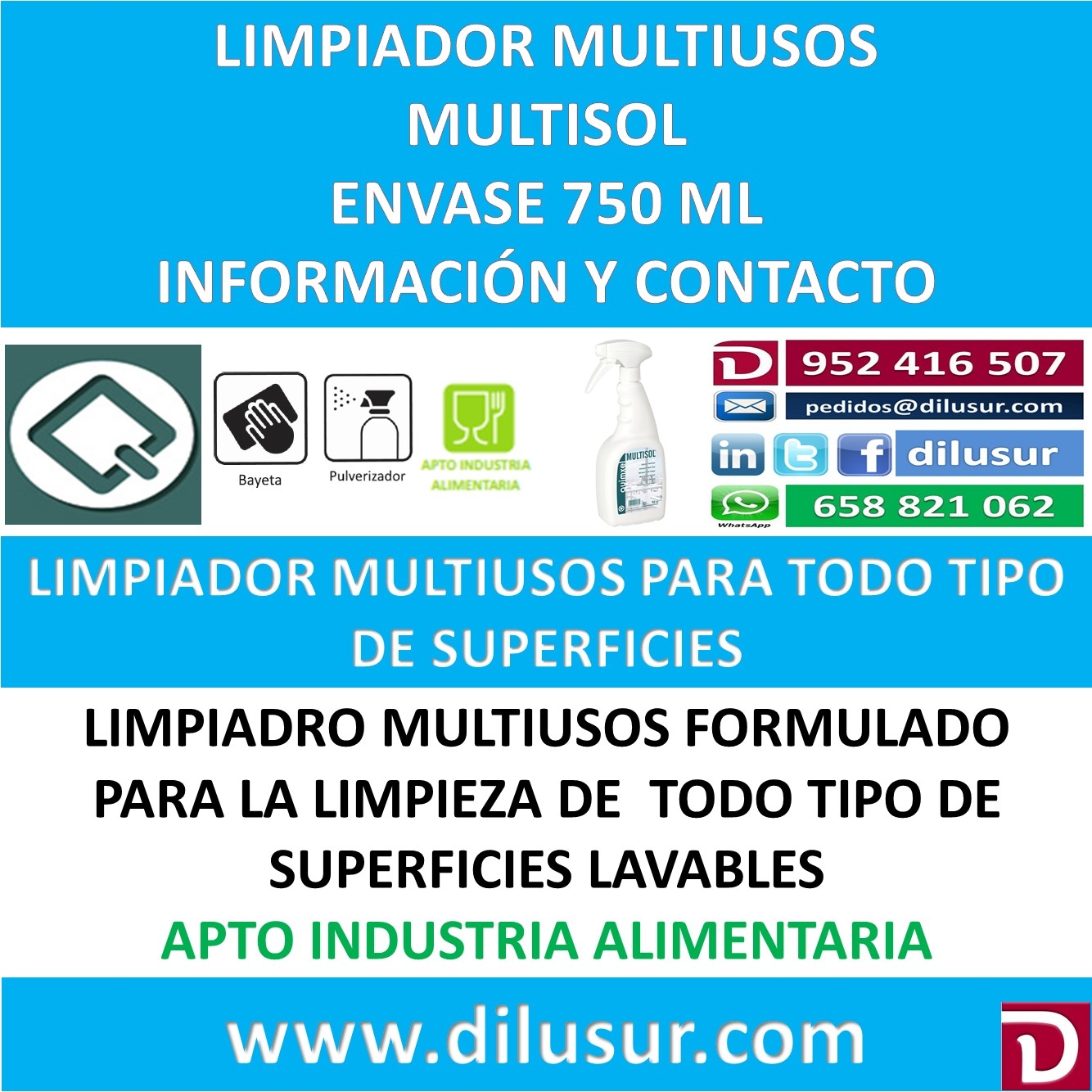 Limpiador multiusos para todo tipo de superficies lavables, apto para todo tipo de limpieza tanto a nivel doméstico como industrial. De gran poder limpiador, Apto para la industria alimentaria. Envase 750 ML
