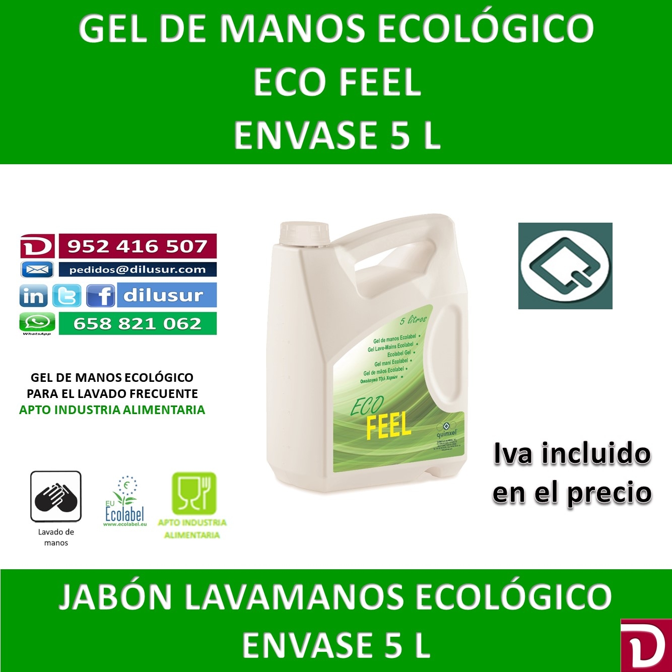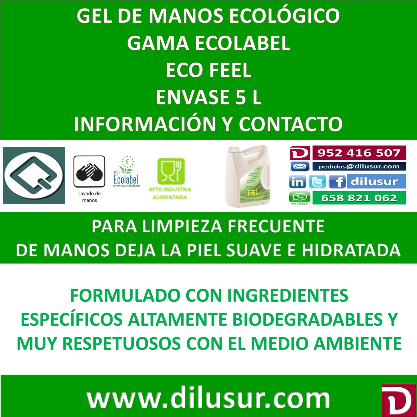 Gel de manos ecológico para la limpieza de manos y de uso frecuente, deja la piel suave y perfectamente hidratada, sin alérgenos. Envase 5 L, Iva incluido.