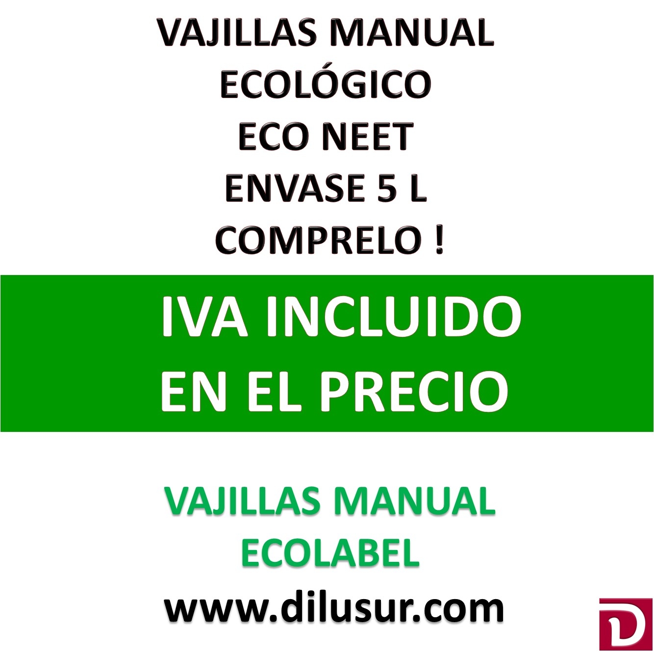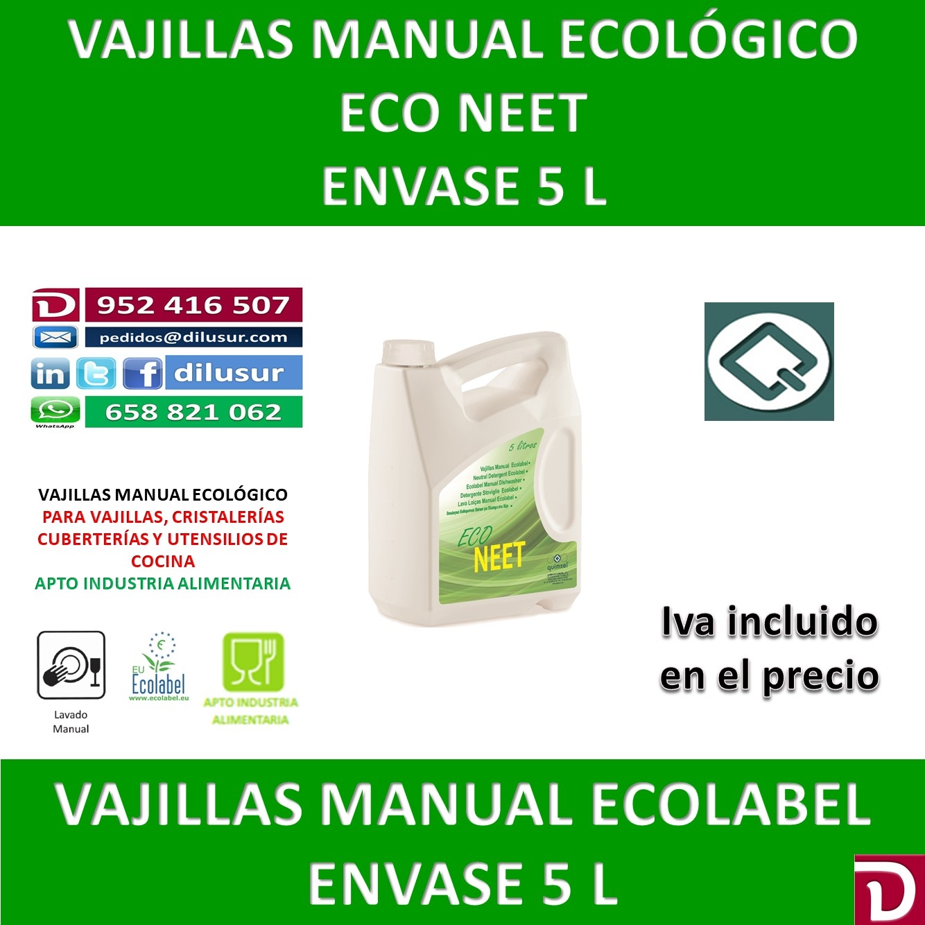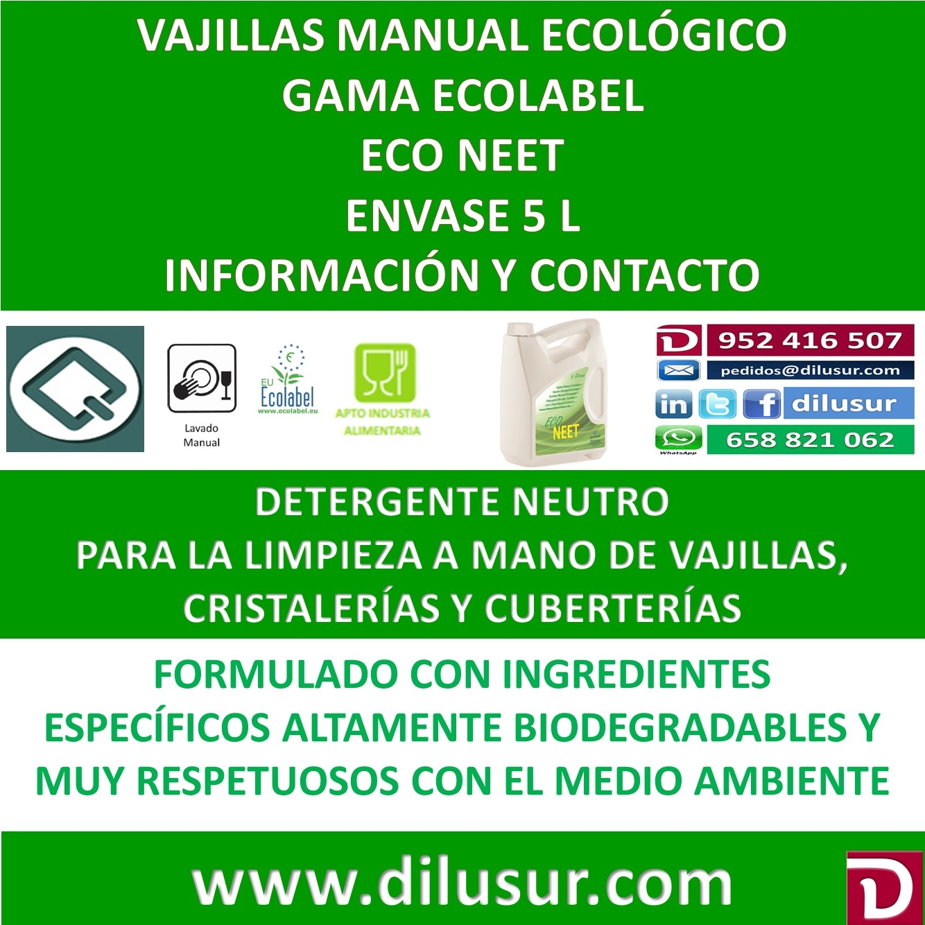 Vajillas manual ecológico, para cristalerías , cuberterías, vajillas y utensilios de cocina, de gran poder de limpieza y capacidad espumante. Apto para uso alimentario. Envase 5 L. Iva incluido.