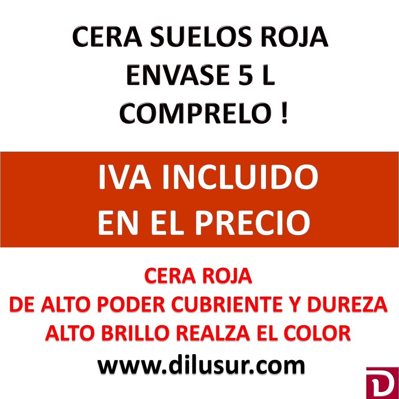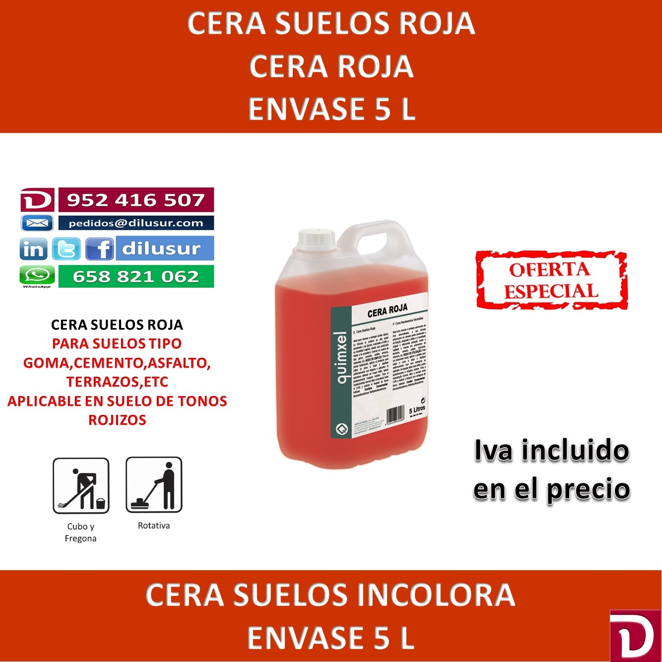 Cera suelos roja de elevado poder cubriente y dureza, autobrillant y autoabrillantable para suelos tipo goma, cemento, asfalto,terrazo y mármoles. De alto poder penetrante y fijación, Reaalza el color. para suelos rojizos. Envase 5L. Iva incluido.
